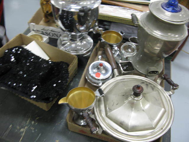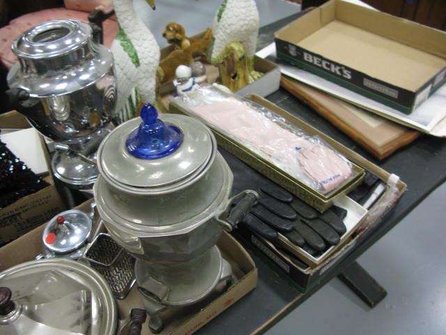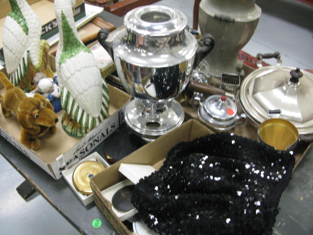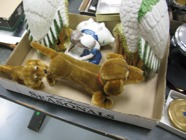 Group lot to include three compacts, two Steiff dogs one with ear tag, two Majolica of birds, coffee pots, plate, sequined piece, along with group of prints