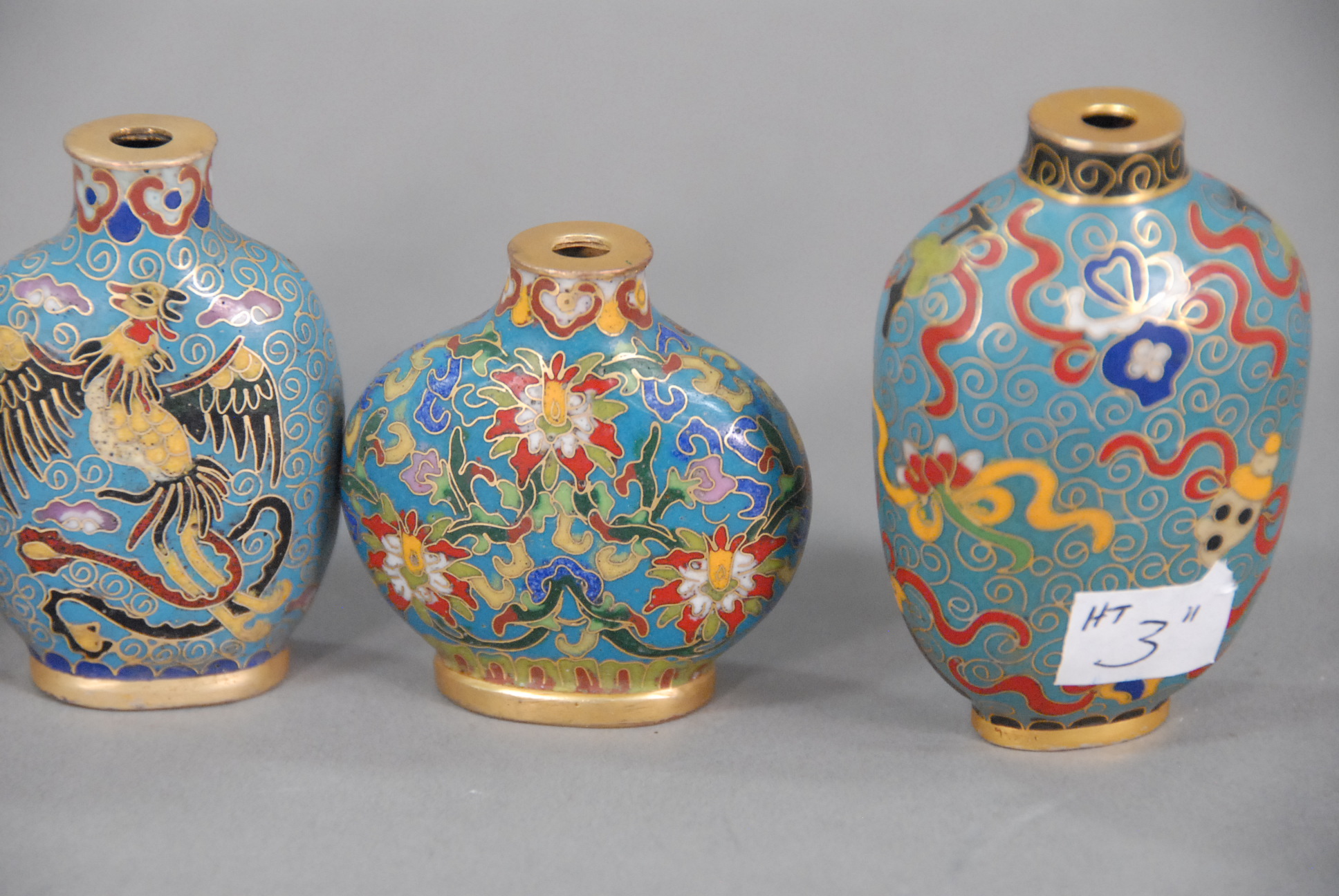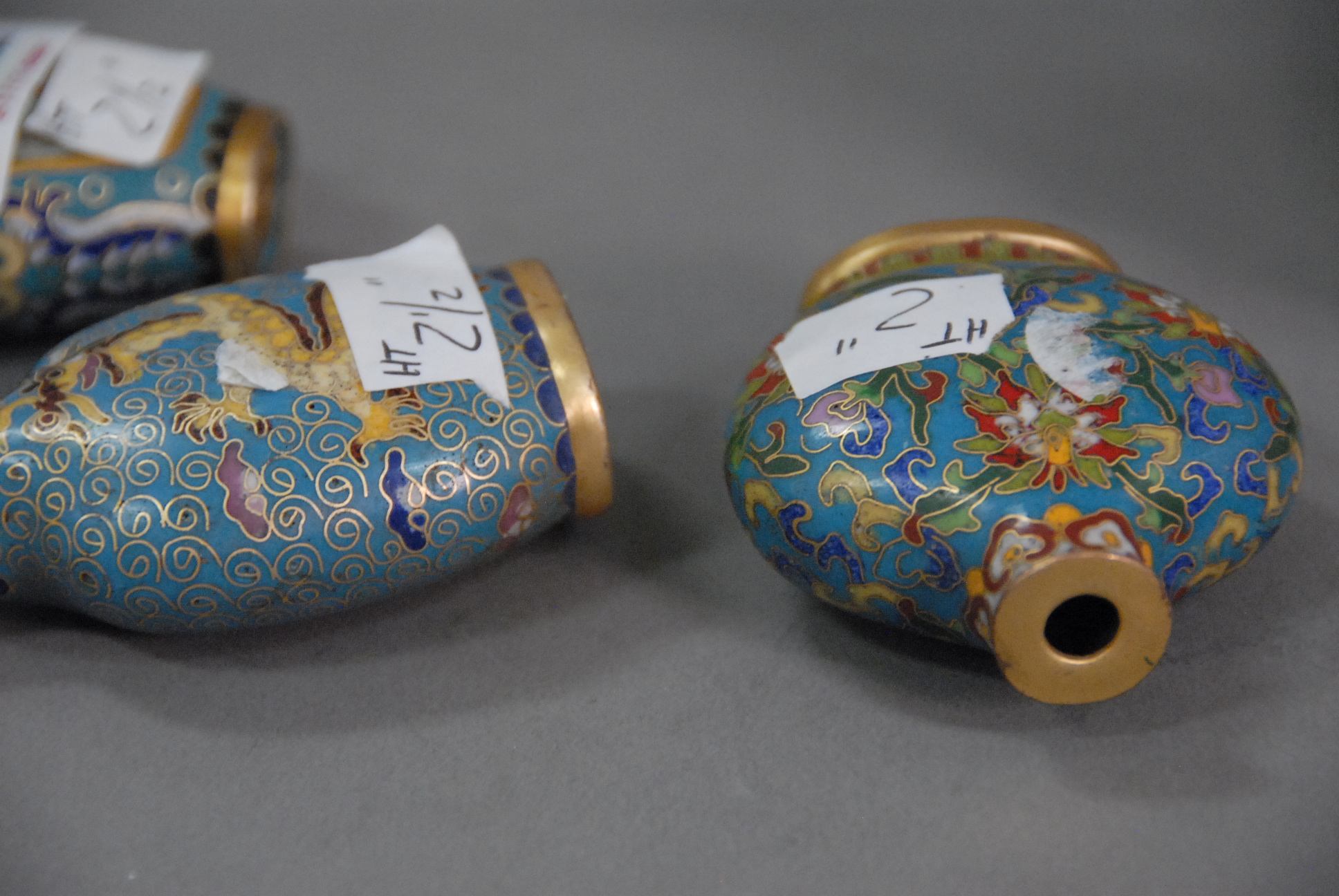Group of four cloisonn snuff bottles two with character marks on the bottom.