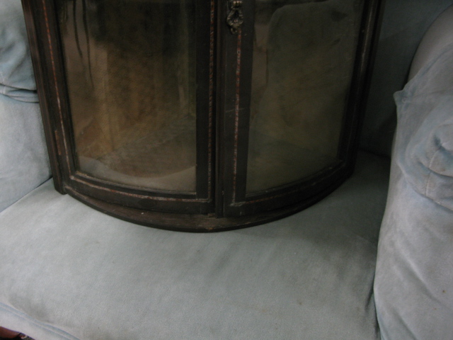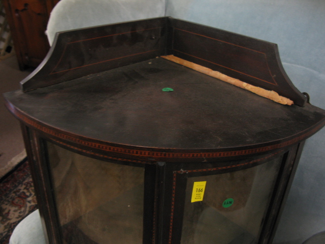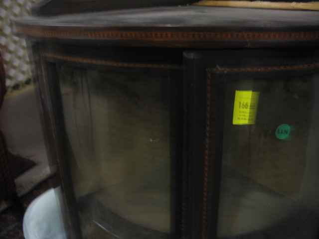 Inlaid mahogany hanging curio cabinet with bowed glass doors.