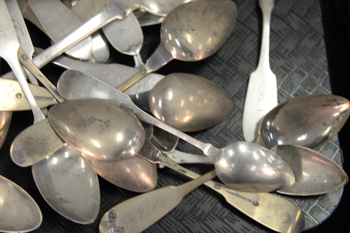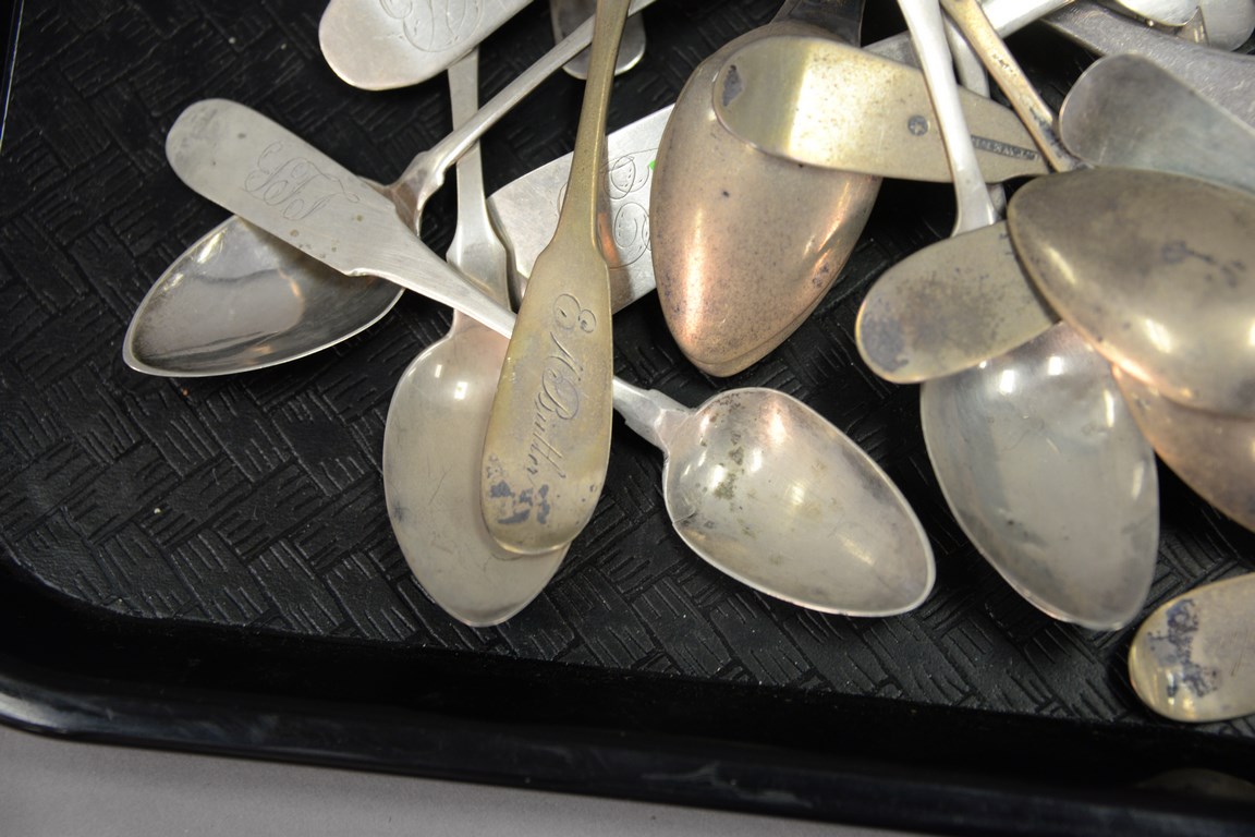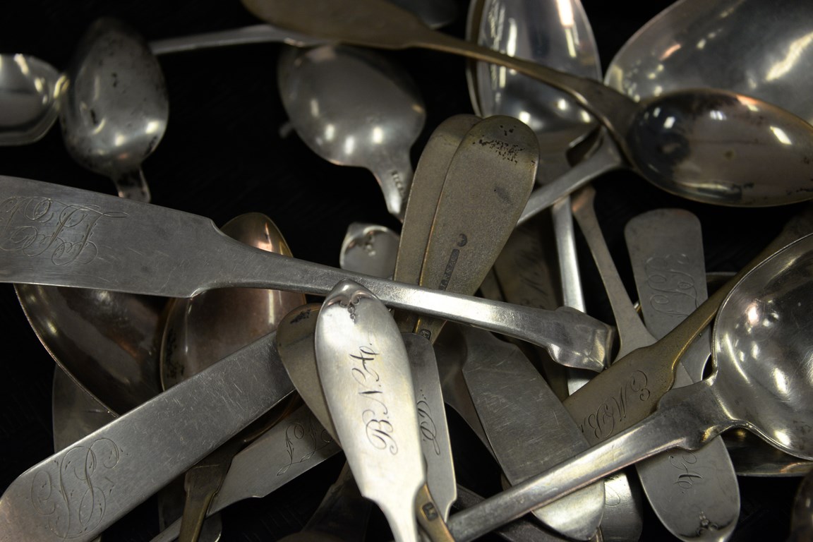 Large group of coin silver spoons, tablespoons, and serving spoons. 18.7 t oz.