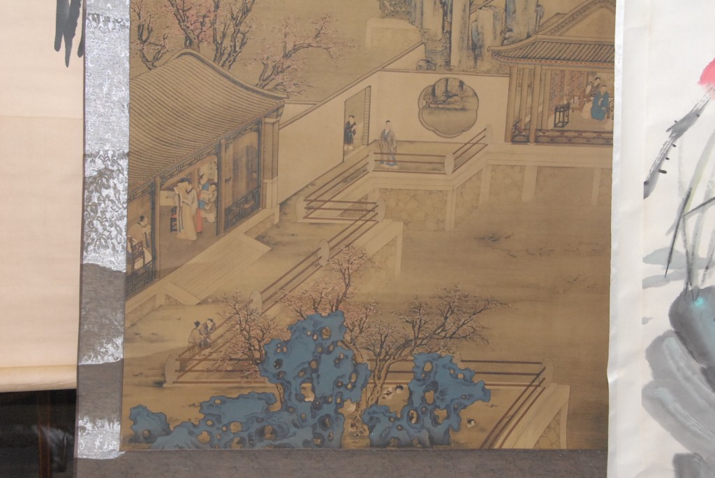 Oriental scroll watercolor on silk landscape courtyard scenes, blossoming flowers, and mountains in background.