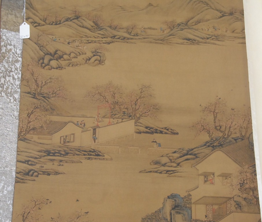Lot 166: Oriental scroll watercolor on silk landscape courtyard scenes, blossoming flowers, and mountains in background.