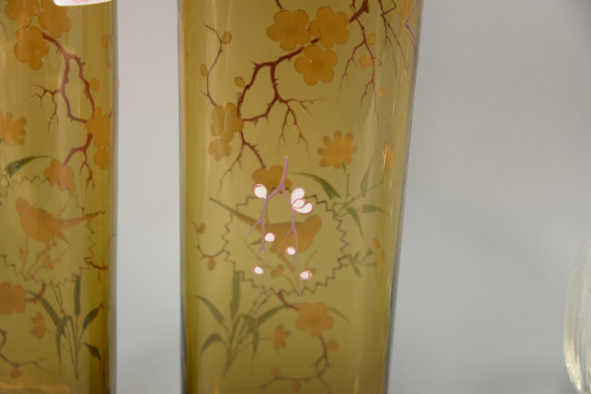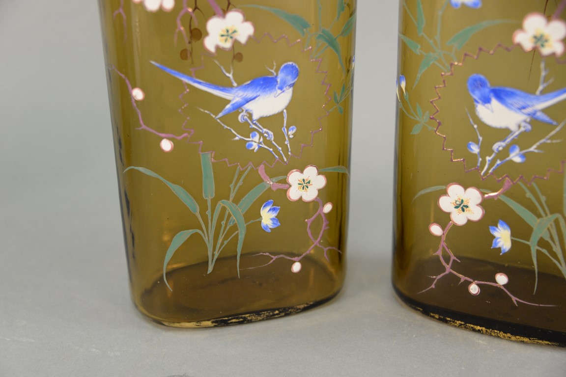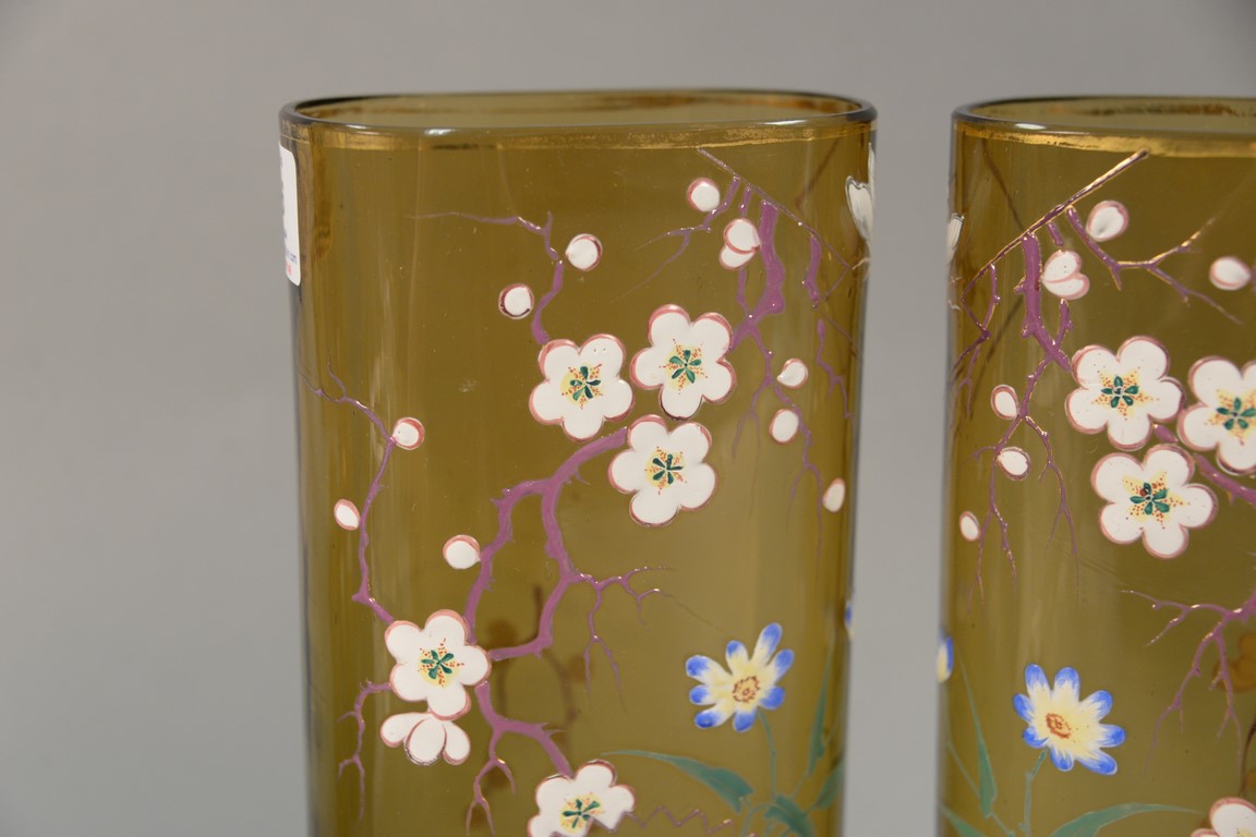 Lot 166: Pair of Moser amber art glass enameled vases, having enamel flower trees, birds, and fly. ht. 11in.