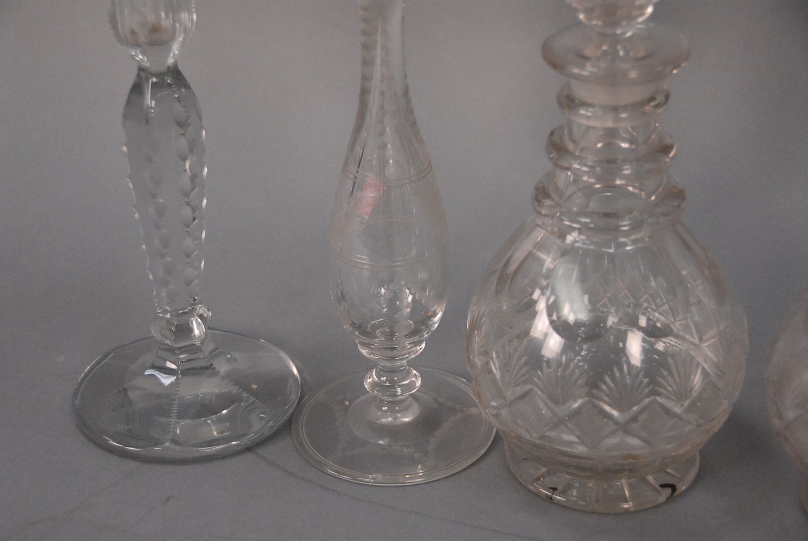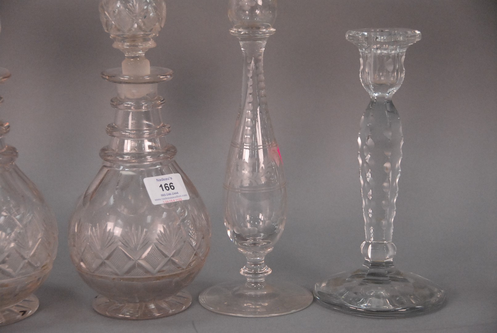 Lot 166: Six crystal pieces to include two pairs of crystal candlesticks and a pair of cut glass decanters.