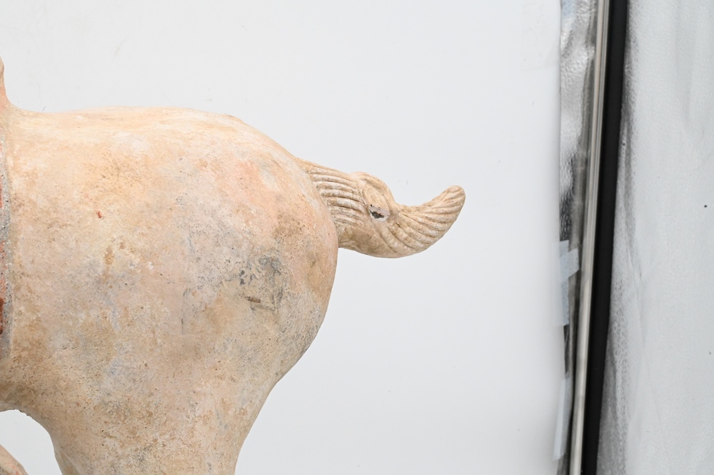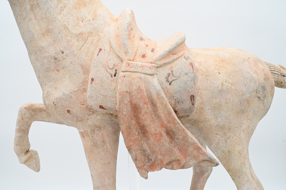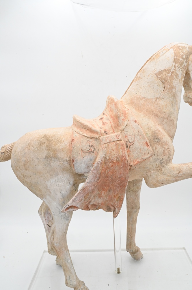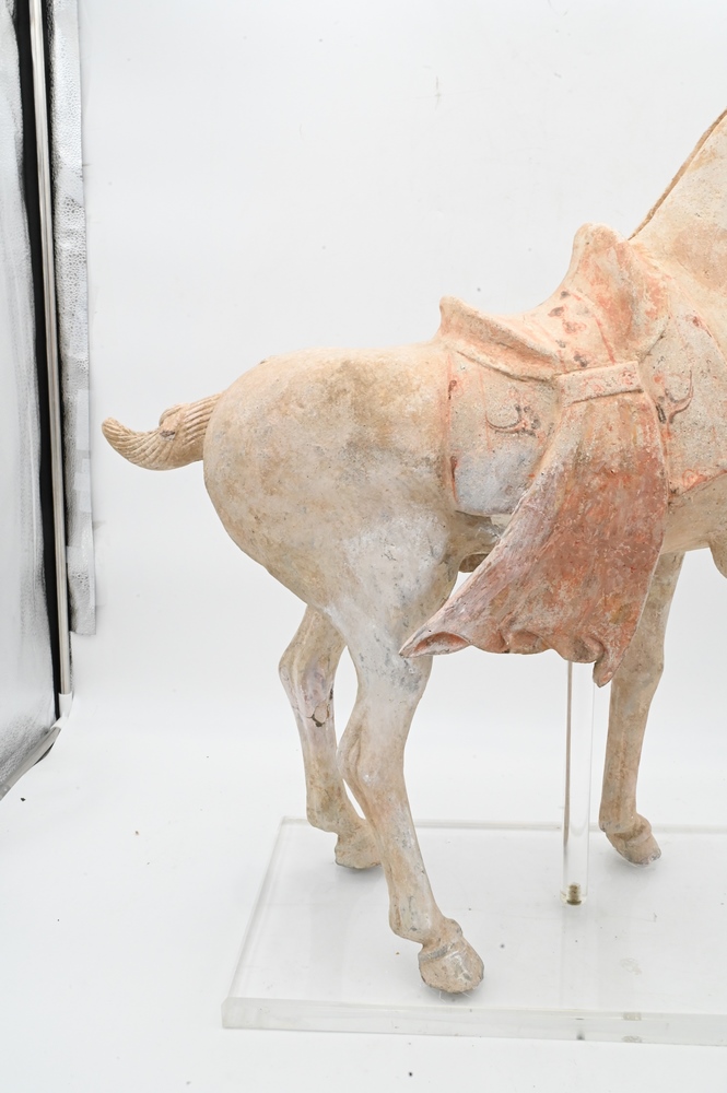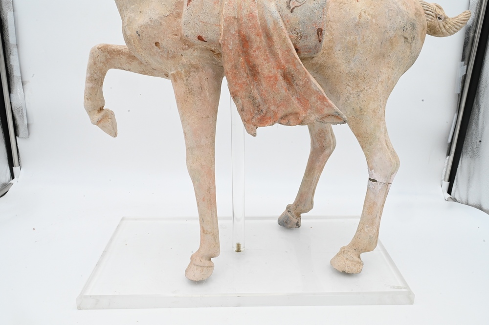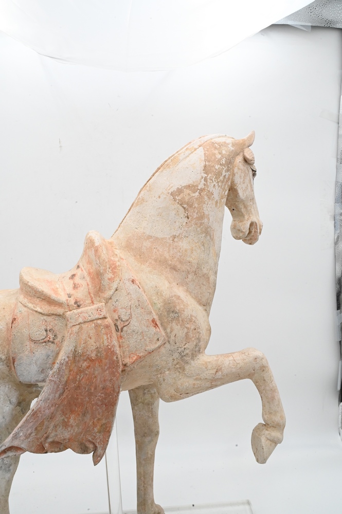 Lot 166: Tang Dynasty Horse Figure, having remnants of paint on plexiglass platform stand, (repairs), height 24 1/2 inches, length 23 inches, (repairs).