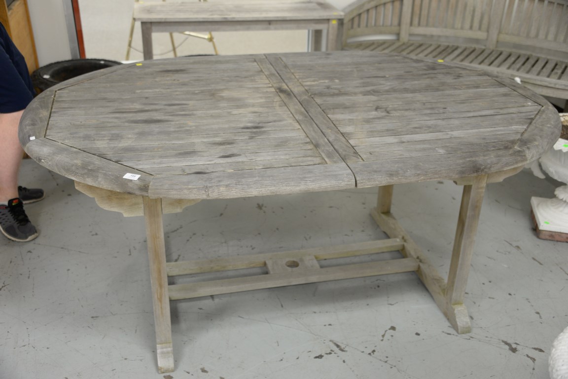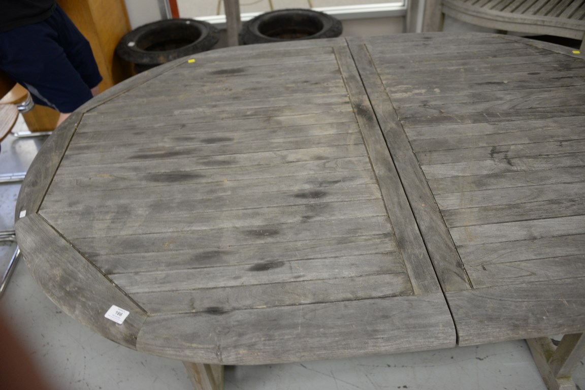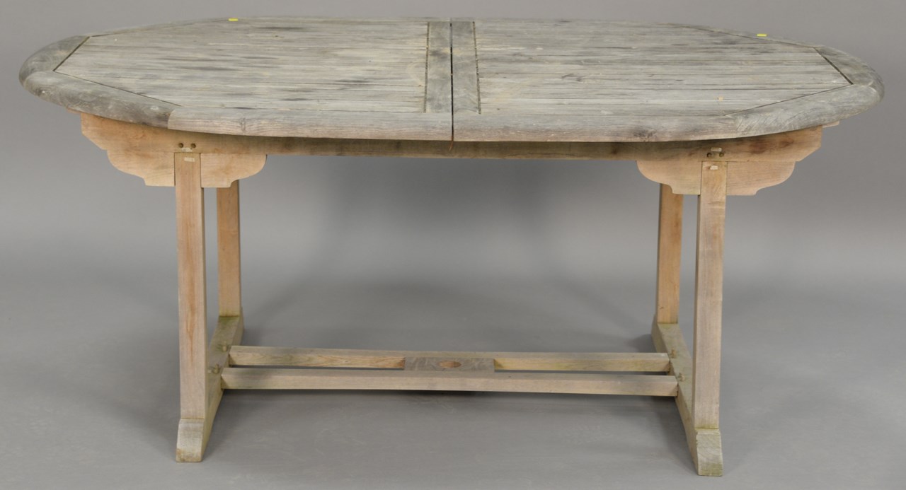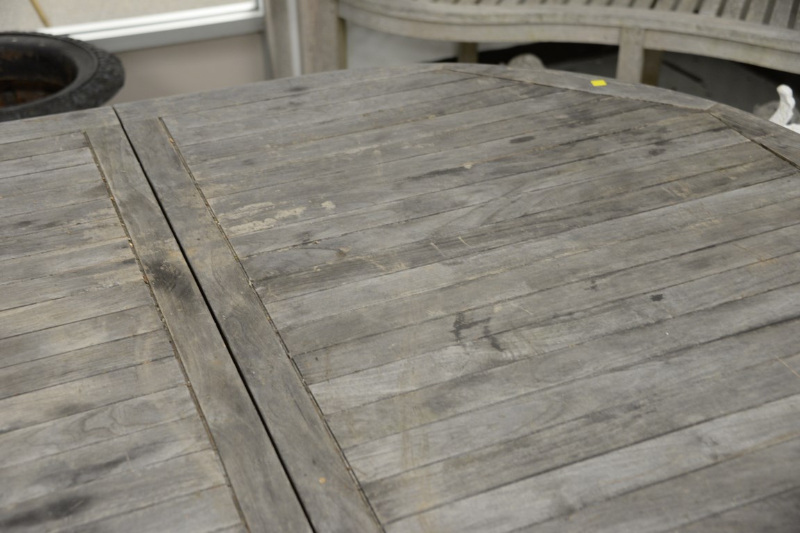 Teak dining table with built in leaf. top: 47 x 70 opens to 94 in.