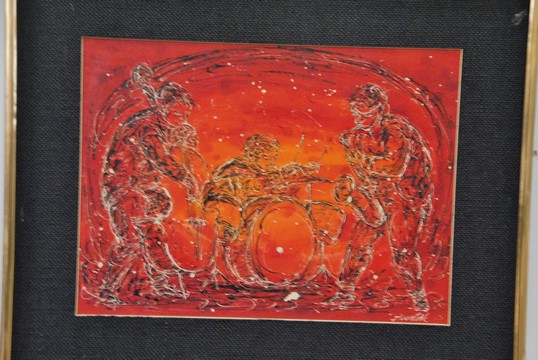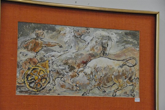 Lot 166: Three Charles Edward Burdick 1924 mixed media on paper including Musicians 10 x 14, Chariot 9 x 17, and Men on Horses 9 x 21,…