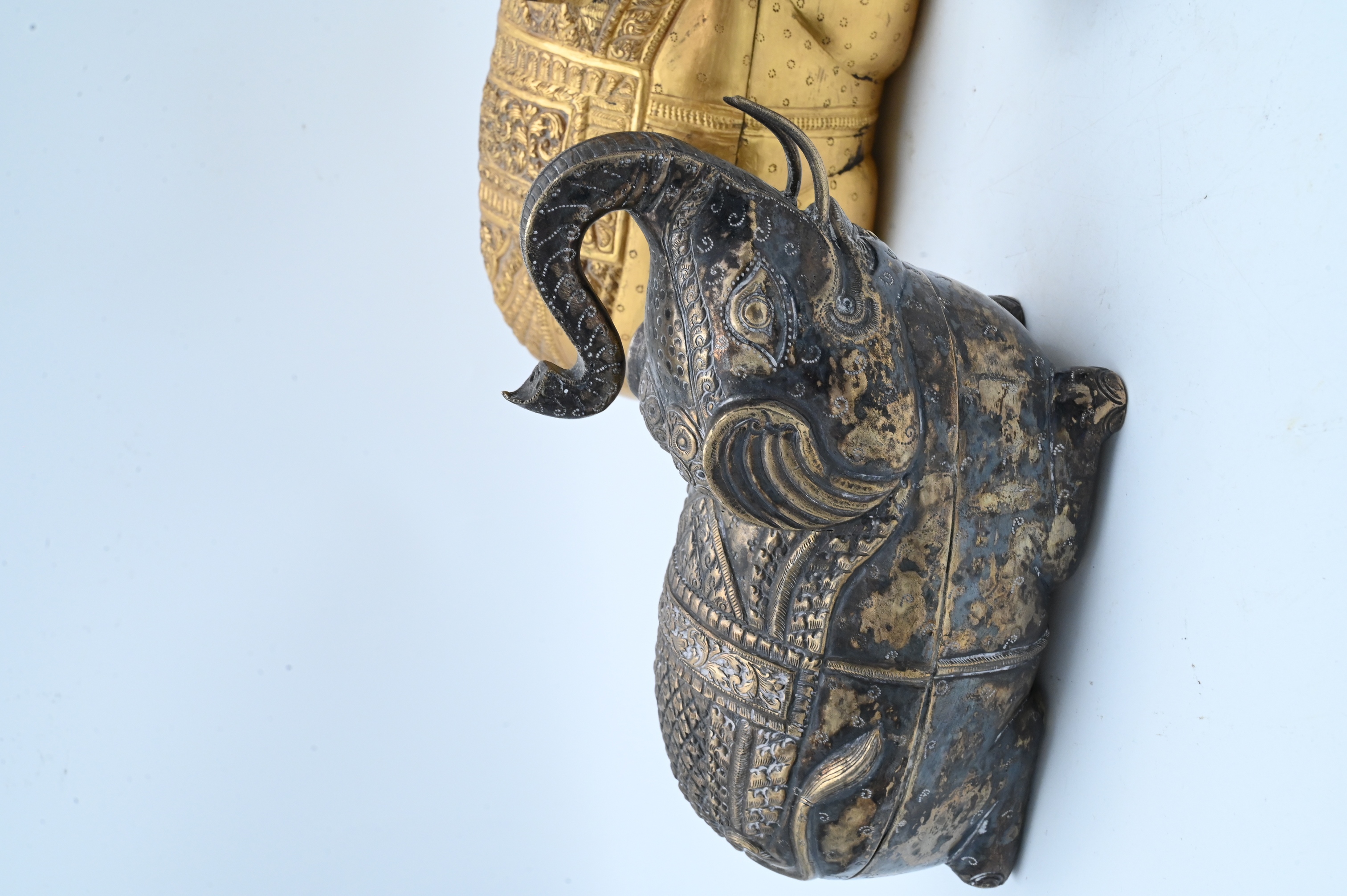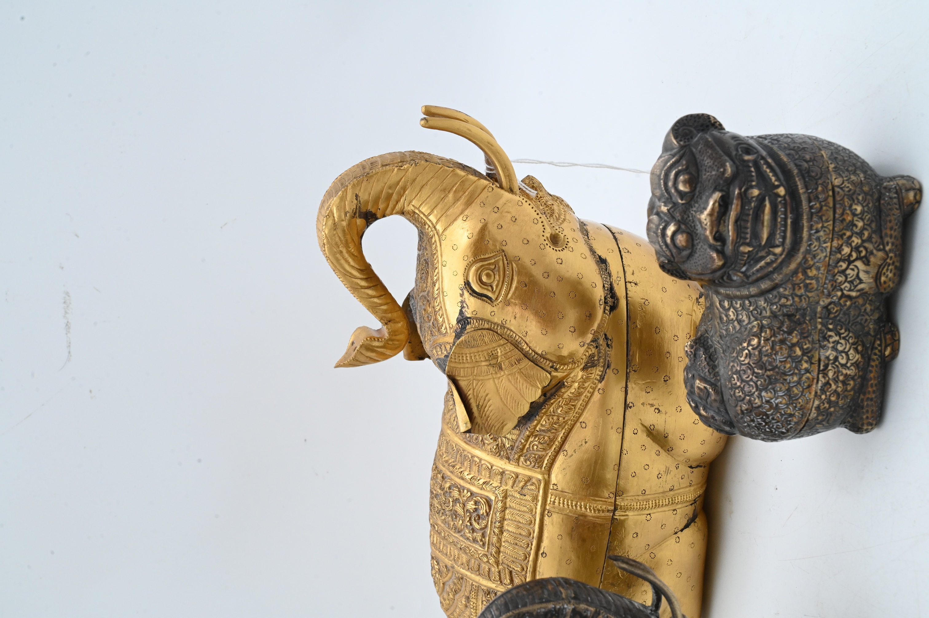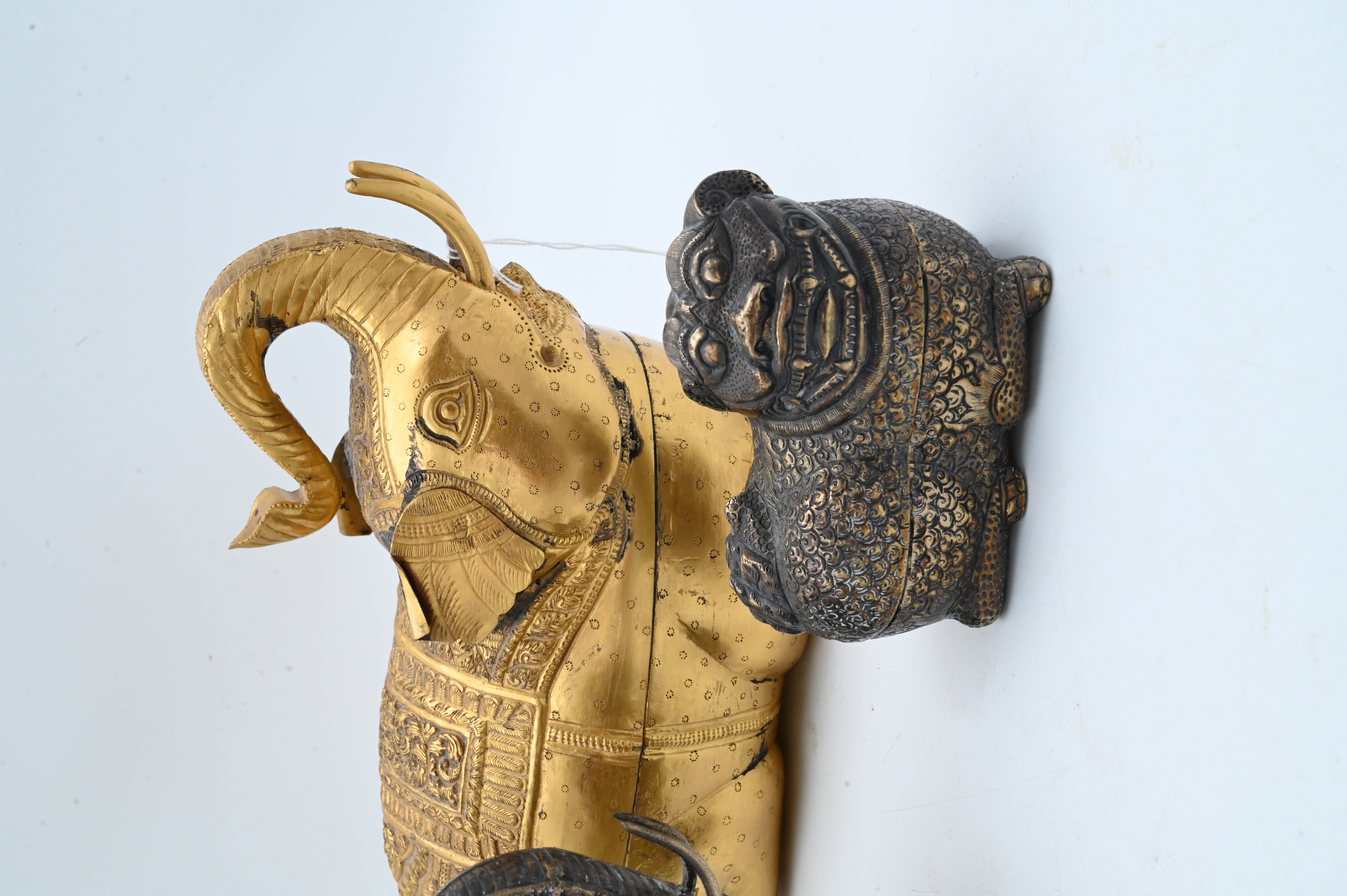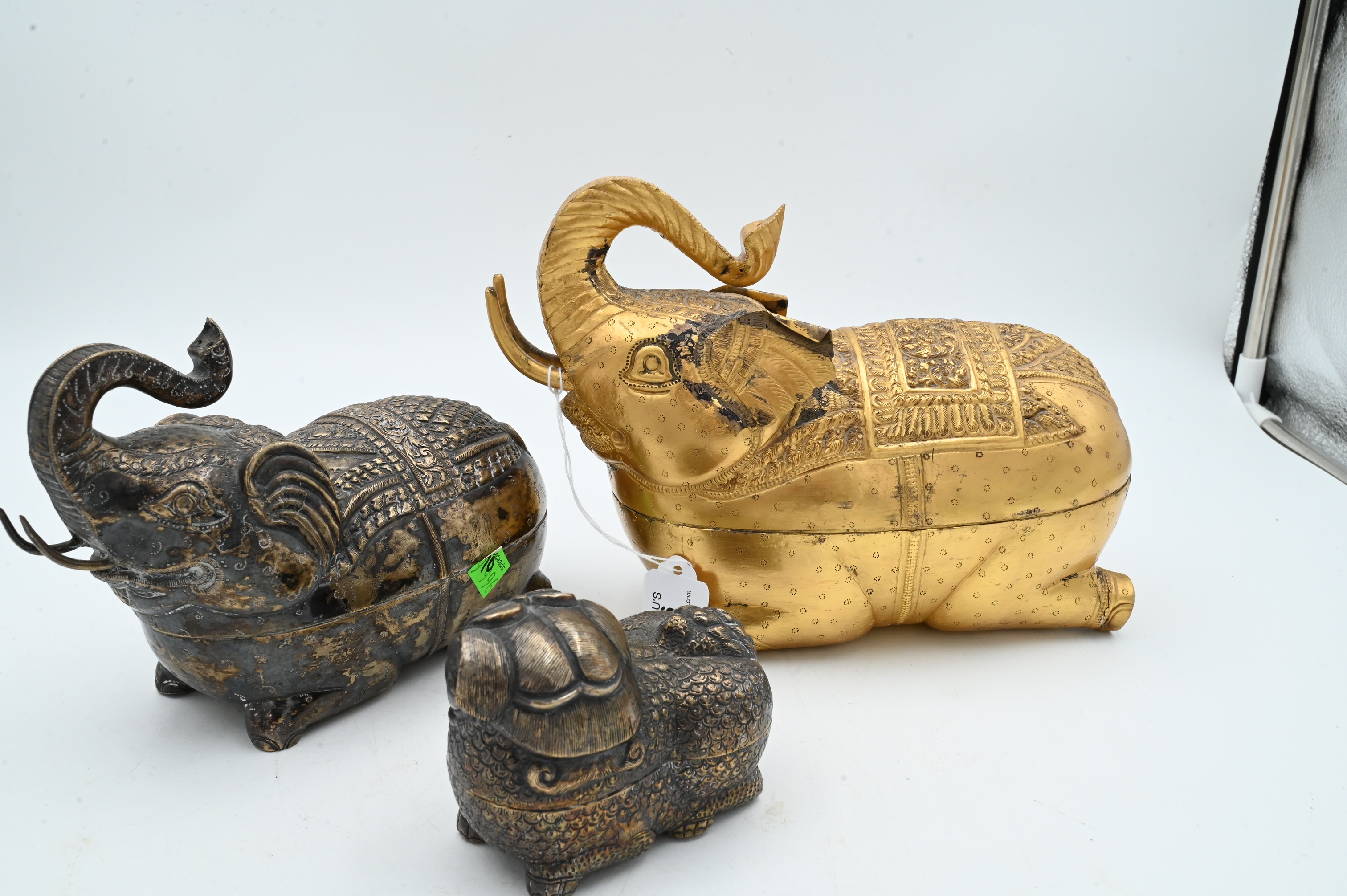 to include one medium elephant, one large elephant in gold wash, and one smaller foo dog, each finely engraved, two marked 900