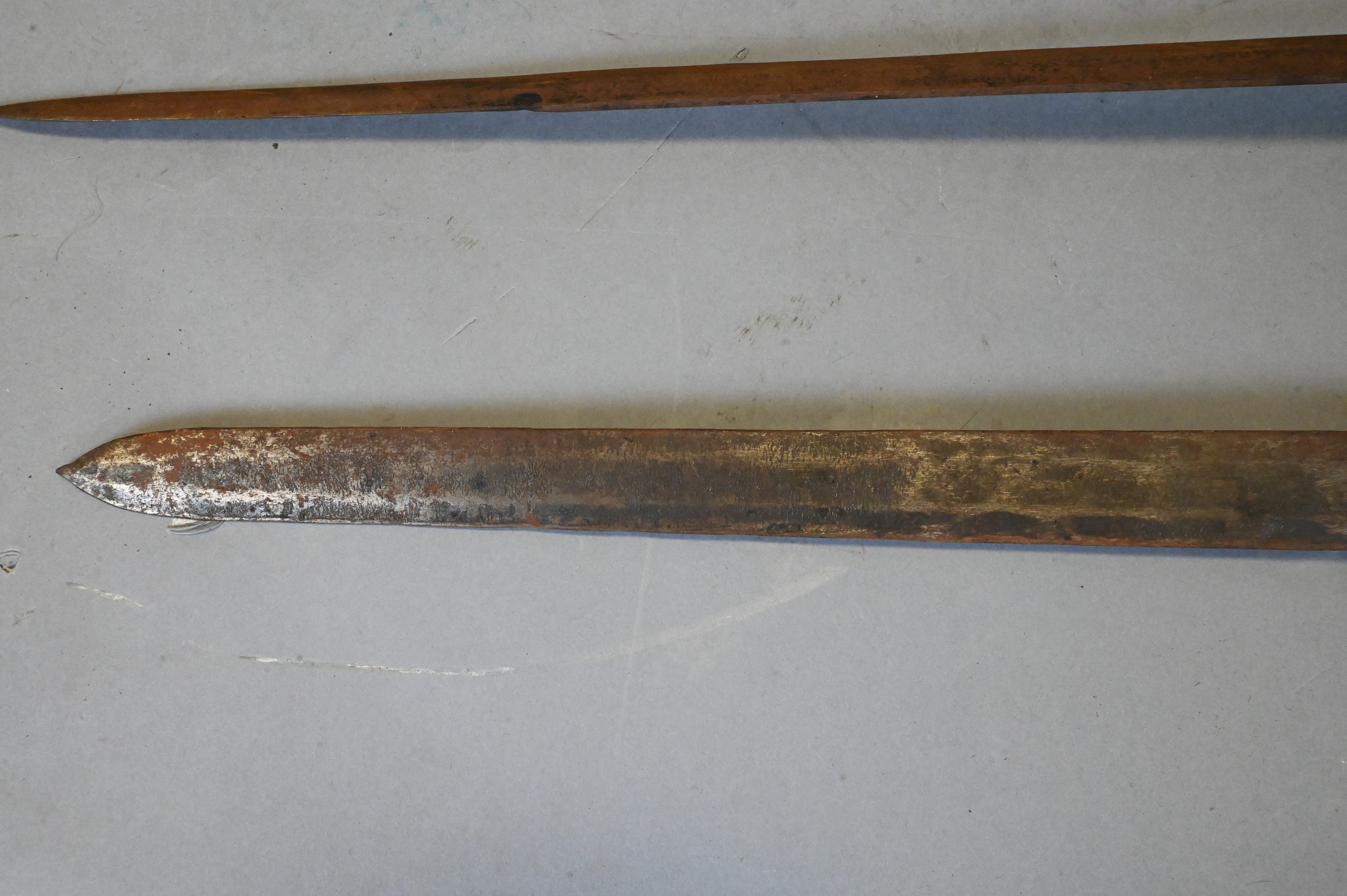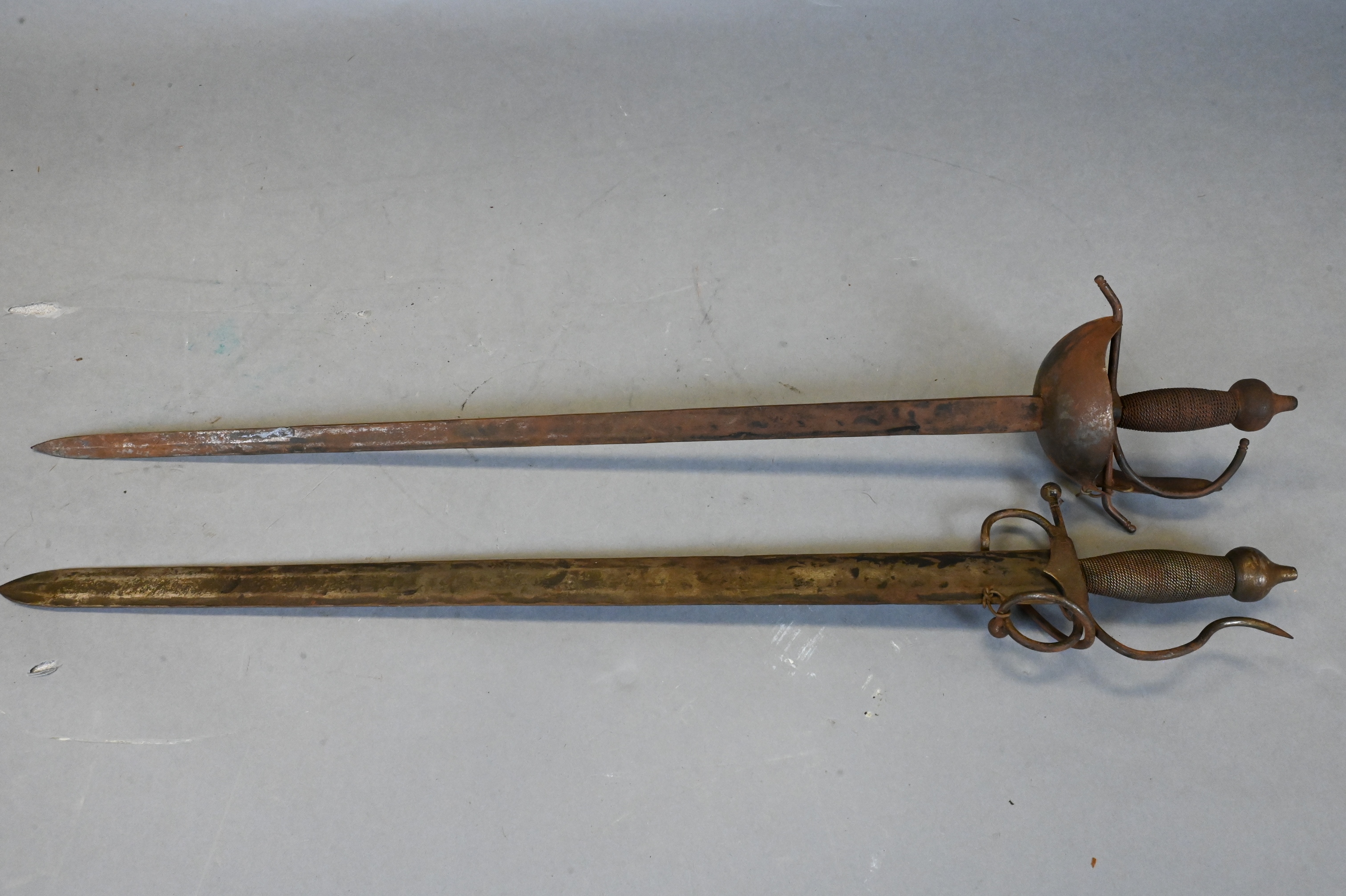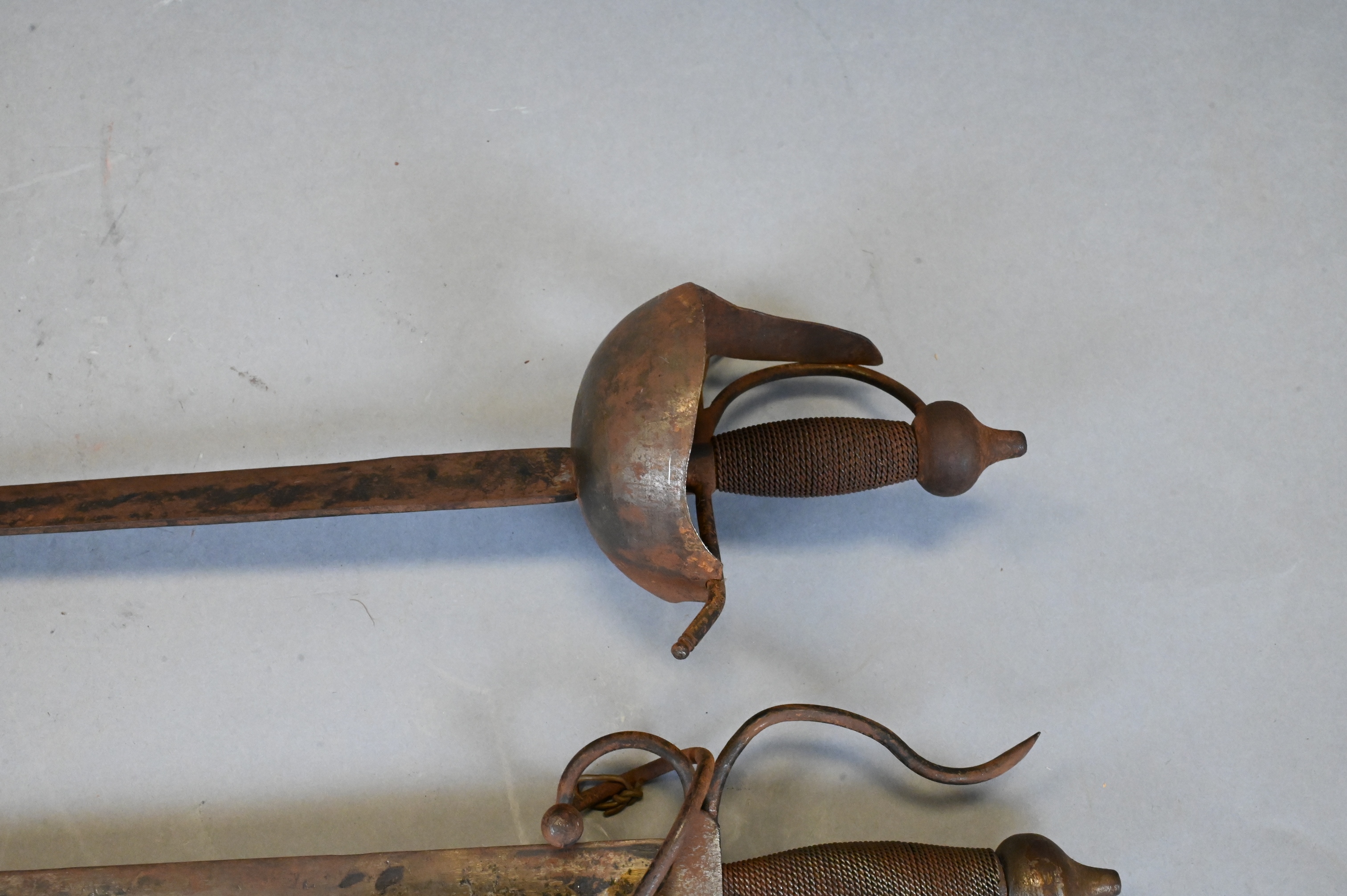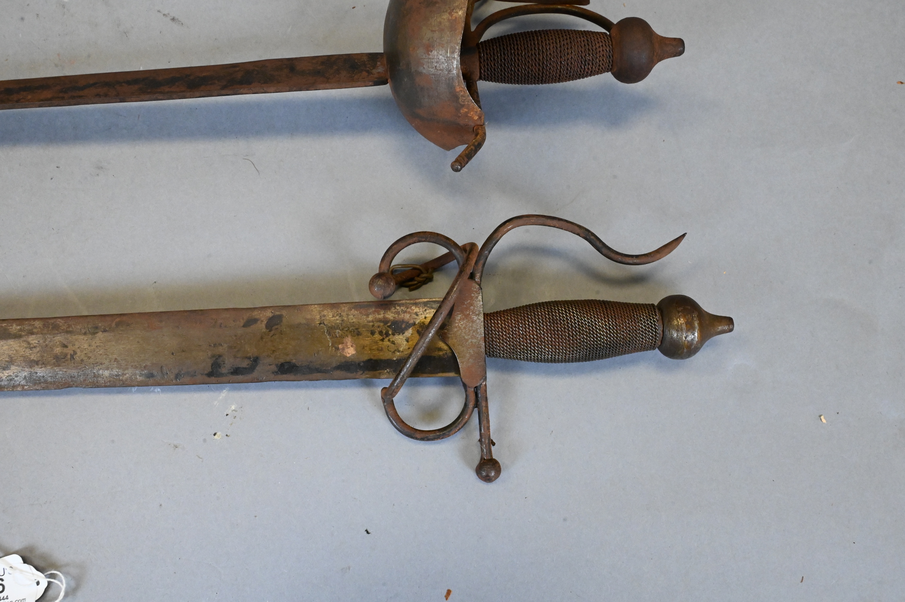 one having bishet hilt and carved quillons, the other with knuckle guard and wrapped quillons