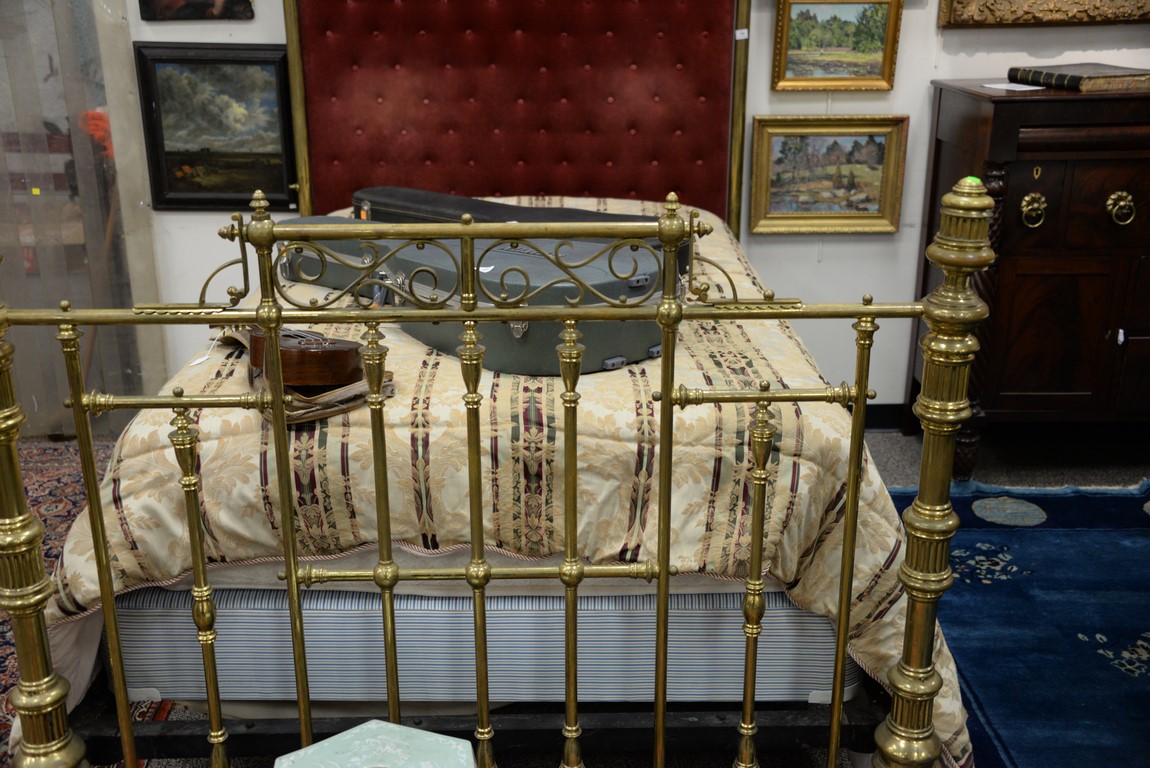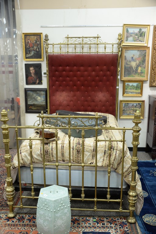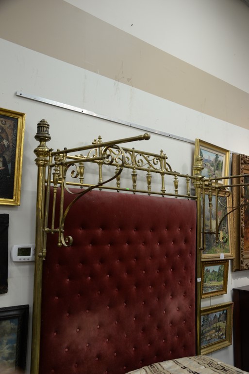 Victorian brass bed with half canopy and upholstered headboard, 19th century. ht. 91in. wd. 56in.