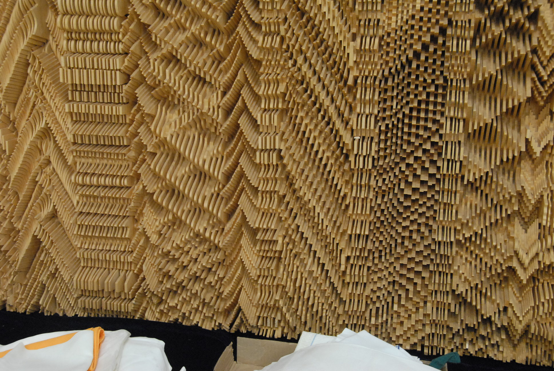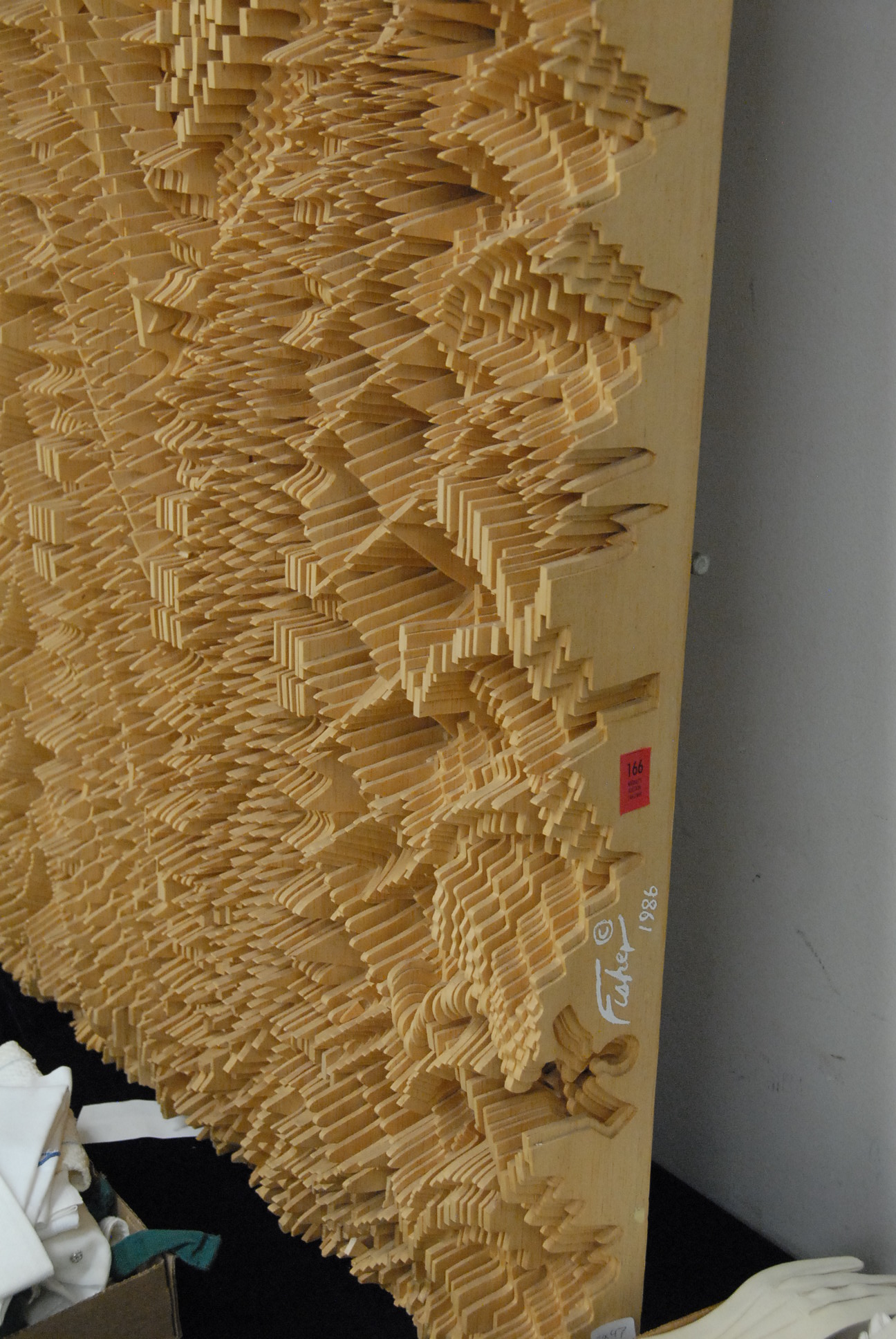 Wood three dimensional wall hanging signed Fisher 1986, 54 x 47, probably balsa wood.