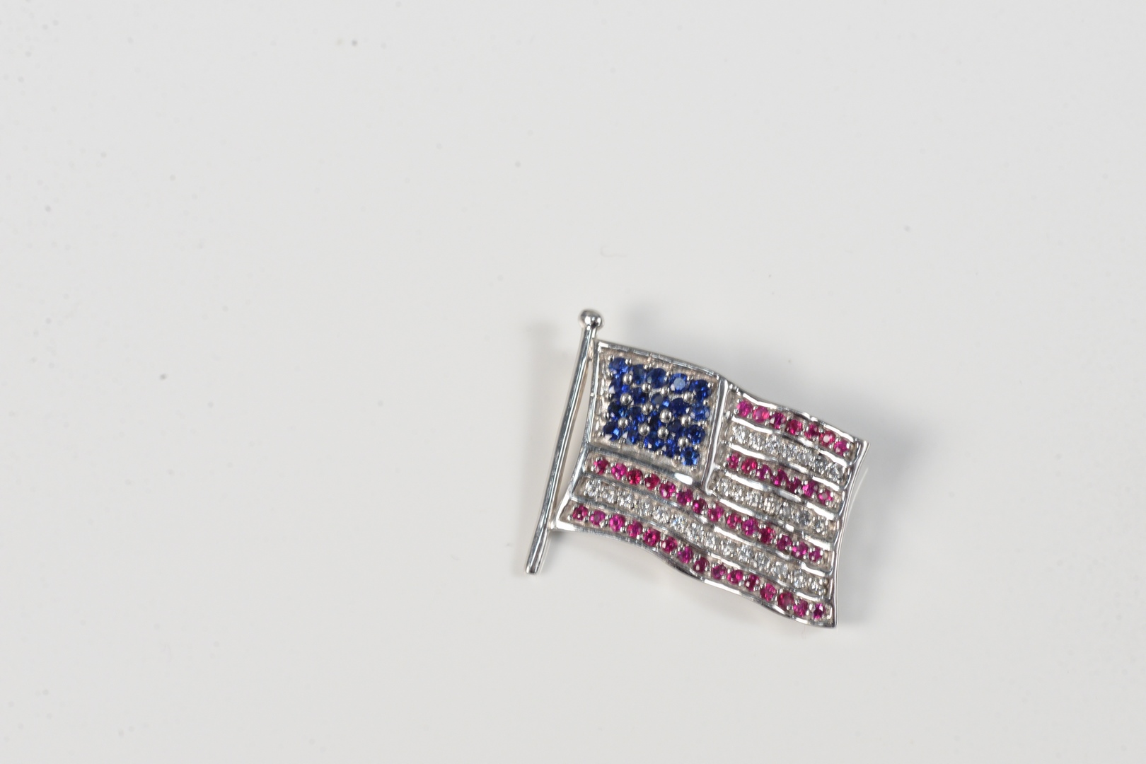 Lot 167: 18 Karat White Gold Flag Pin set with twenty sapphires, four rows of rubies, and three rows of diamonds length 1 1/8 inches 12.9 grams