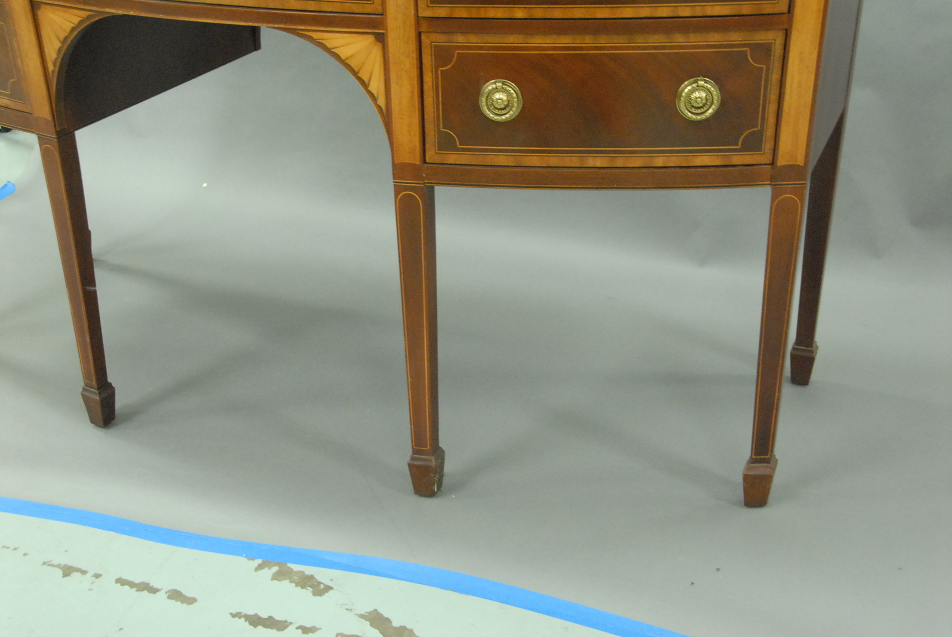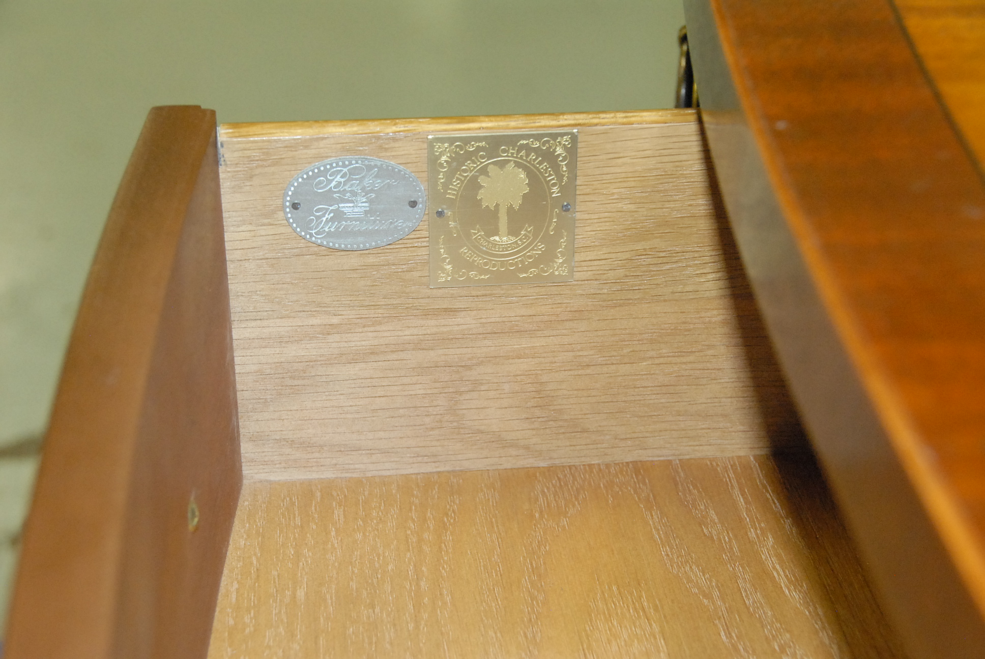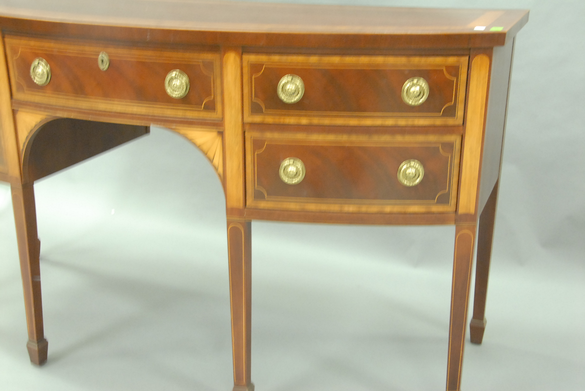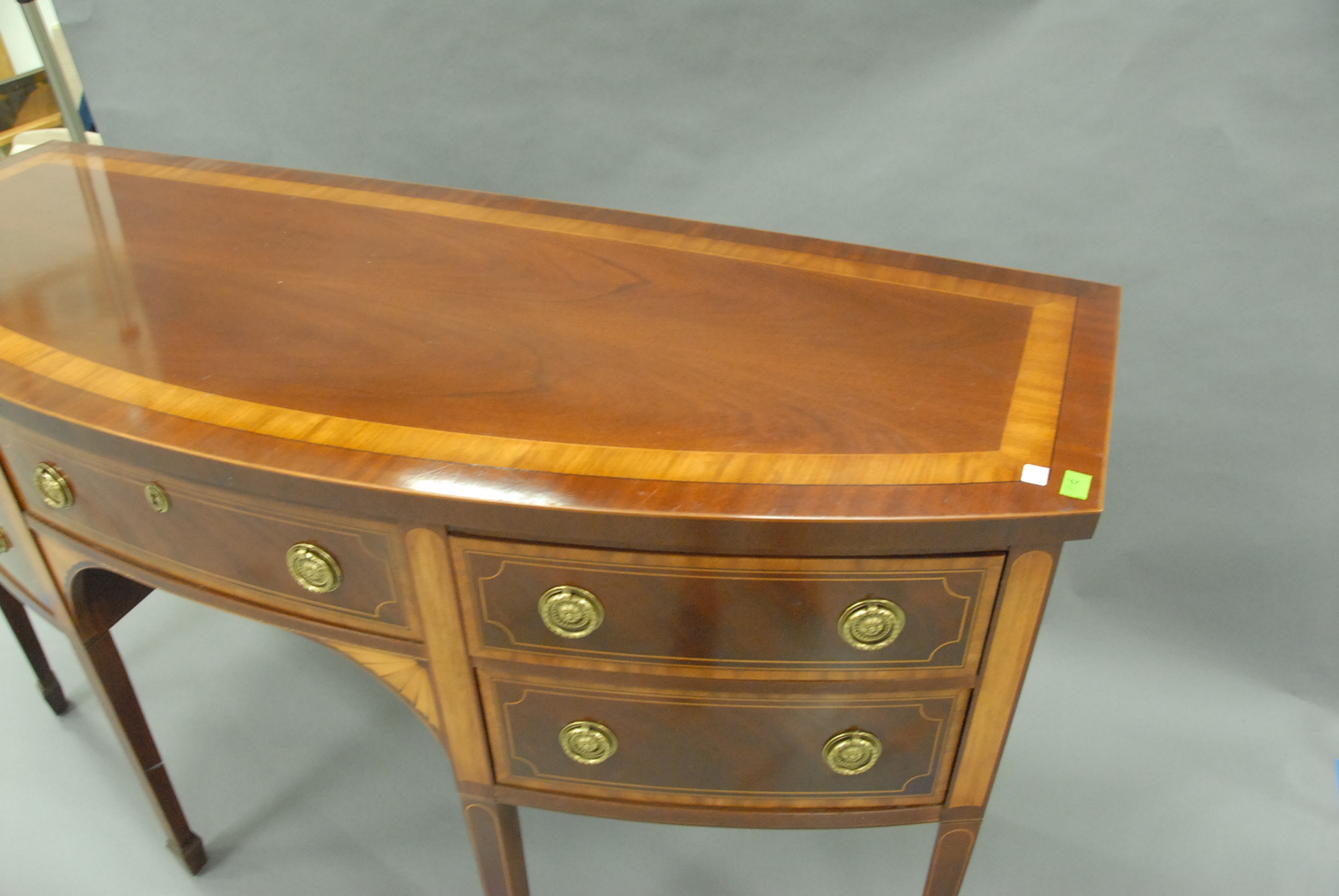 Baker Furniture George IV style sideboard with banded inlaid top, panel and fan inlaid front on square tapered legs with bowed front, with label that reads Baker Furniture Historic Charleston Reproductions.