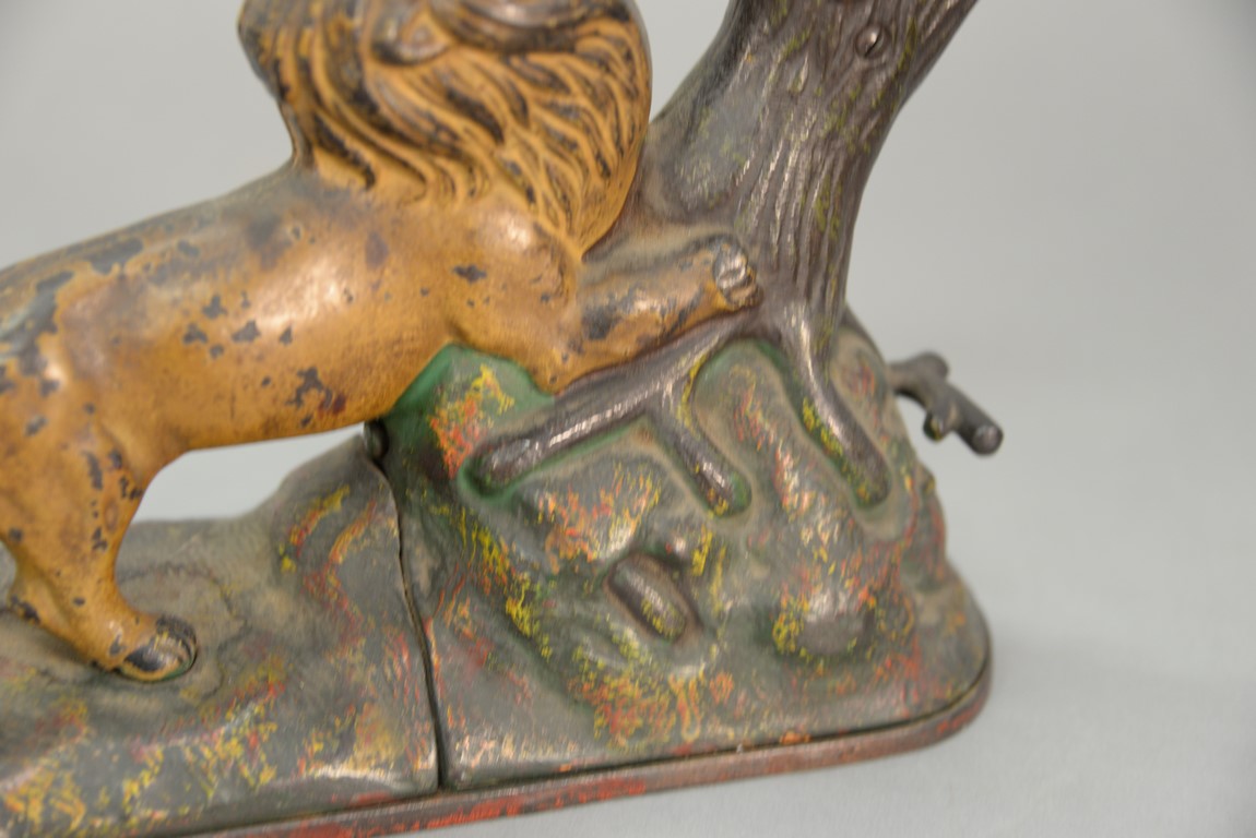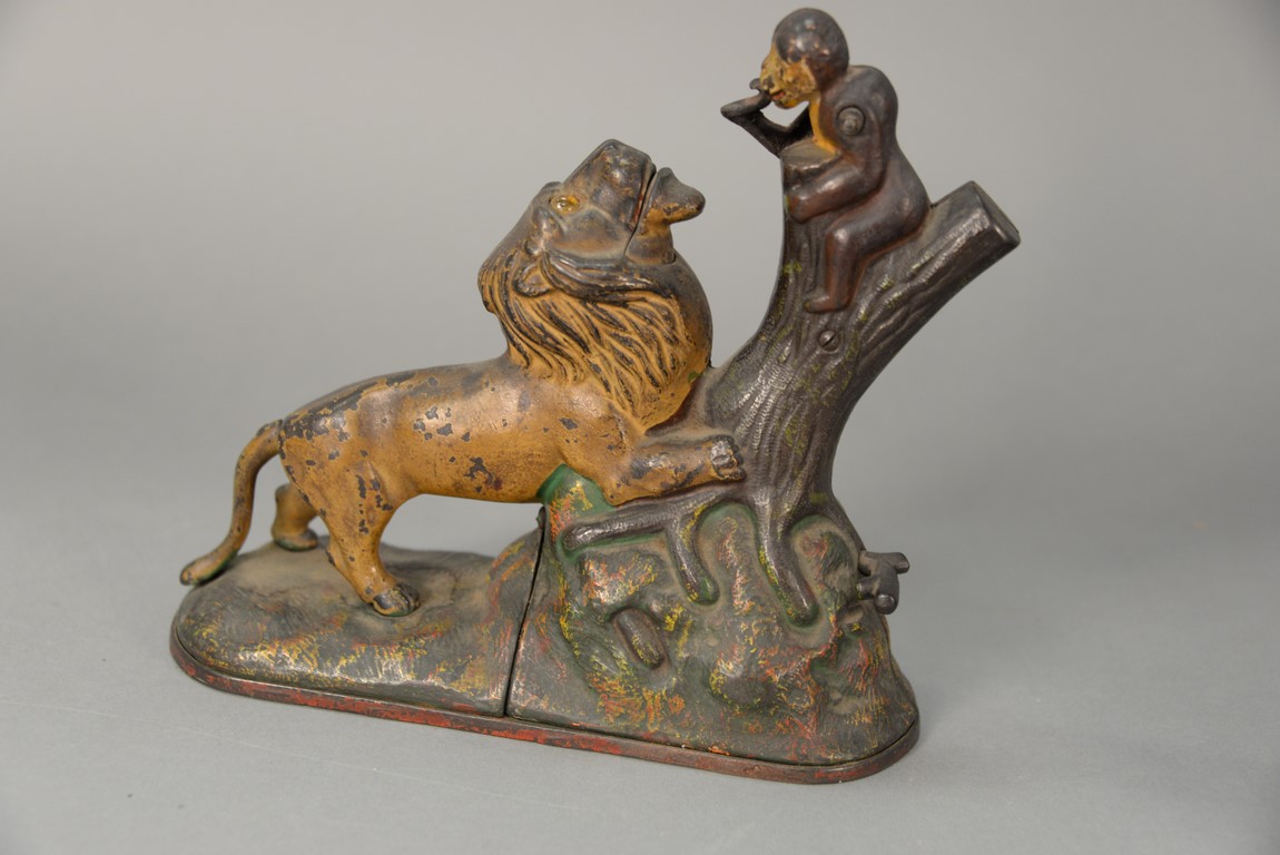 Cast iron Monkey and Lion mechanical bank, 19th century. ht. 8 in. lg. 9 in.