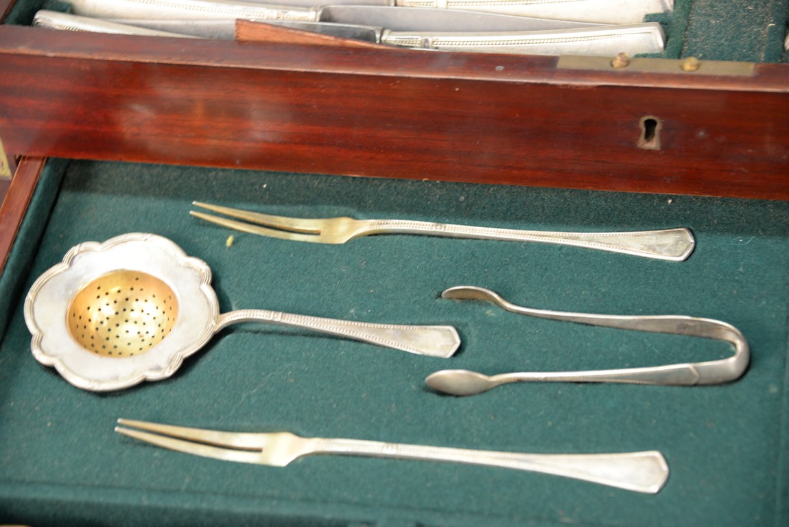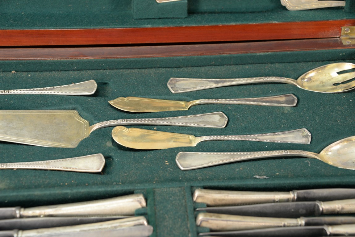 Continental silver flatware set including 11 dinner forks, 12 lunch forks, 12 dinner knives, 12 lunch knives, 12 table spoons, 6 teaspoons, 12 demitasse spoons, 12 fish knives, 10 fish forks, ladles, 14 serving pieces, and 1 strainer, all in large fitted box. 114 total pieces 153 weighable troy ounces plus 44 handles