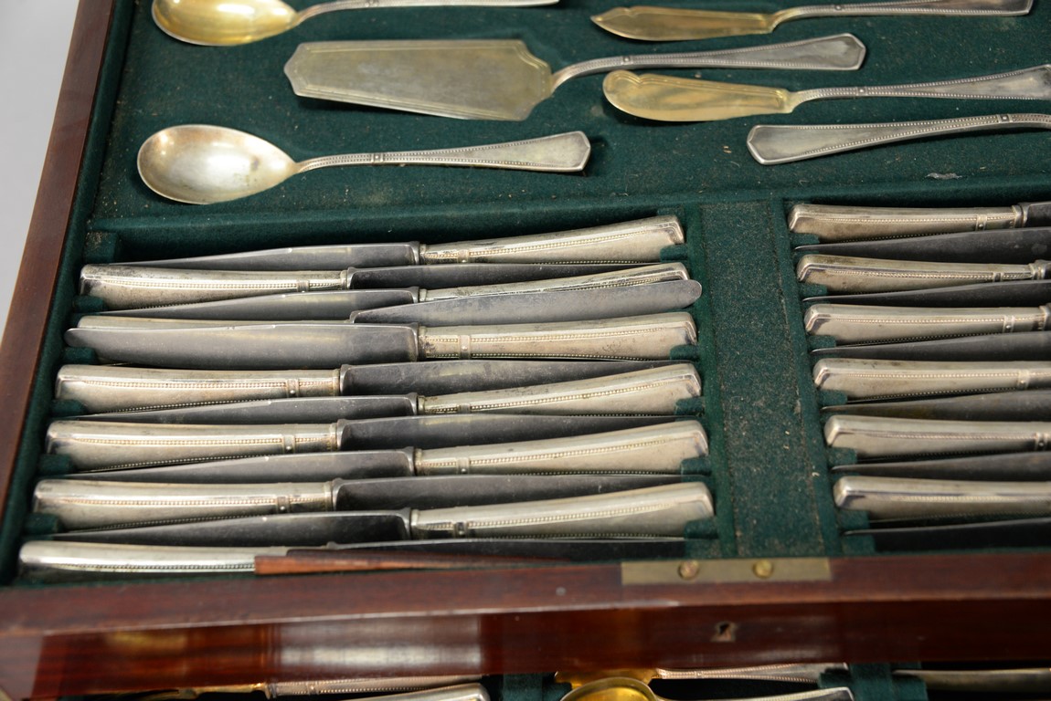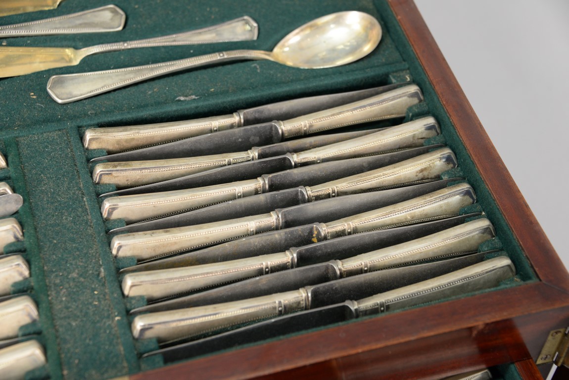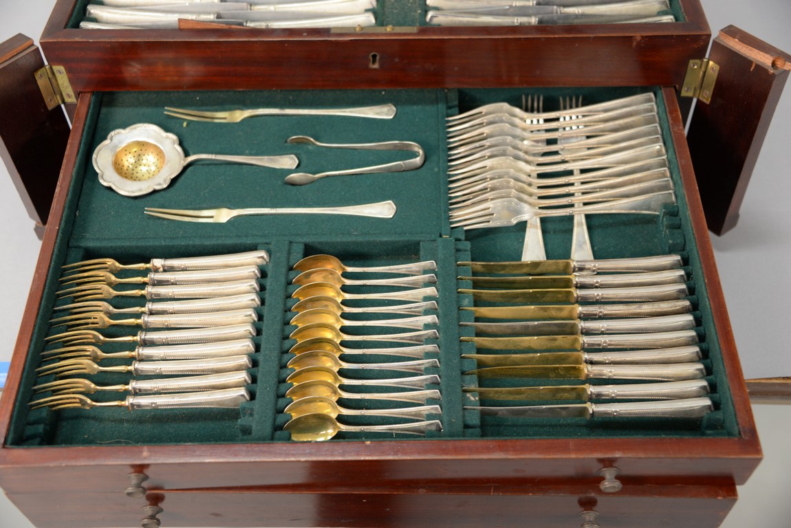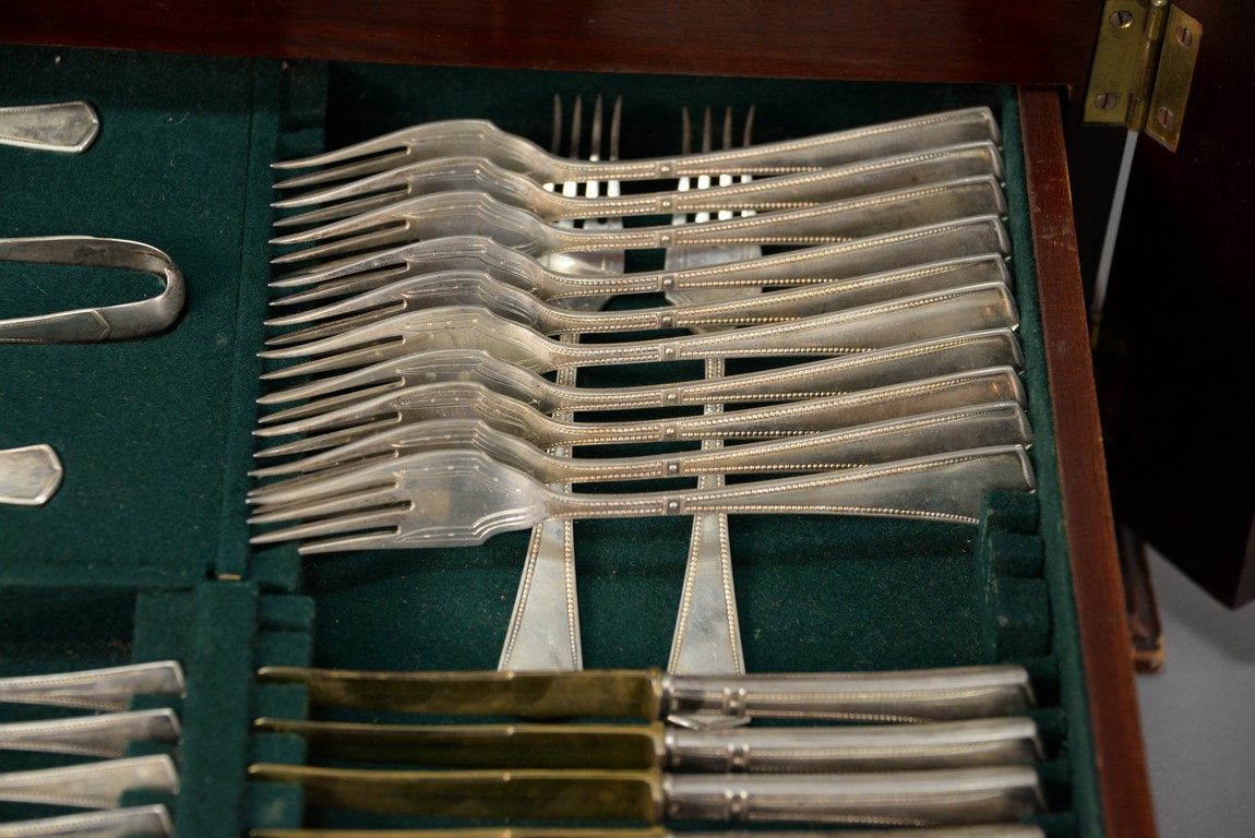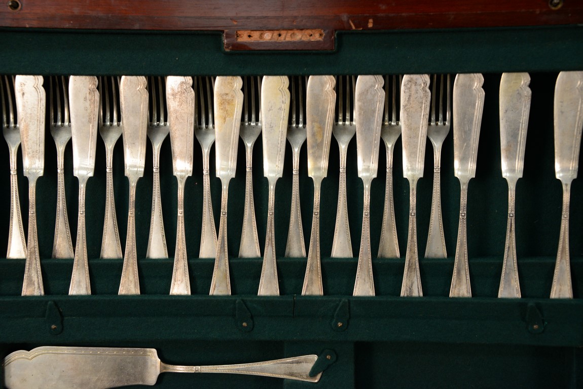 Lot 167: Continental silver flatware set including 11 dinner forks, 12 lunch forks, 12 dinner knives, 12 lunch knives, 12 table spo…