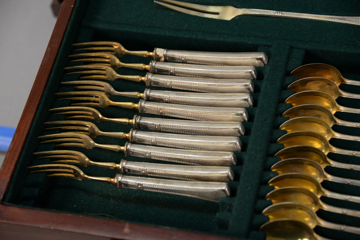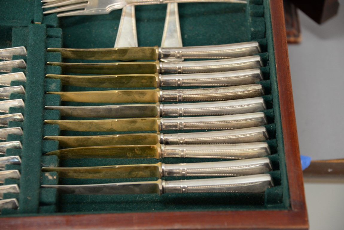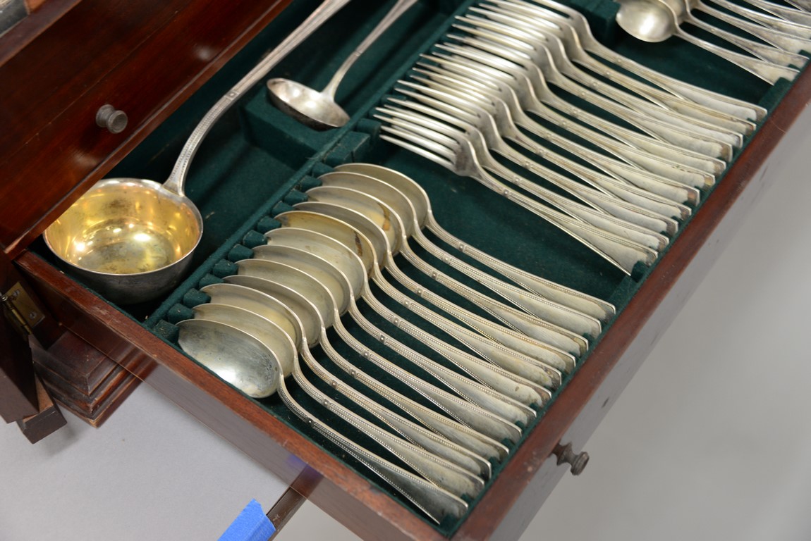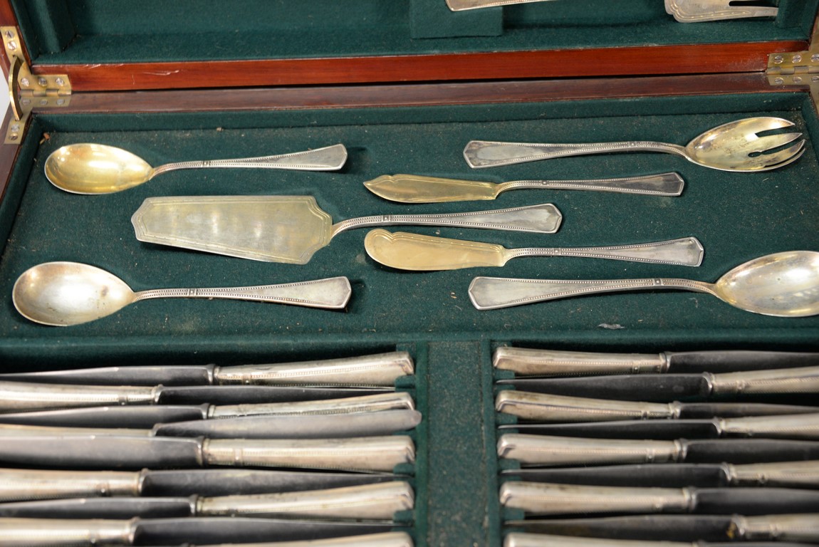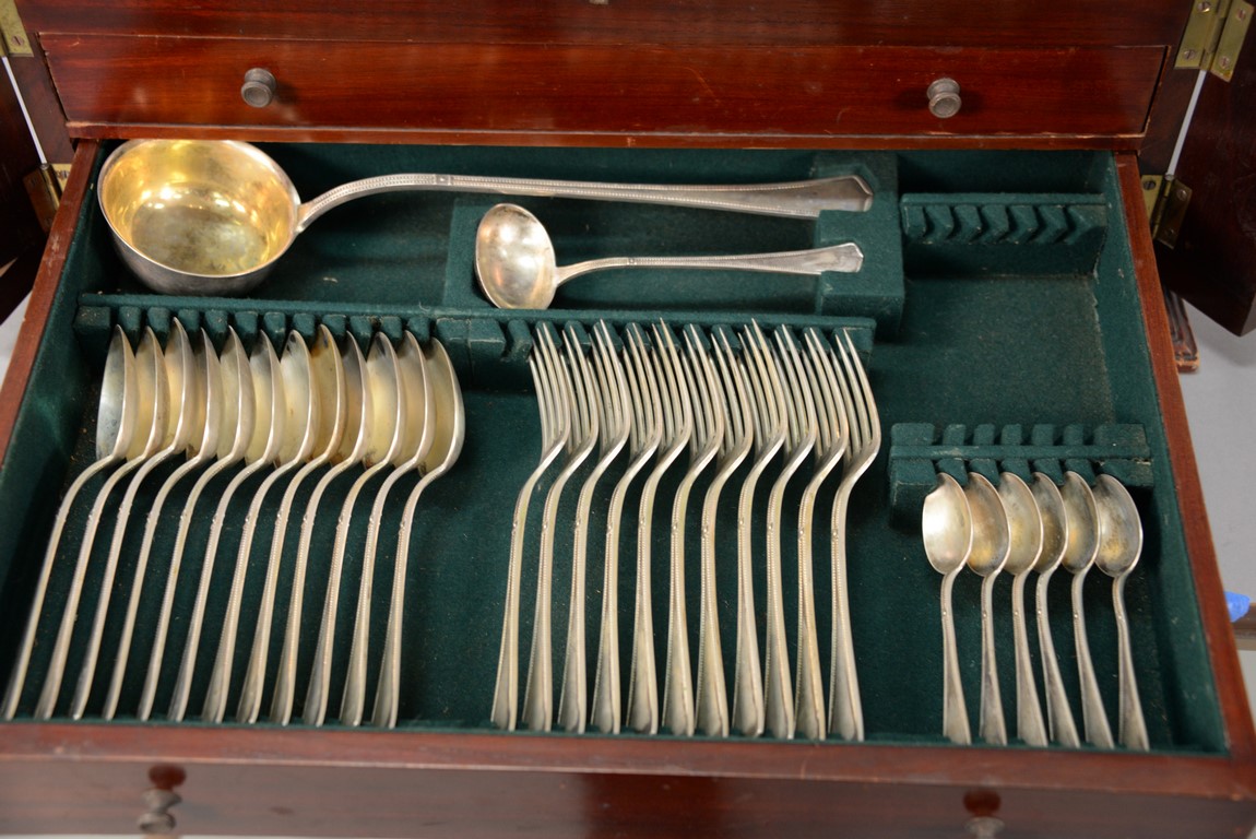 Lot 167: Continental silver flatware set including 11 dinner forks, 12 lunch forks, 12 dinner knives, 12 lunch knives, 12 table spo…