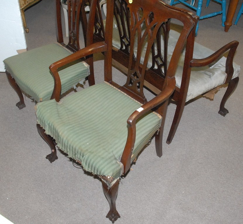 Custom mahogany three piece set double chairback settee, side chair, and armchair.