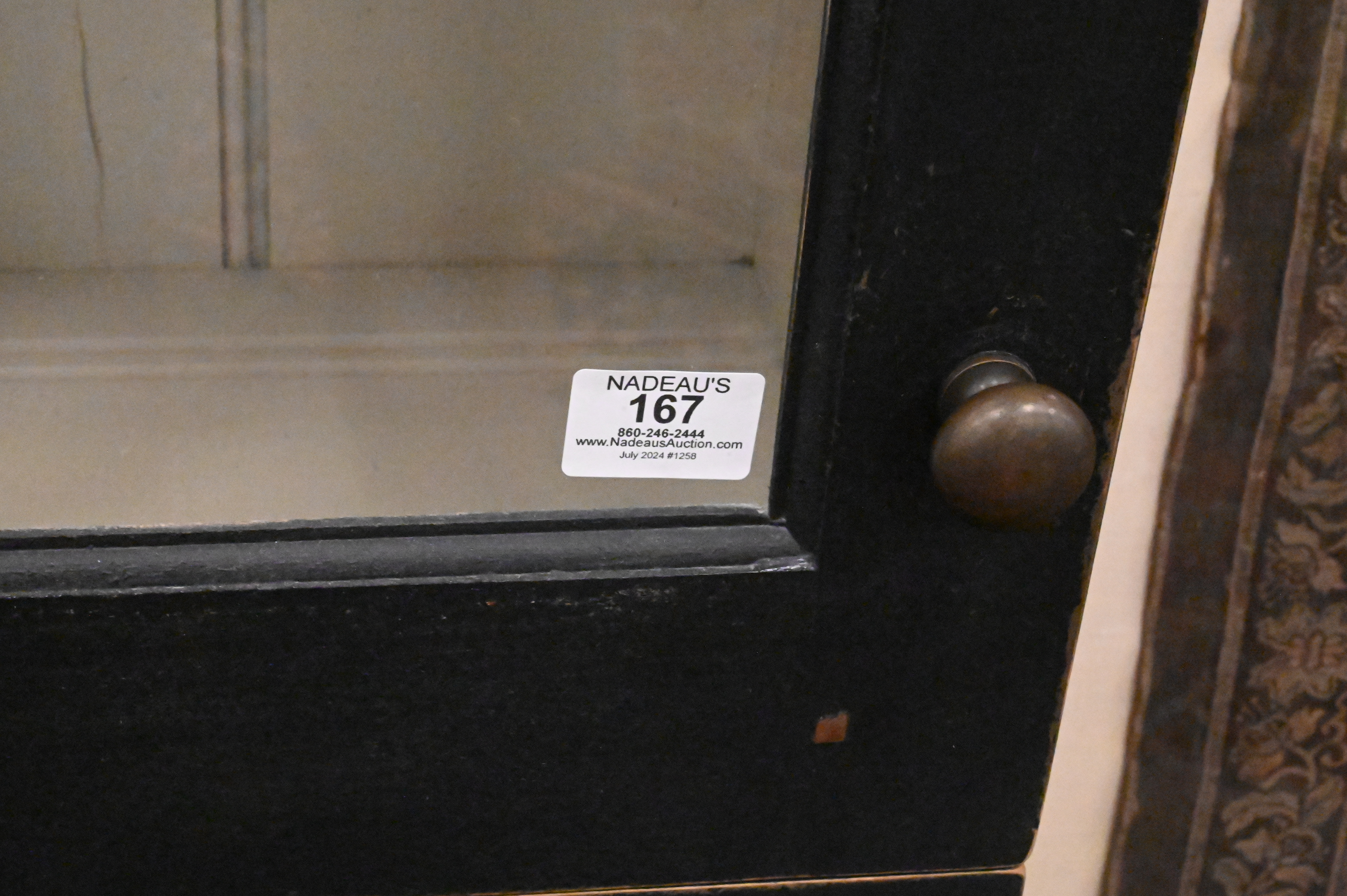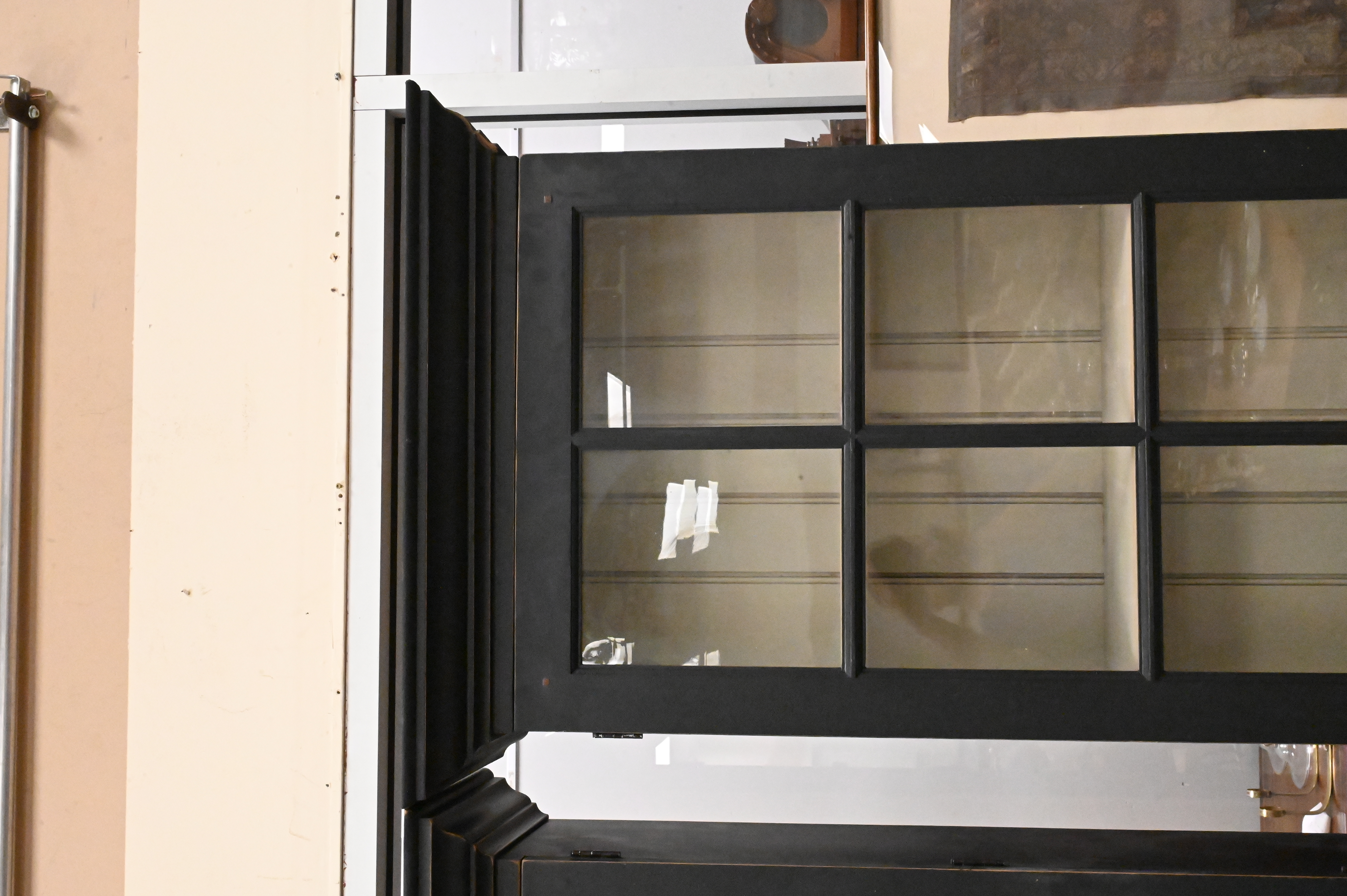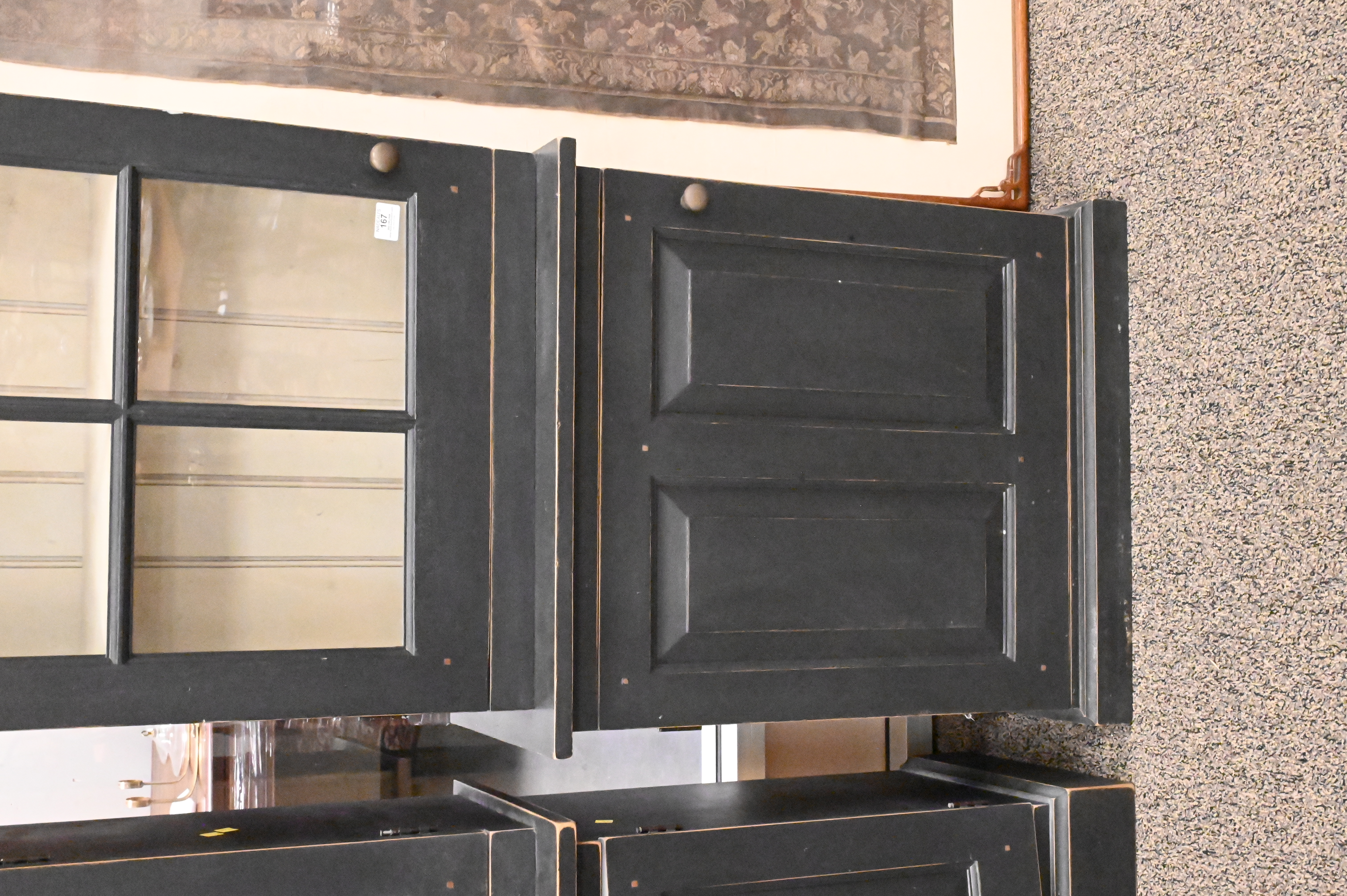 painted black having four shelves behind glazed glass panel door over single raised panel door