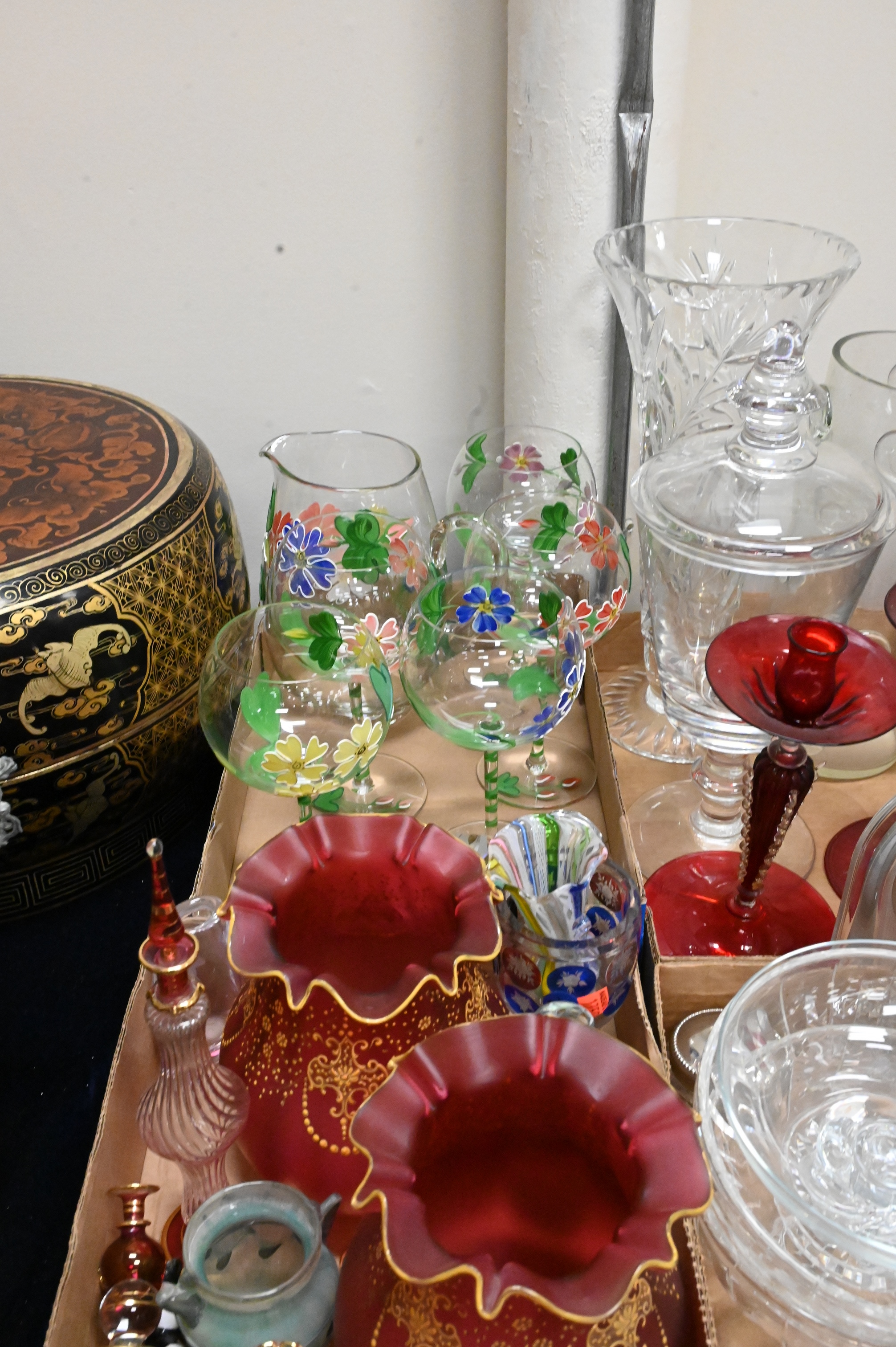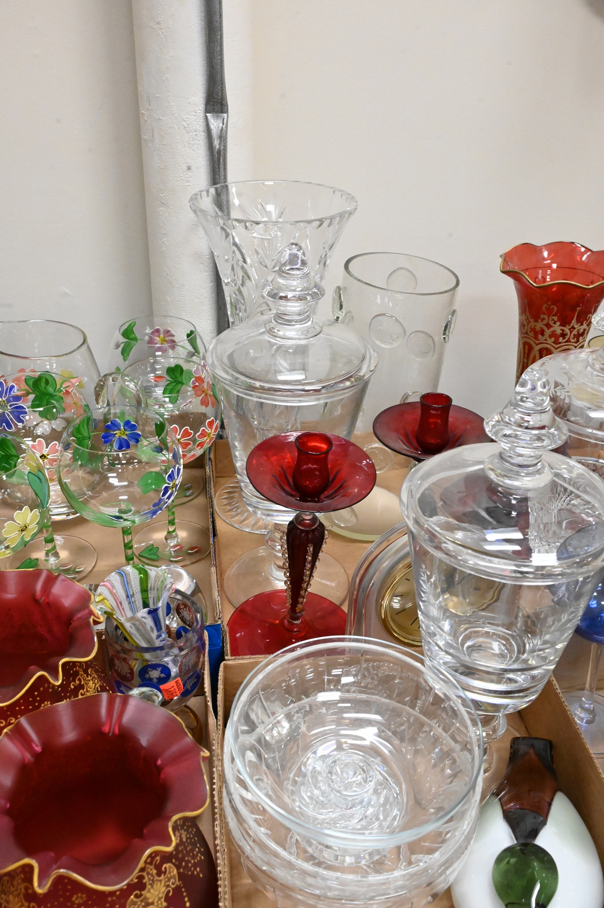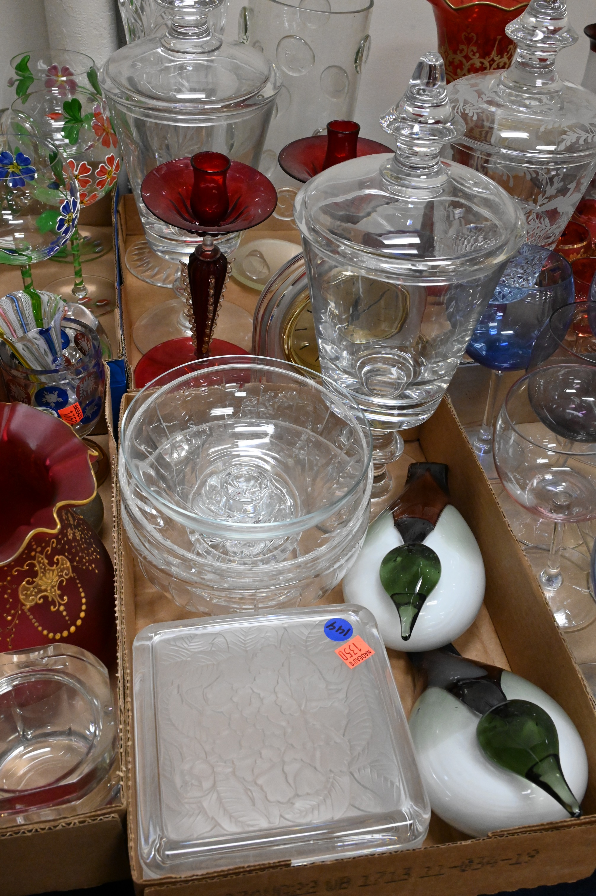 Eight Tray Lots of Glass, to include Waterford, Venetian glass, vases, compotes, etc. Provenance: Property from a private New York collection sold to benefit charitable foundations.