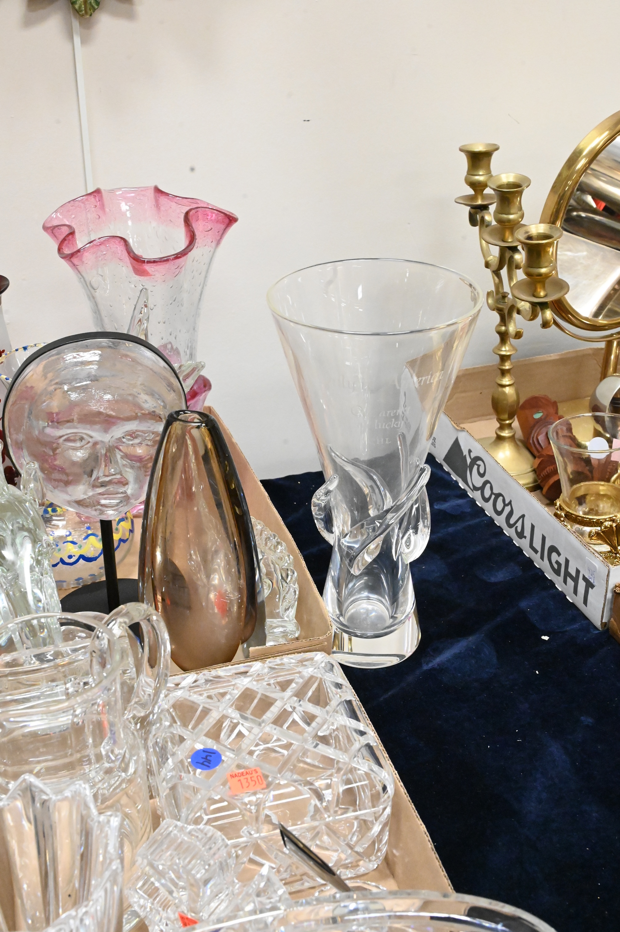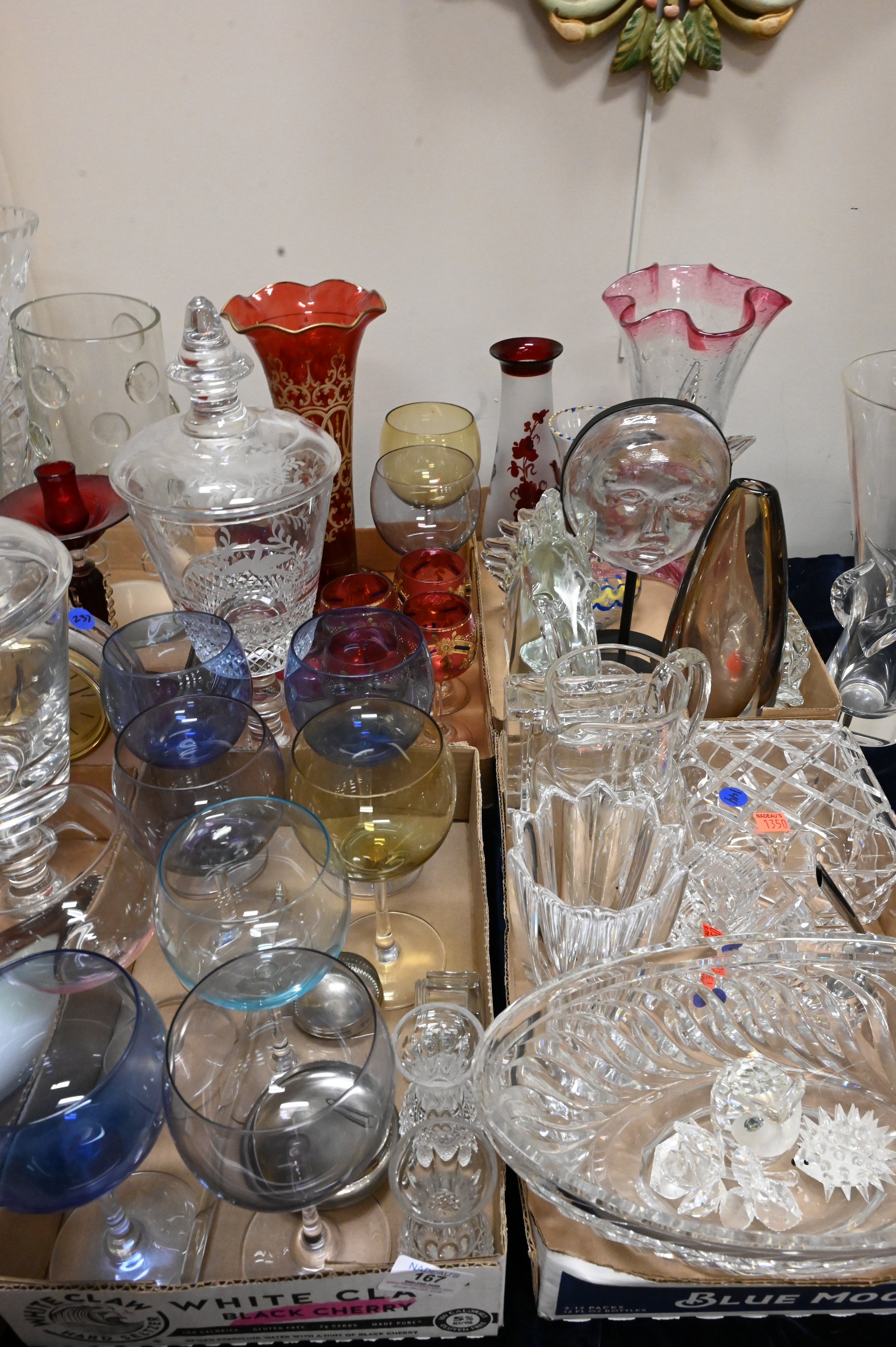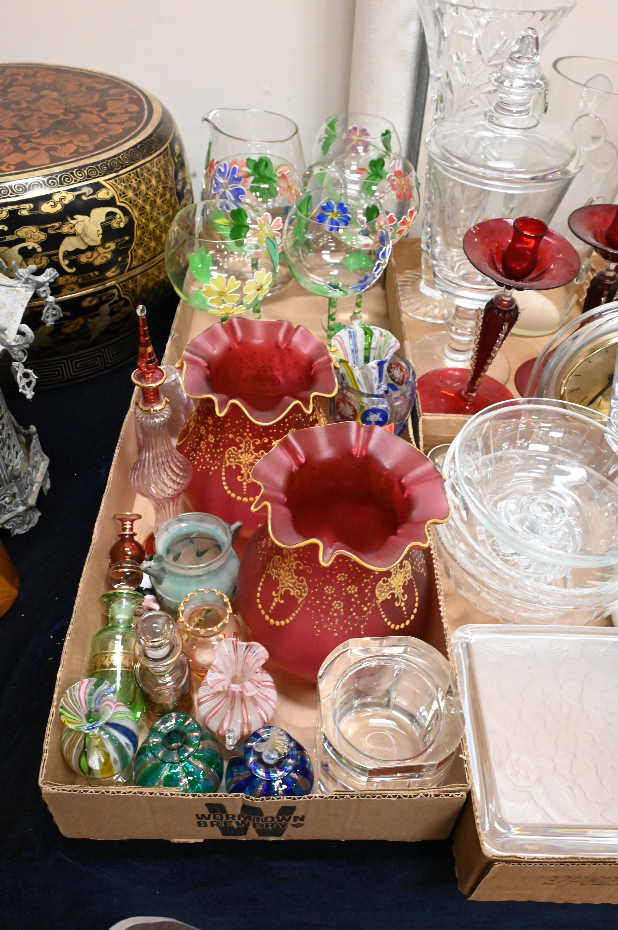 Eight Tray Lots of Glass, to include Waterford, Venetian glass, vases, compotes, etc. Provenance: Property from a private New York collection sold to benefit charitable foundations.