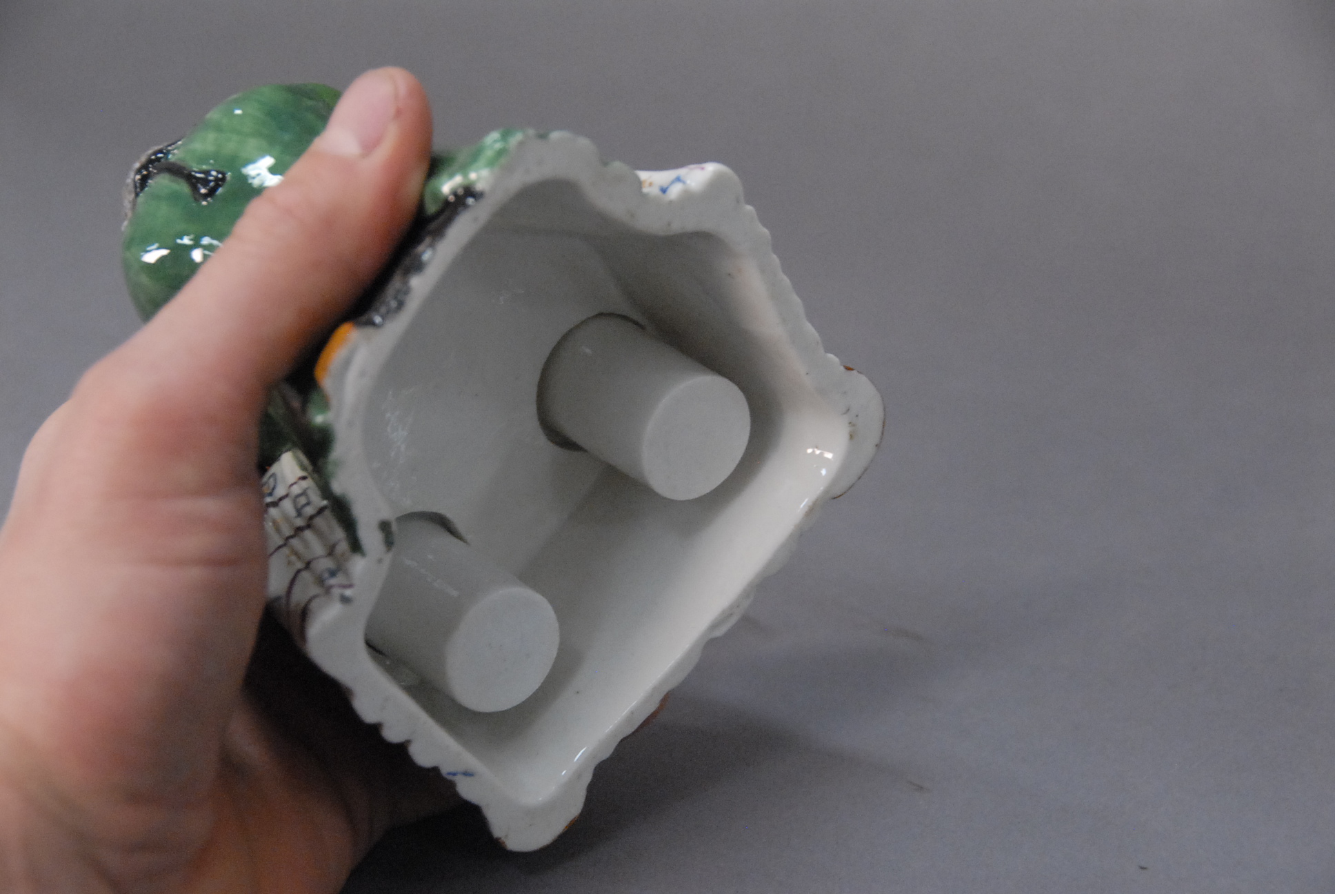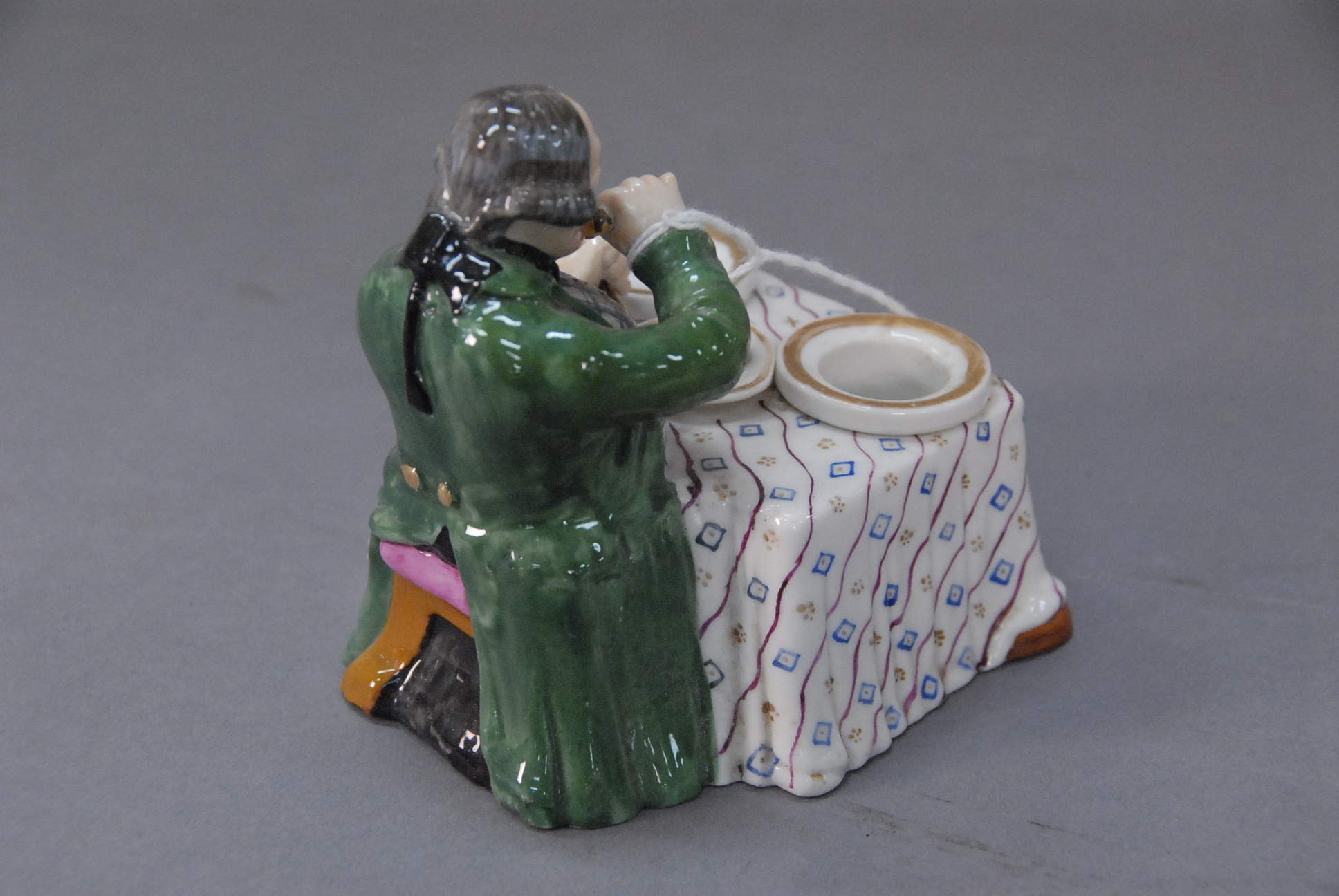 Lot 167: Figural porcelain inkwell and sander molded of a man sitting at a cloth draped table eating, ht. 4in. lg. 4in.