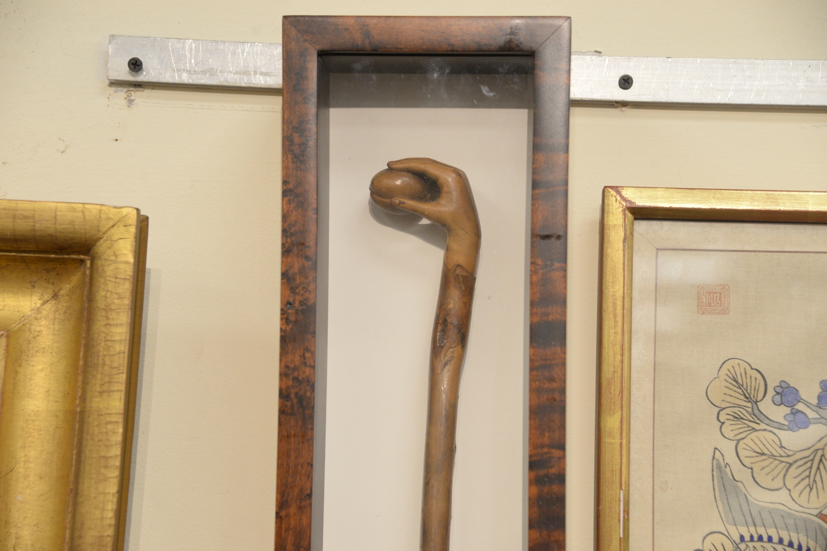 Folk Art Cane, top having carved hand holding a peach, 19th century, in fitted case, length 35 1/2 inches.