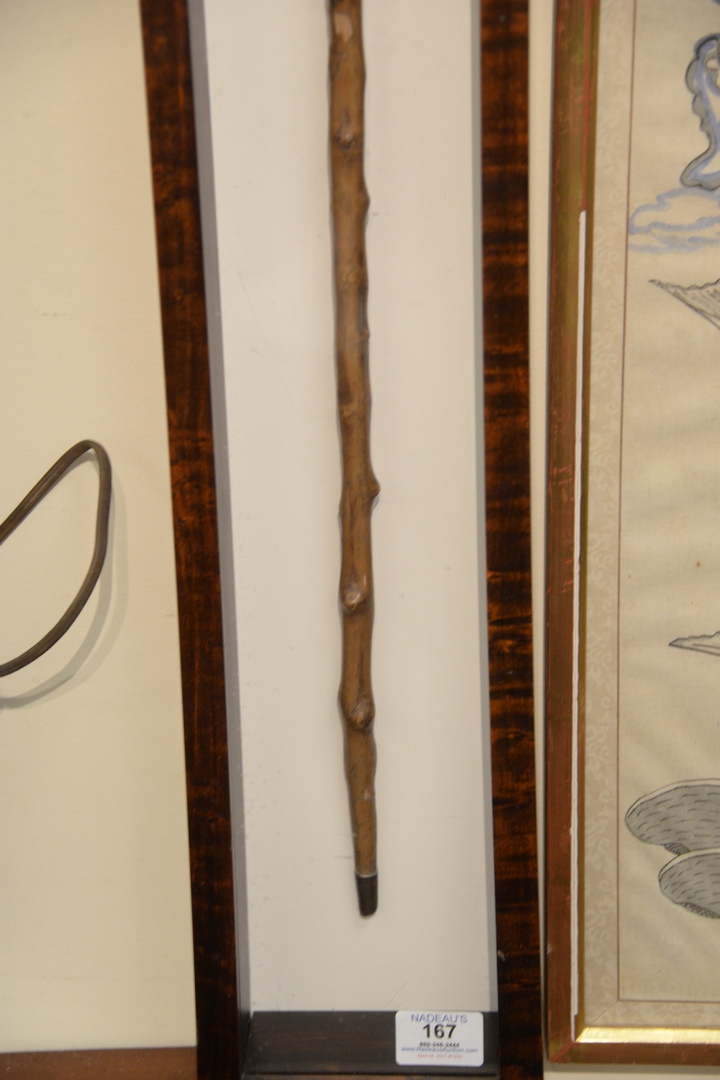 Lot 167: Folk Art Cane, top having carved hand holding a peach, 19th century, in fitted case, length 35 1/2 inches.
