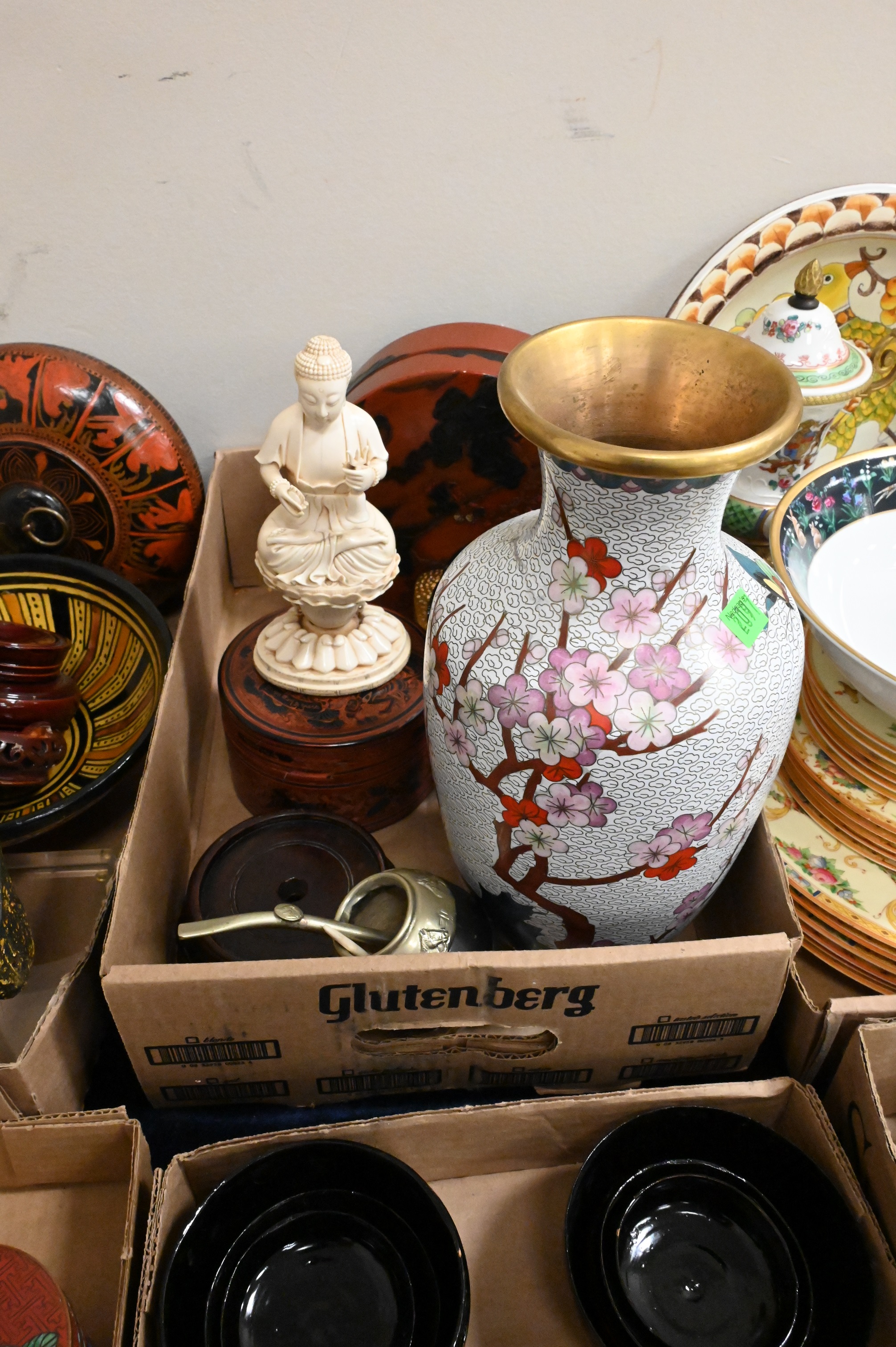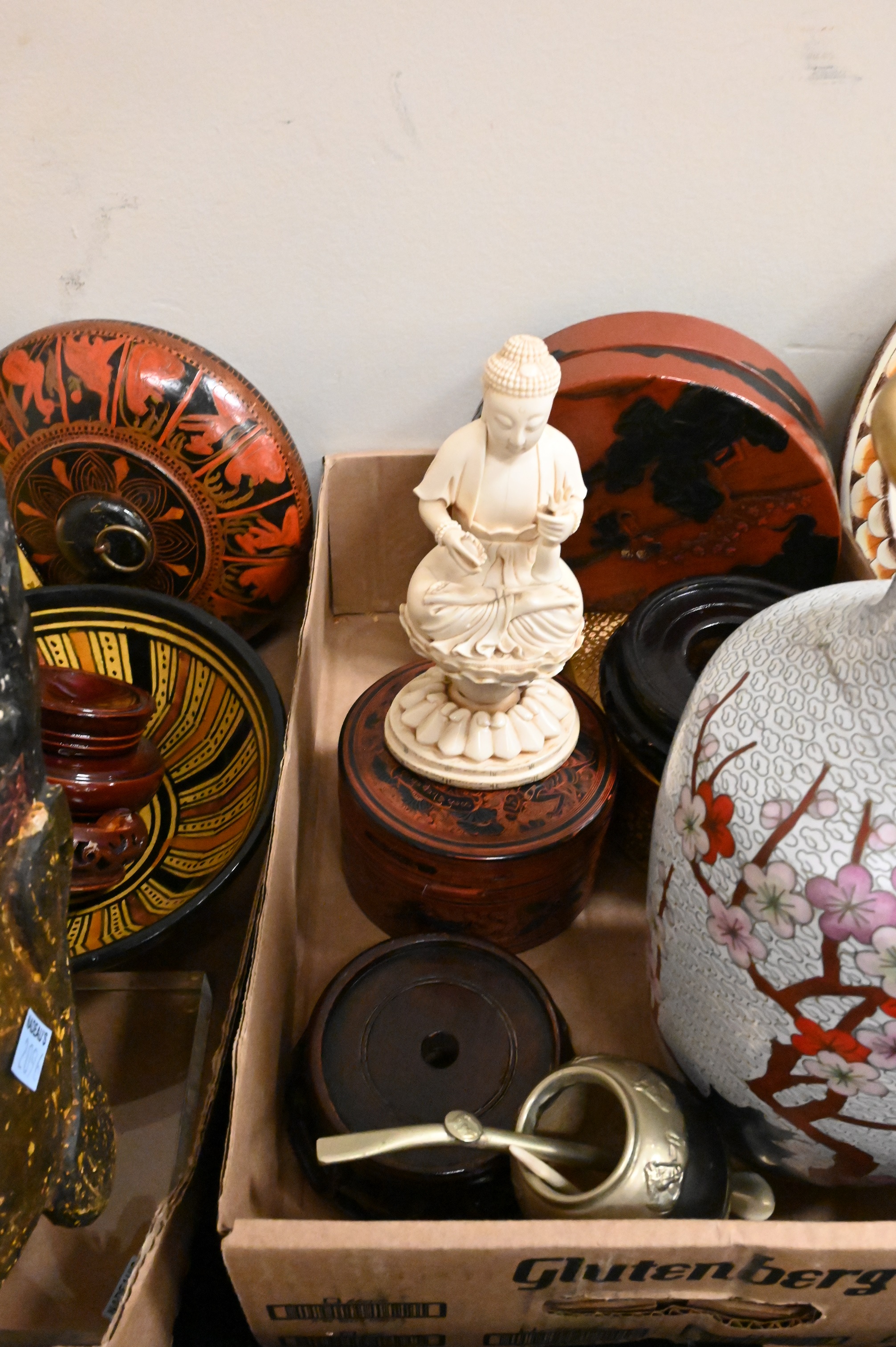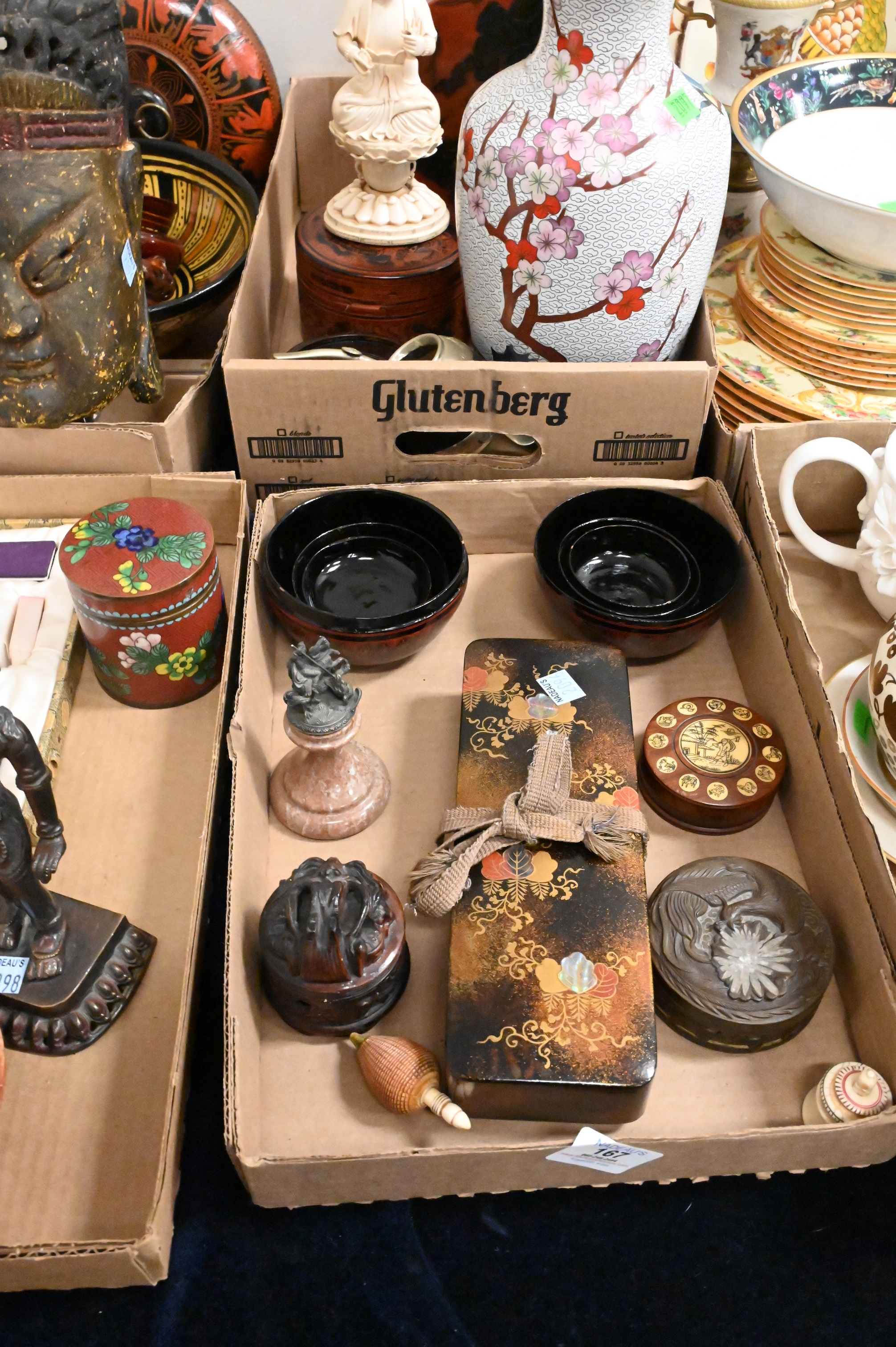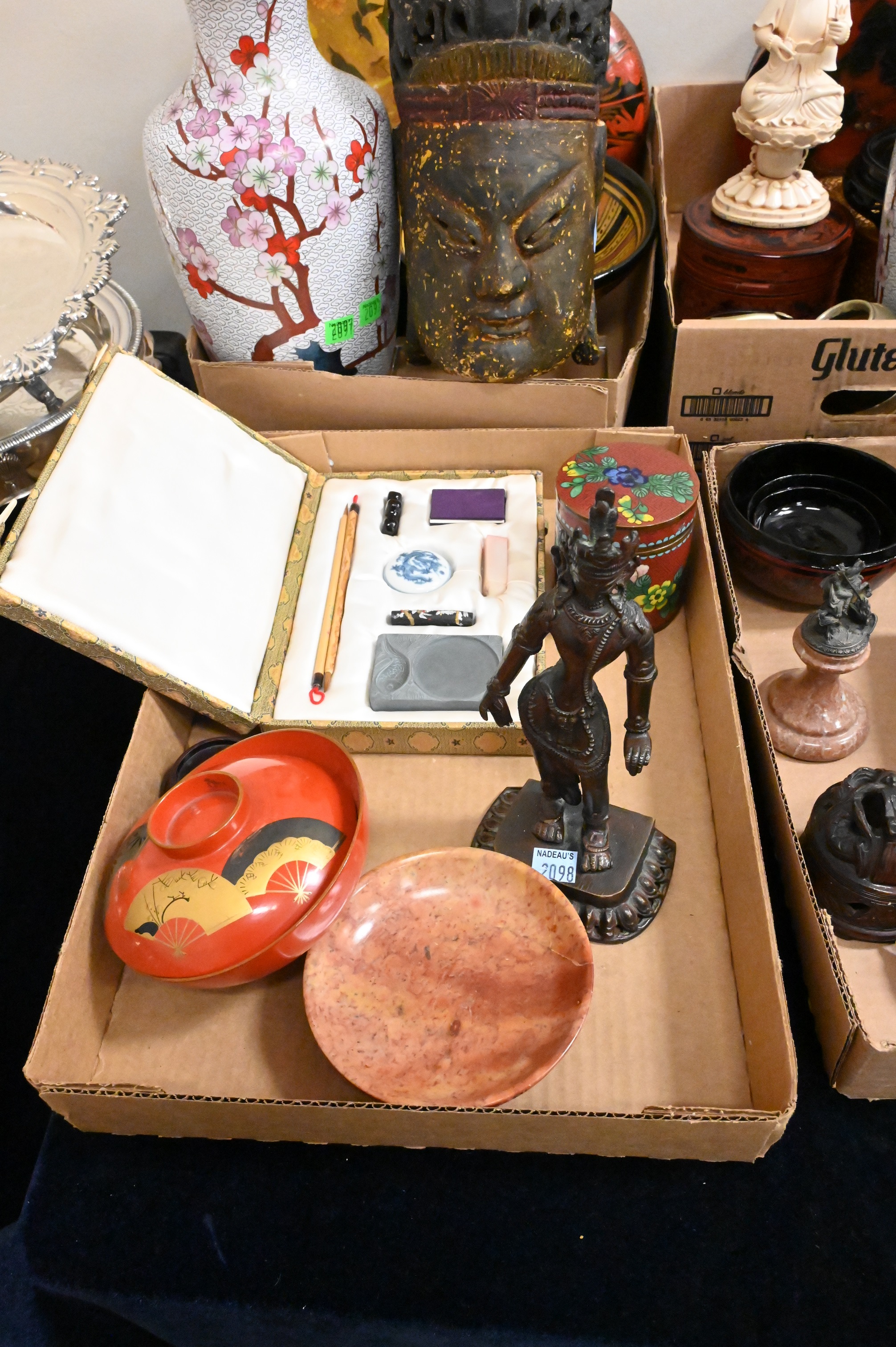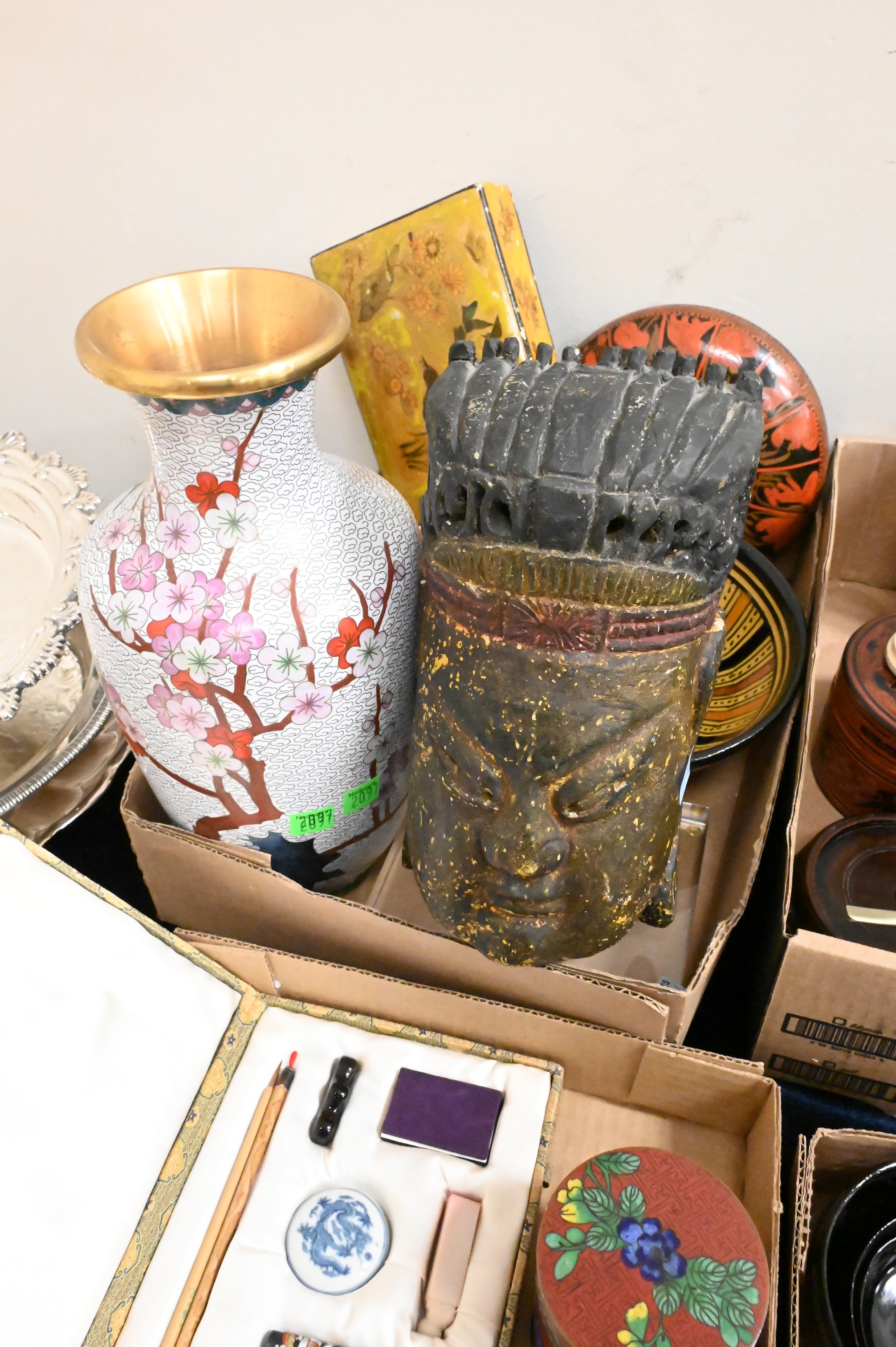 Four Tray Lots of Asian Items, pair of Chinese Cloisonne vases, lacquer boxes, etc. largest 11 inches height