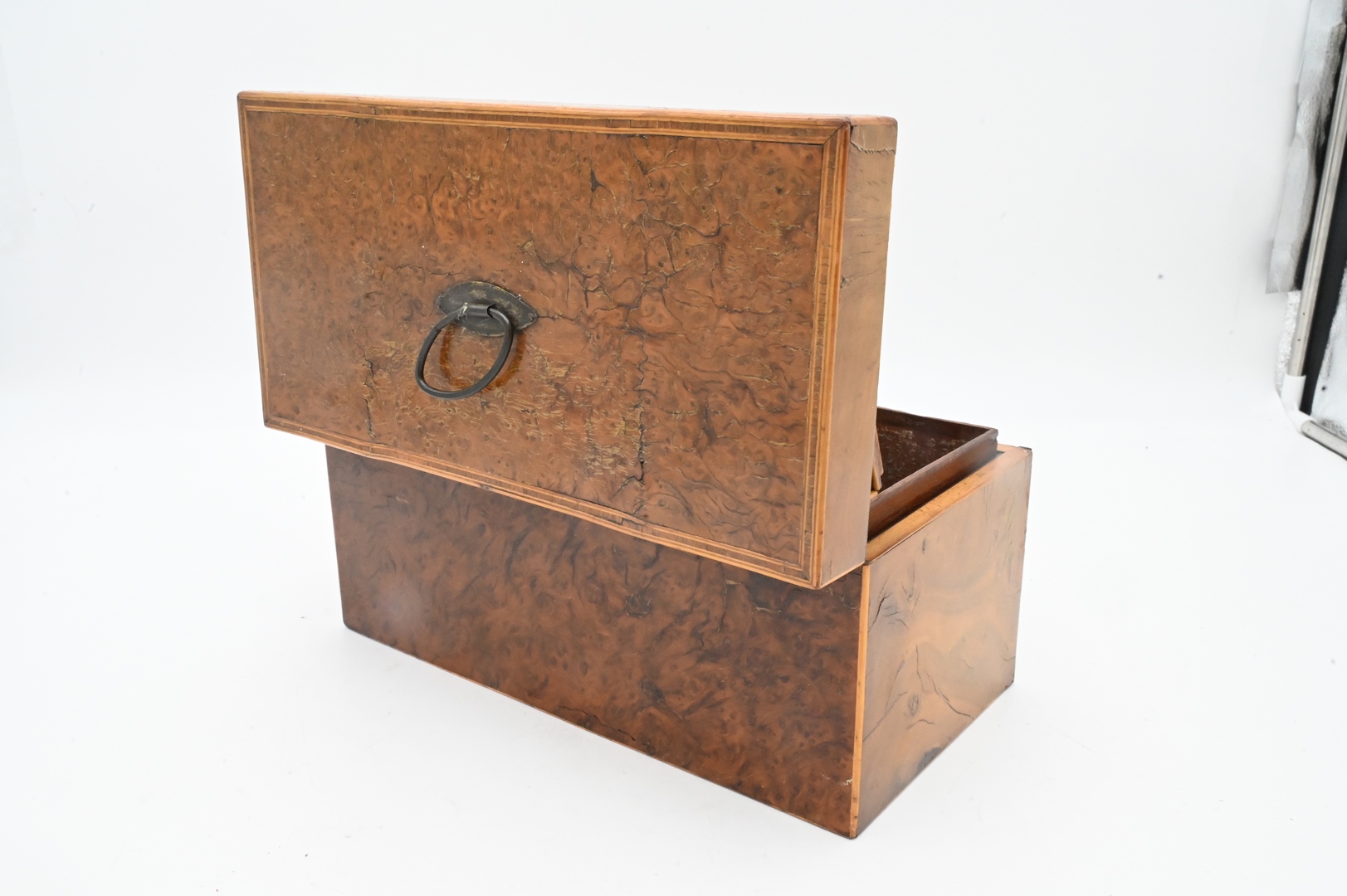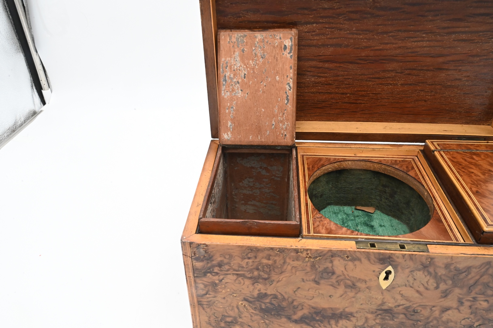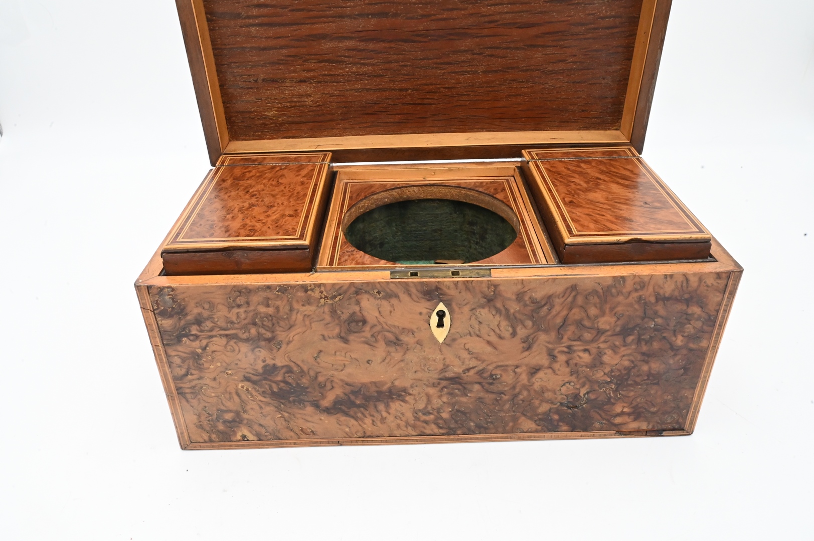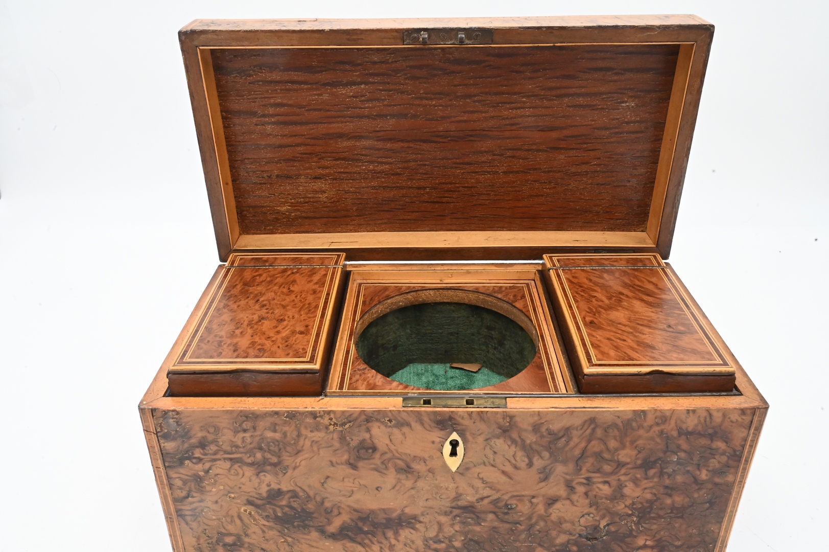 George III Burlwood Tea Caddy, having two interior boxes, height 6 inches, top 6″ x 12″.