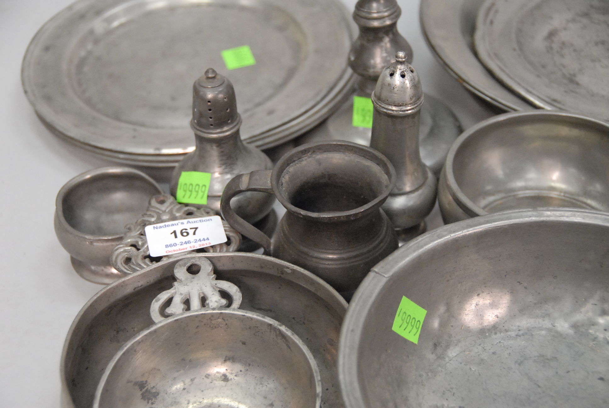 Lot 167: Group lot of pewter including twelve plates, two basins, two porringers, pair of candlesticks, etc.
