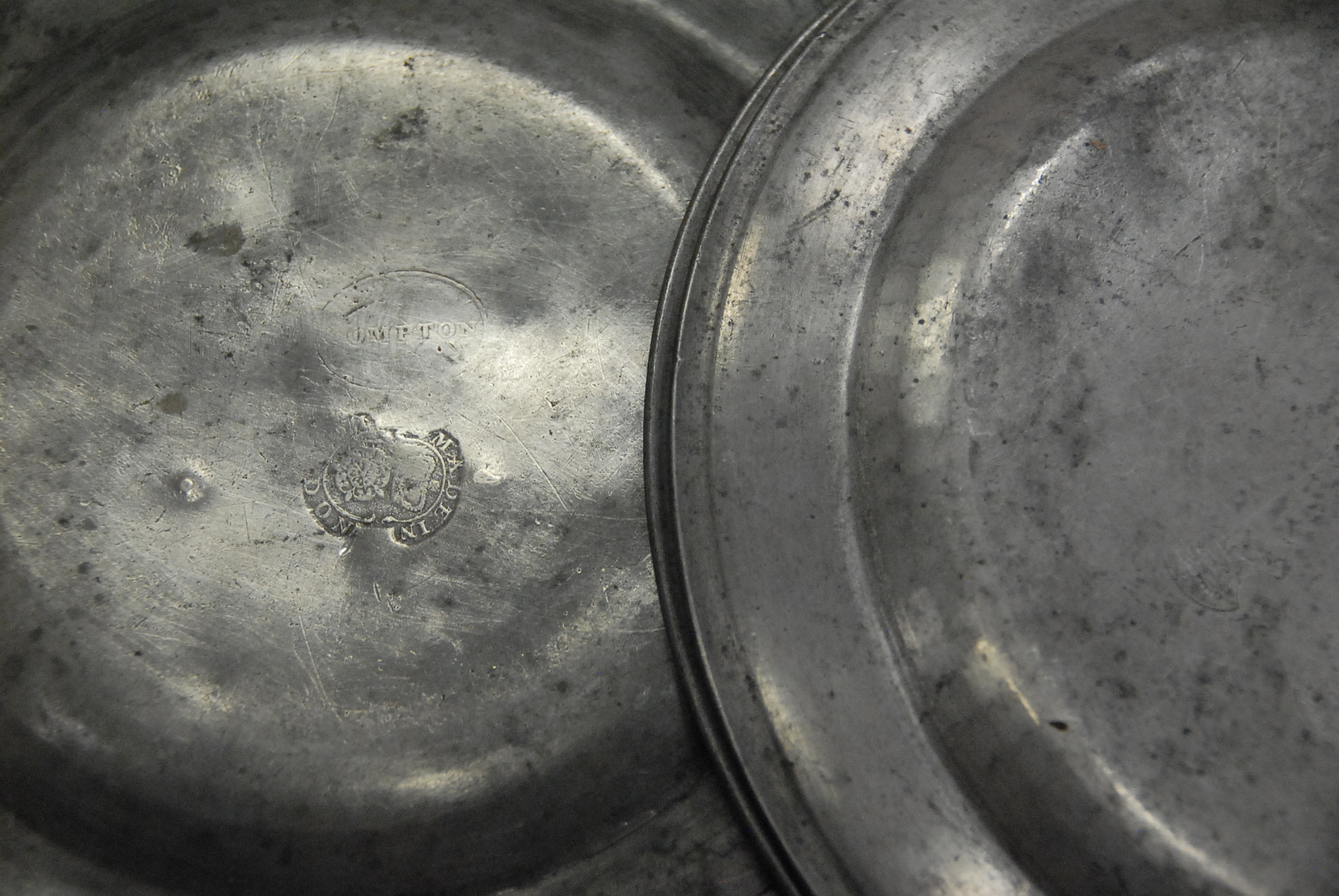Group lot of pewter including twelve plates, two basins, two porringers, pair of candlesticks, etc.