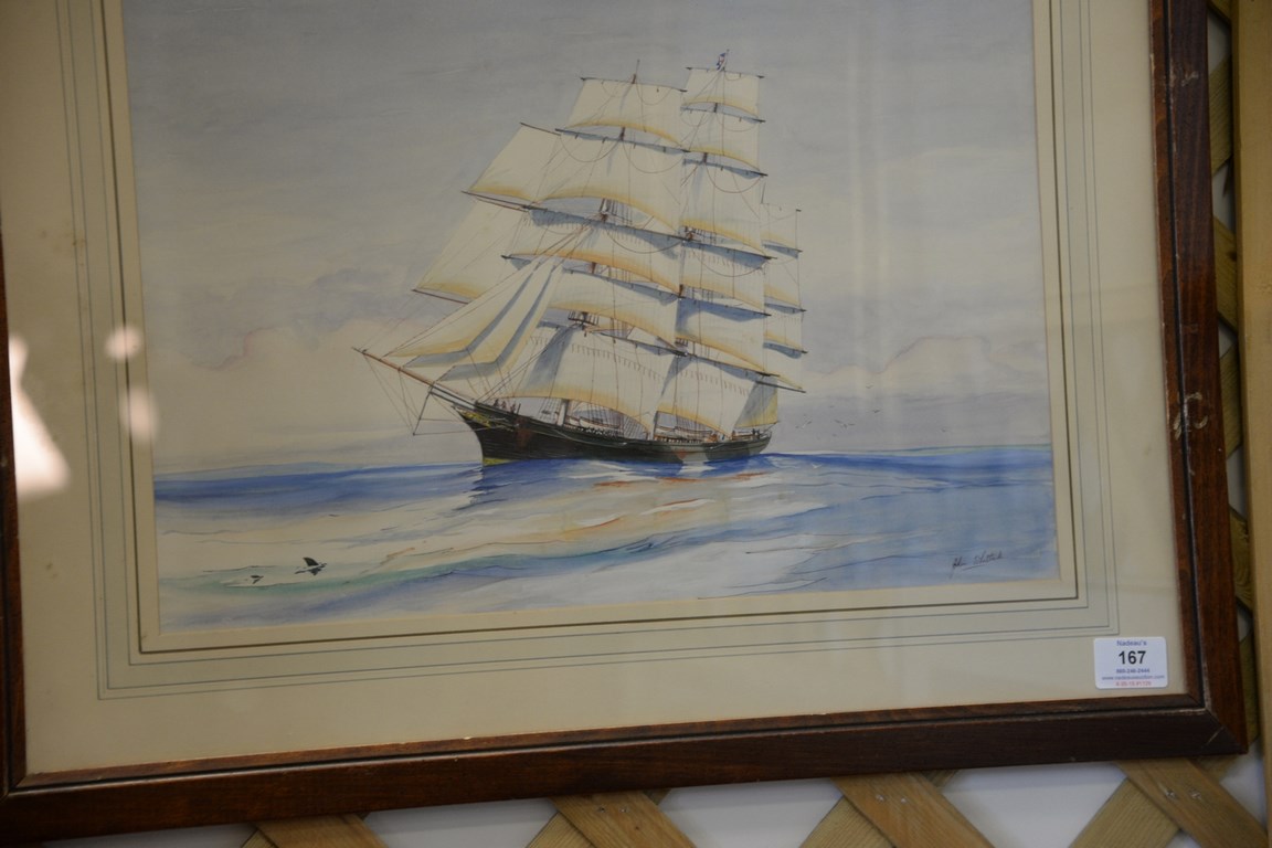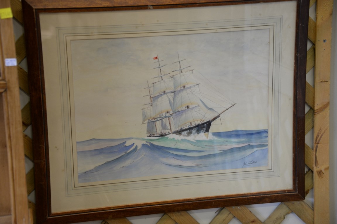Lot 167: John Whittock, pair of watercolors of ships James Baines and Cutty Sark, signed lower right John Whittock. sight size 13 x 18