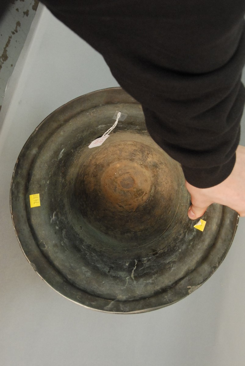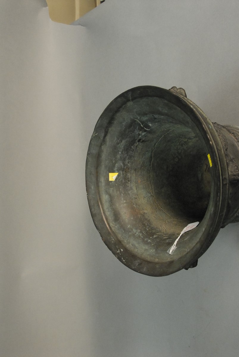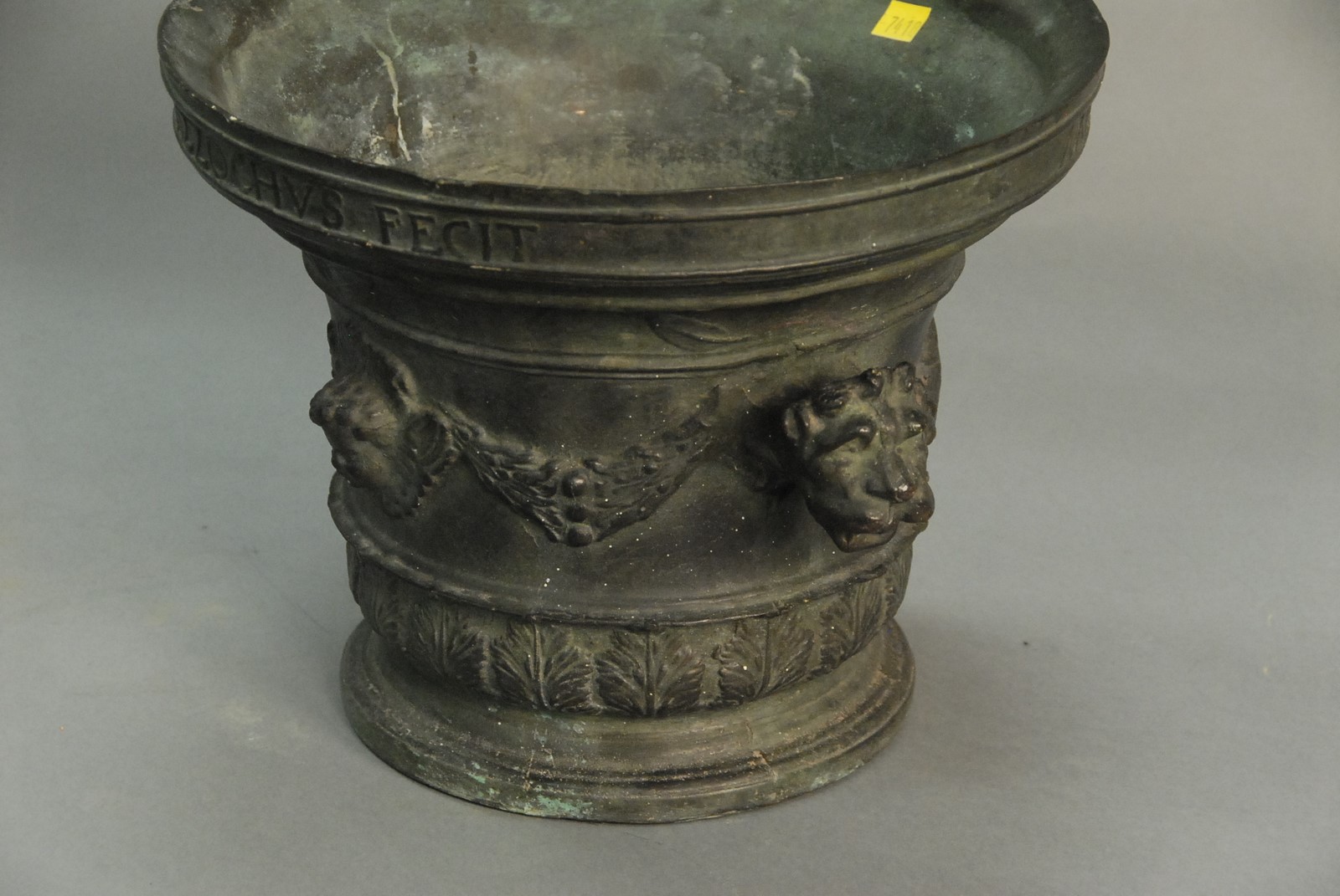 Lot 167: Large early bronze Renaissance/Baroque mortar having figural handles and cherub head mask, marked Georgius Mazzochus Fecit Anno MDCCXXI 1721. ht. 10 1/2 in. dia. 13 1/2 in.