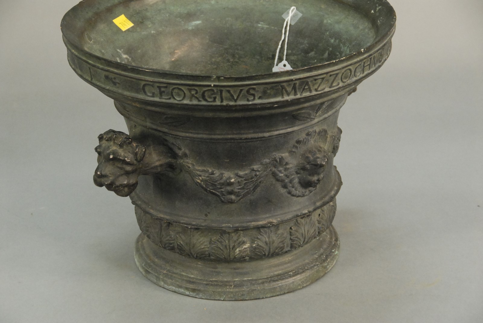 Large early bronze Renaissance/Baroque mortar having figural handles and cherub head mask, marked Georgius Mazzochus Fecit Anno MDCCXXI 1721. ht. 10 1/2 in. dia. 13 1/2 in.
