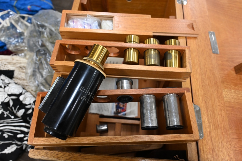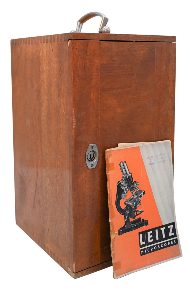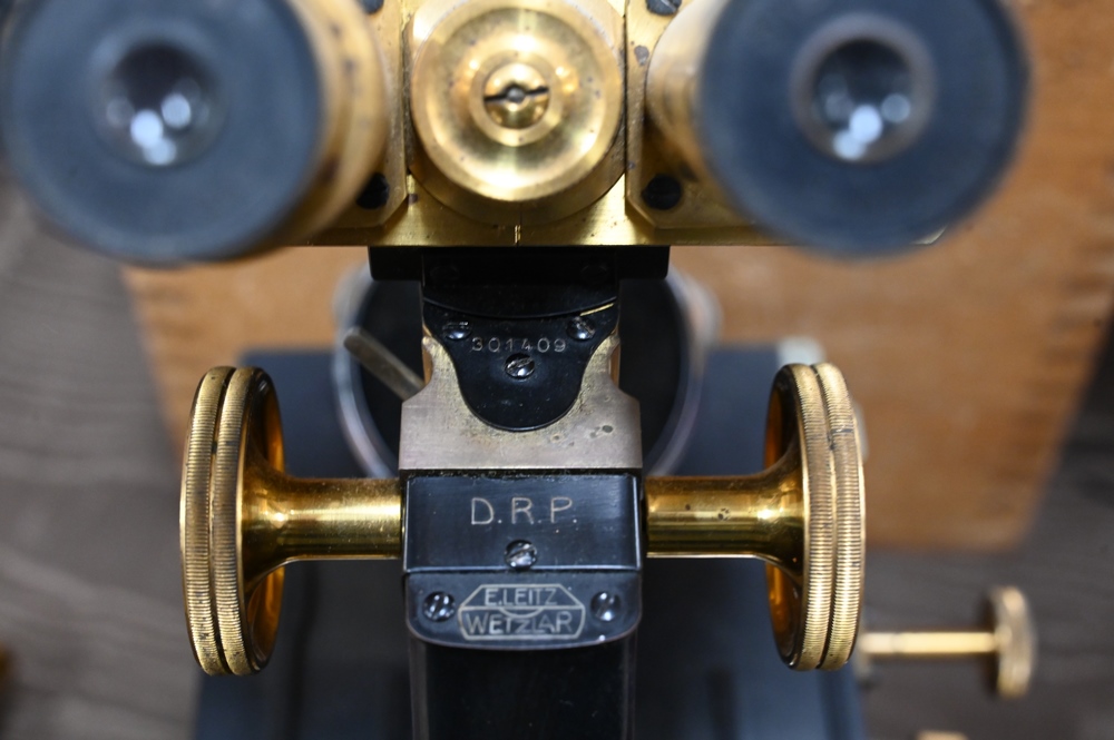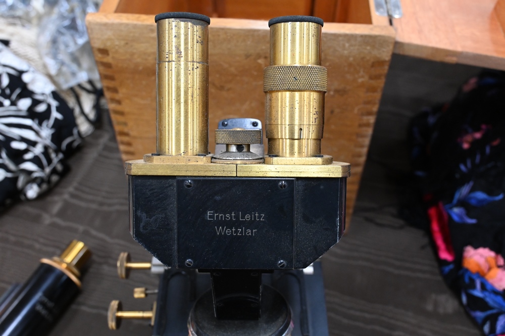 Lot 167: Leitz Microscope, to include original fitted wood box, several lenses, original pamphlet, brass and steel mounted.