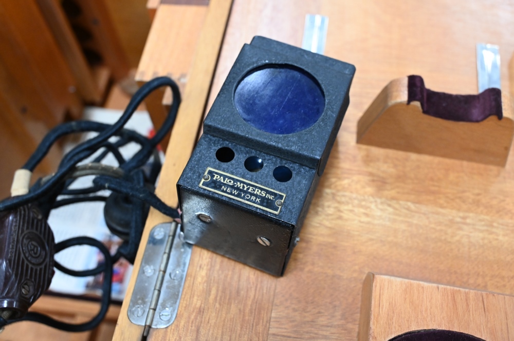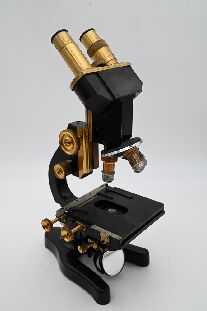 Leitz Microscope, to include original fitted wood box, several lenses, original pamphlet, brass and steel mounted.