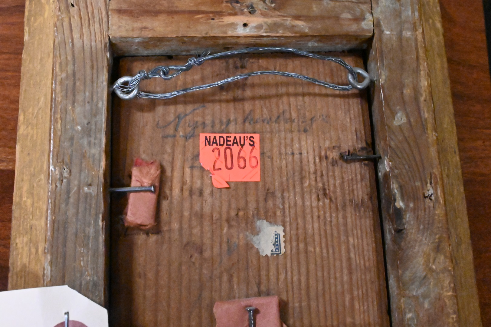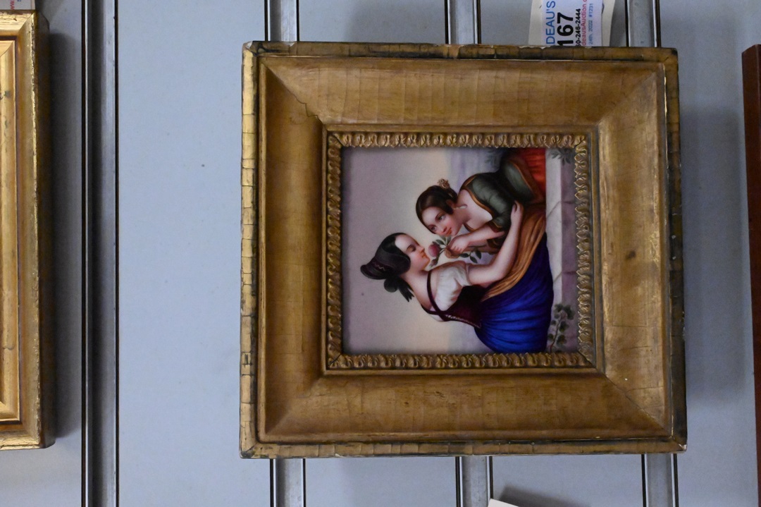 Nymphenburg Porcelain Framed Plaque, depicting two women by a stone wall, painting on German porcelain, plaque 4″ x 3 1/2″, frame 6 1/2″ x 6″.