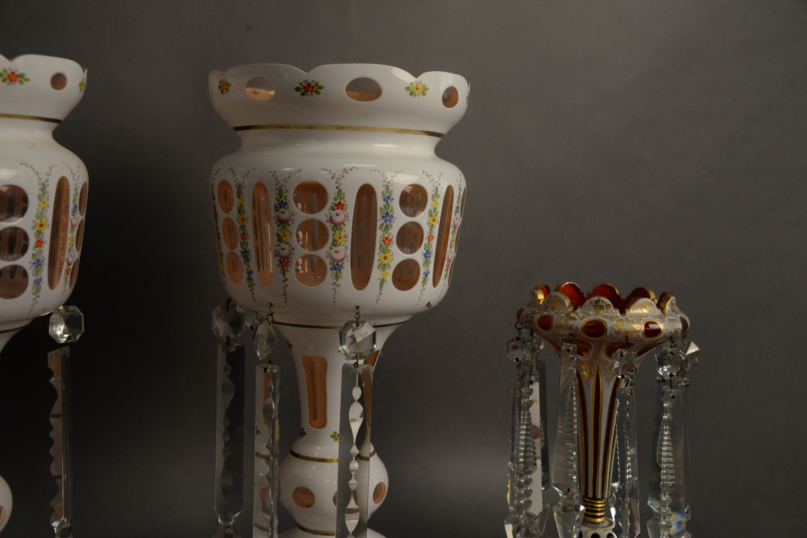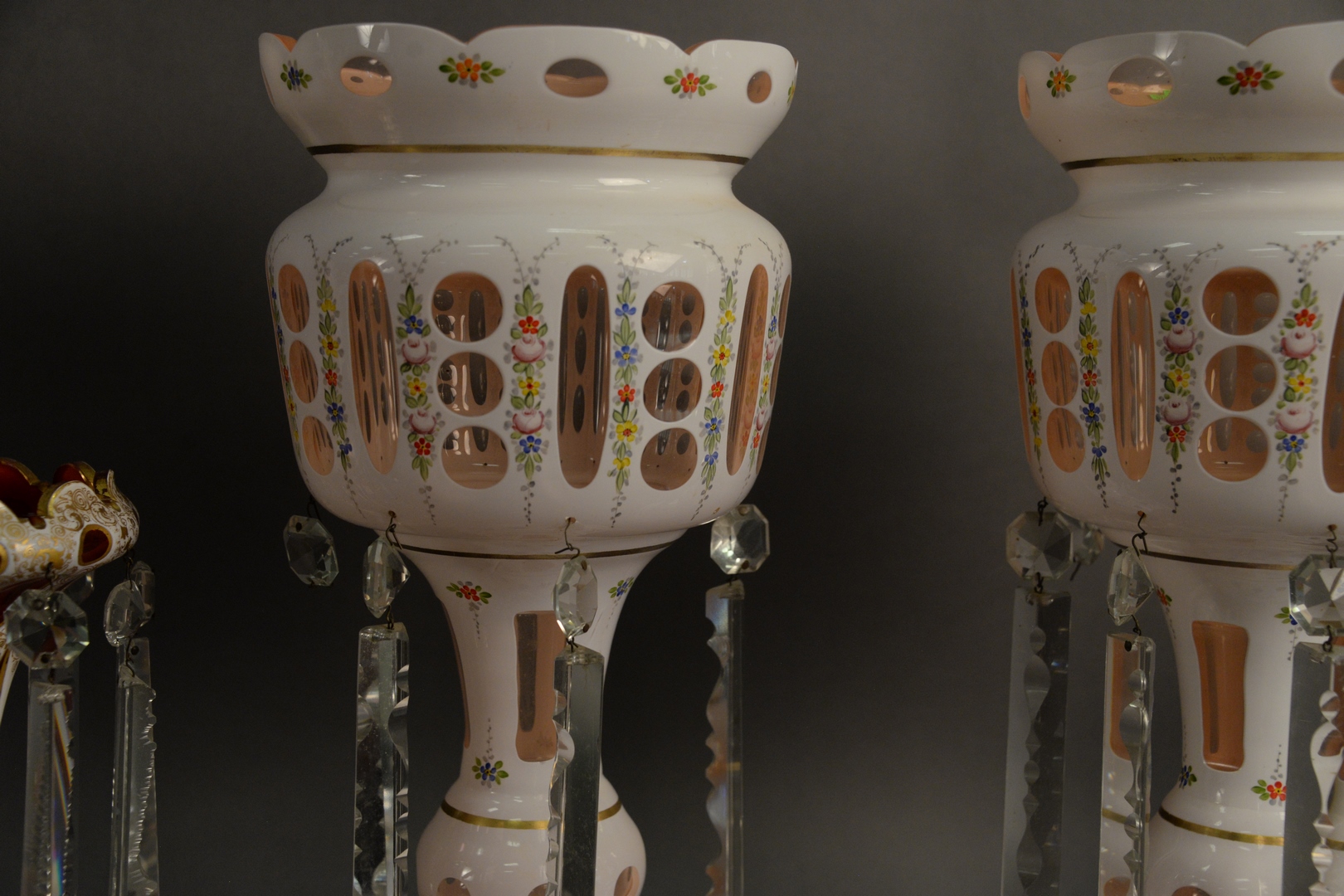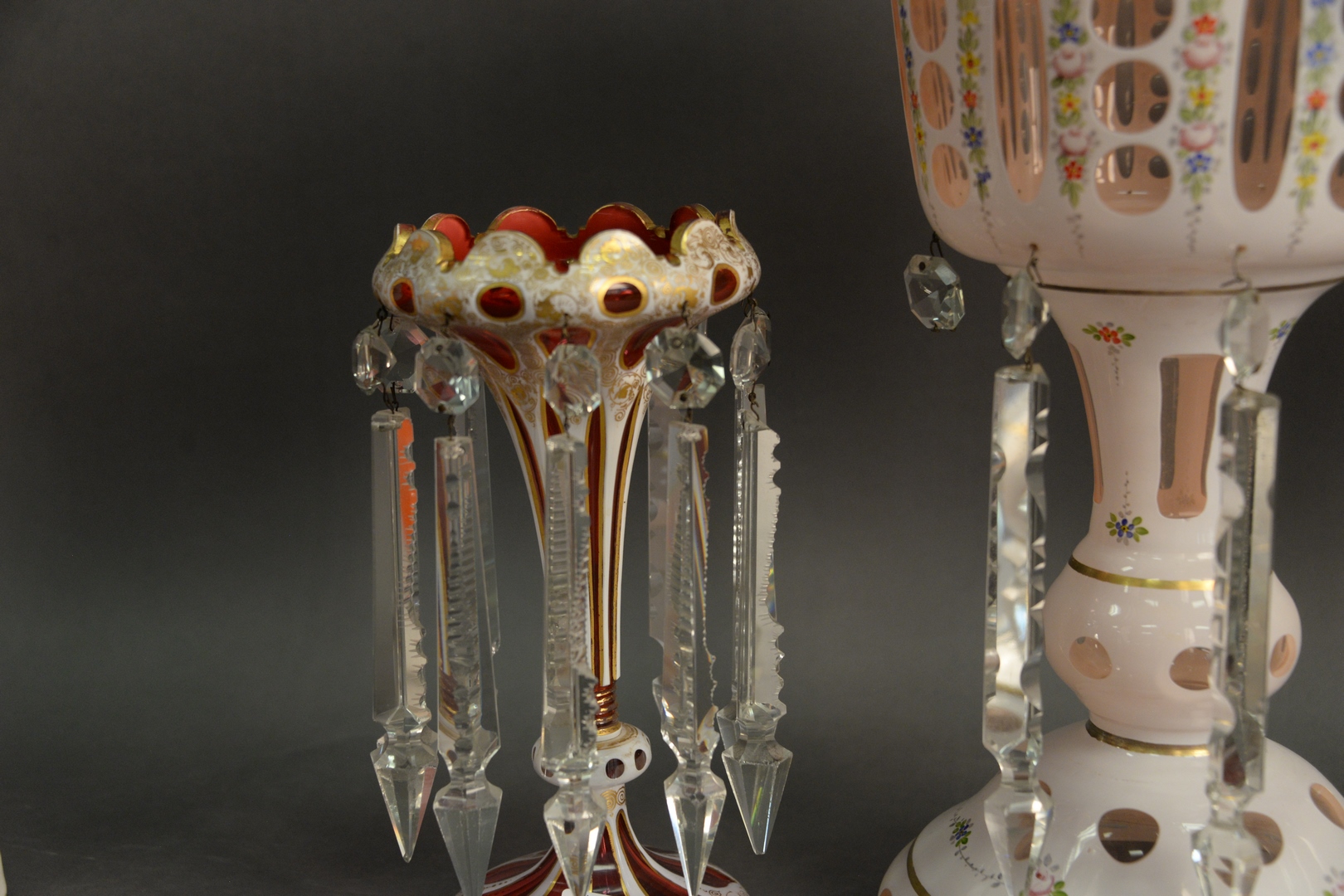 Pair of Overlay and Enameled Ruby Glass Lusters, having trumpet form and gilt lusters, highlights throughout, having 10 prisms each, height 11 inches along with pair of overlay glass lusters, pink with white overlay, height 17 1/4 inches. Provenance: Estate of James Wadhams.