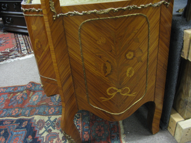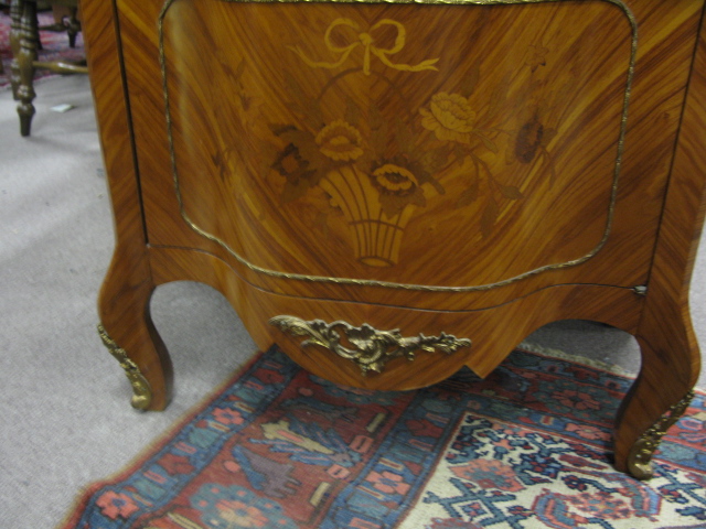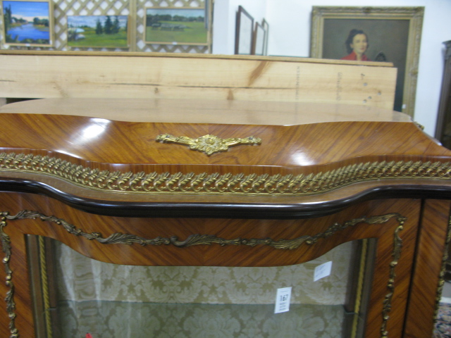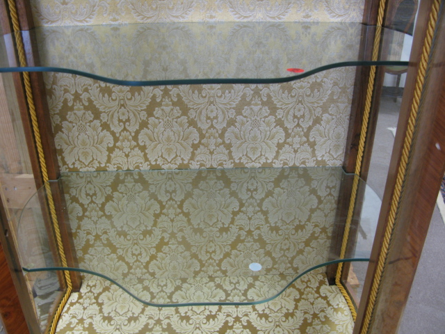 Reproduction French style curio cabinet with glass shelves, bowed glass