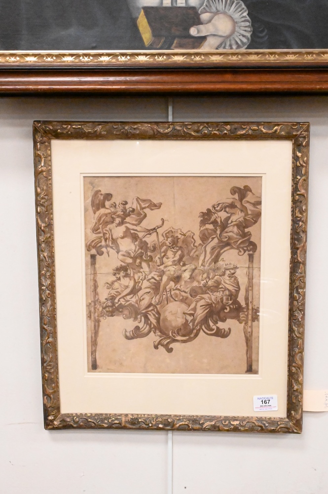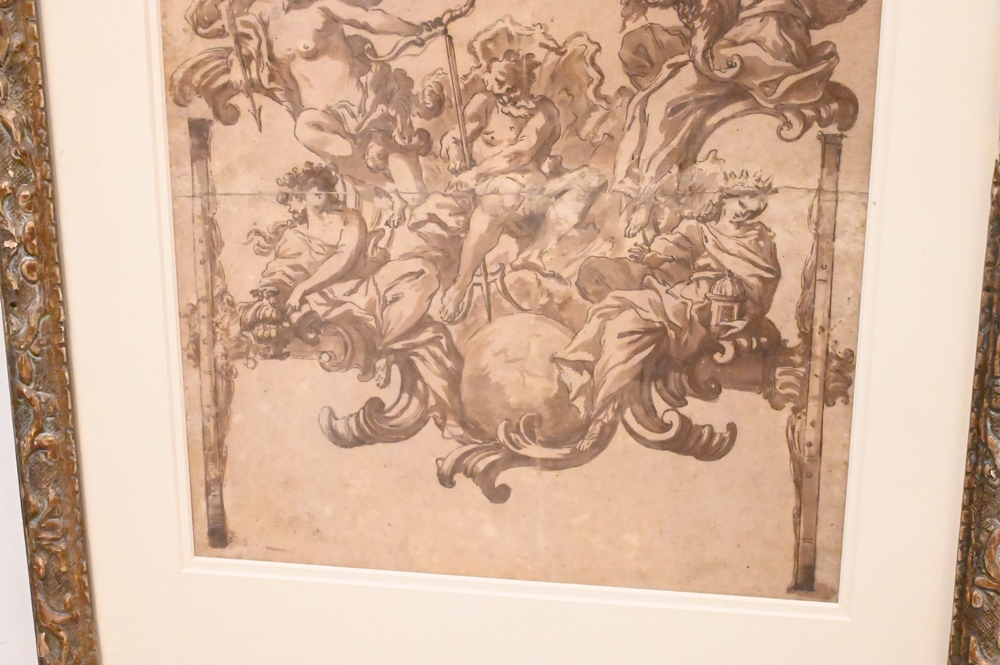 Lot 167: Roman School, 17th century or later, design for the rear of a carriage with Neptune and personifications of the four continents; pen, brown ink and wash on tan paper, 12 5/8″ x 11 1/2″. Provenance: Purchased Sotheby’s, New York, January 26, 2000, Lot 67, for $7,475, receipt on back. Estate of Wallace Bradway, New Haven, CT.