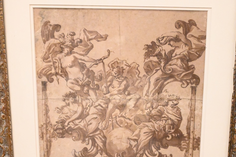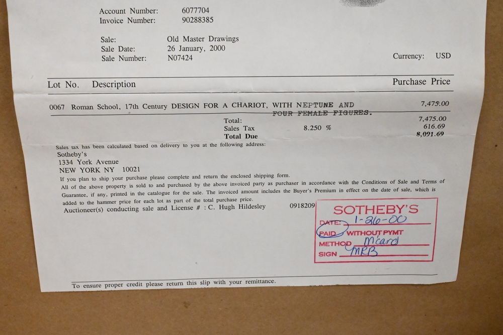 Roman School, 17th century or later, design for the rear of a carriage with Neptune and personifications of the four continents; pen, brown ink and wash on tan paper, 12 5/8″ x 11 1/2″. Provenance: Purchased Sotheby’s, New York, January 26, 2000, Lot 67, for $7,475, receipt on back. Estate of Wallace Bradway, New Haven, CT.