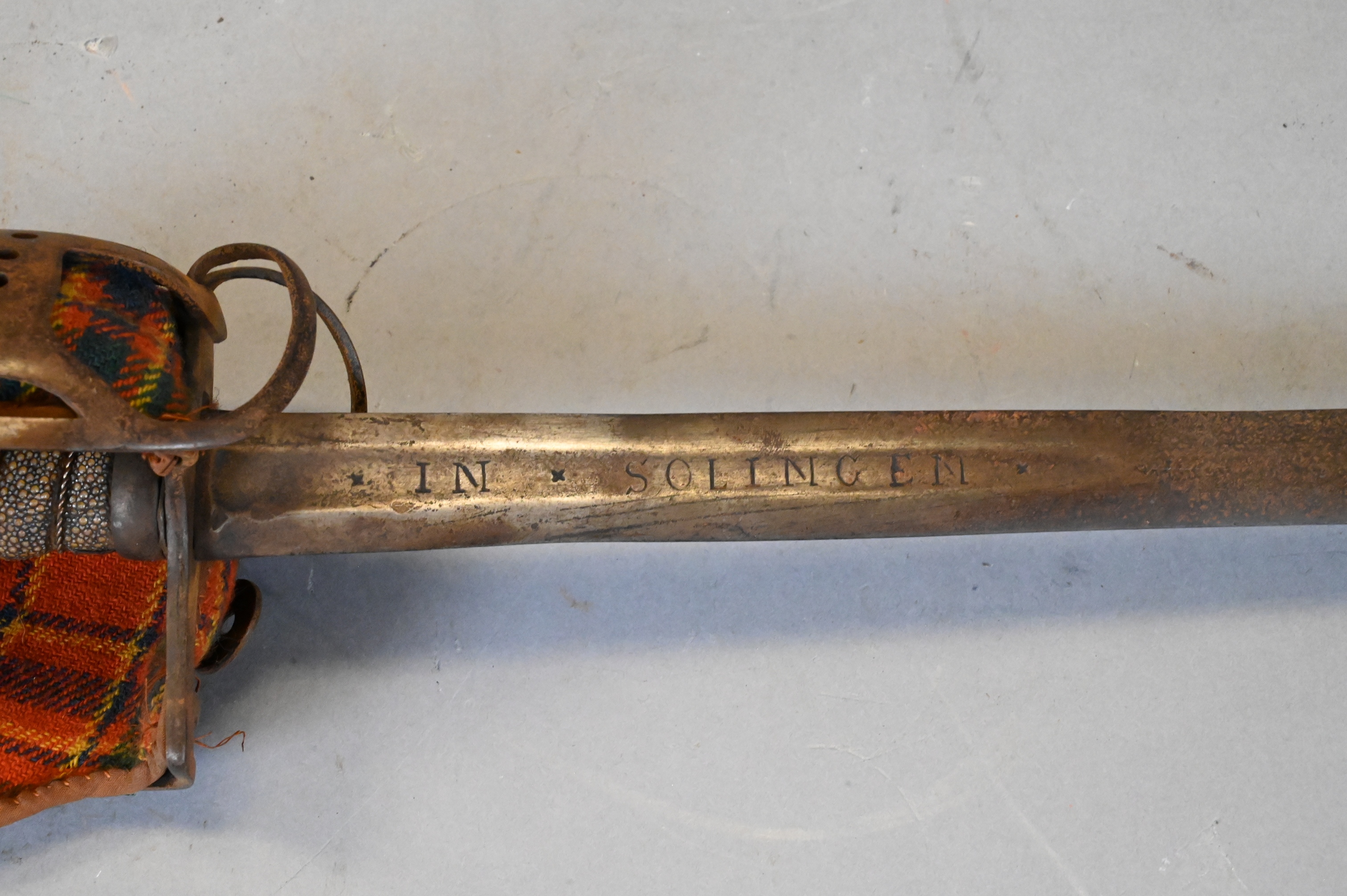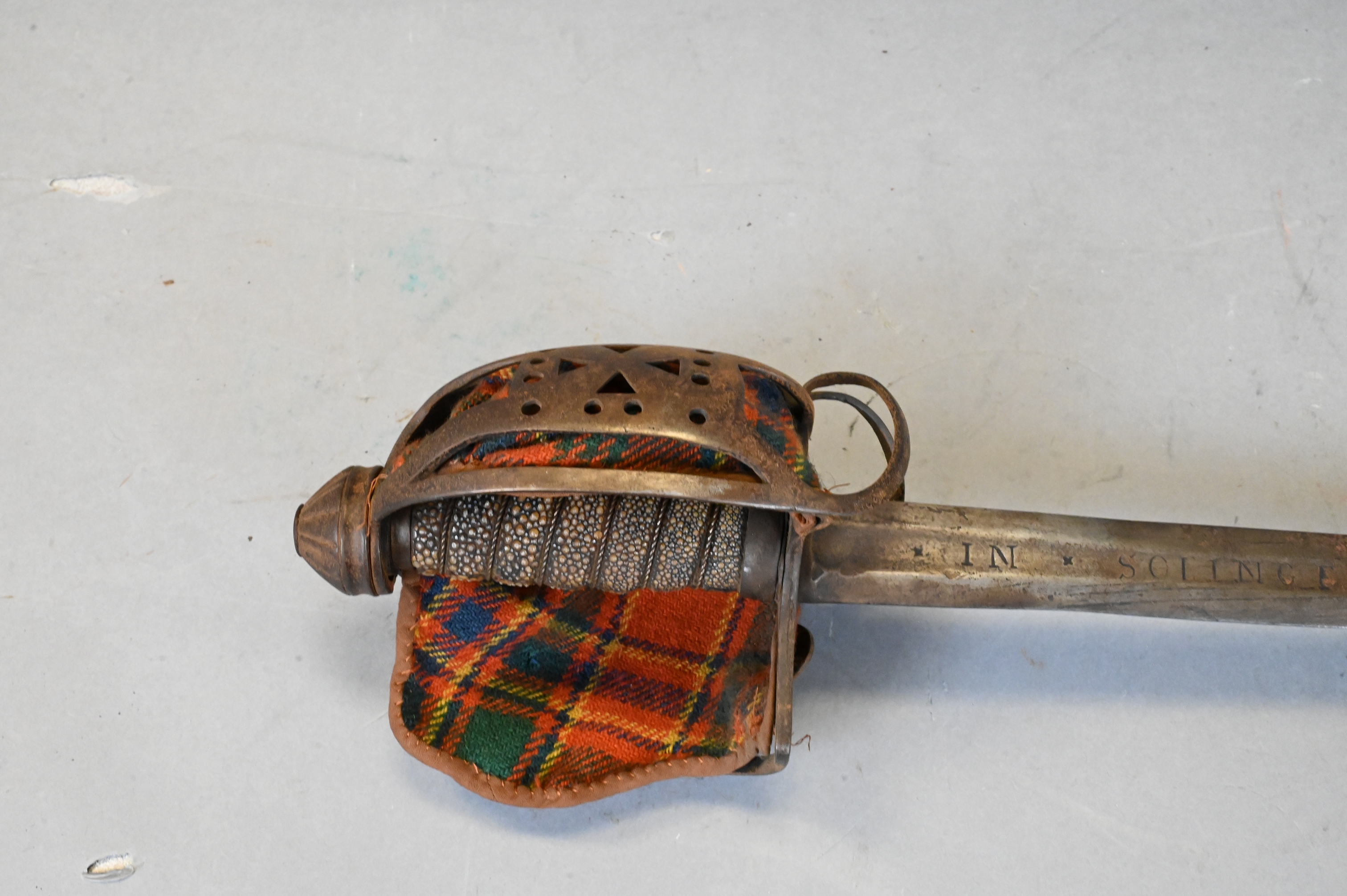 A Scottish basket-hilt broadsword, the iron guard with pierced panels lined in tartan cloth, the double-edged blade inscribed “ABRAHAM STAMM” (faint).