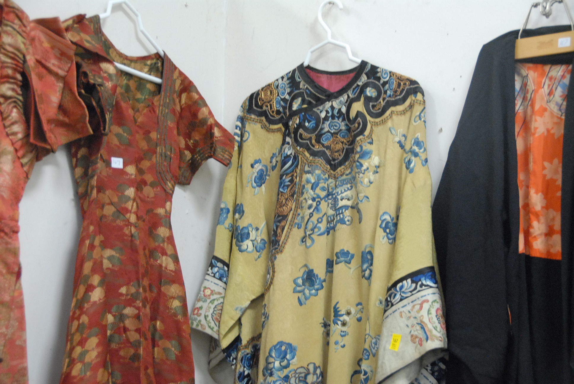 Six piece lot including embroidered kimono, black kimono, Oriental jacket, two Oriental full length dresses, and an Oriental scroll.