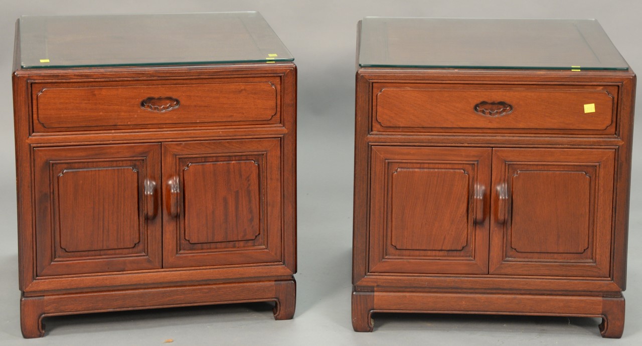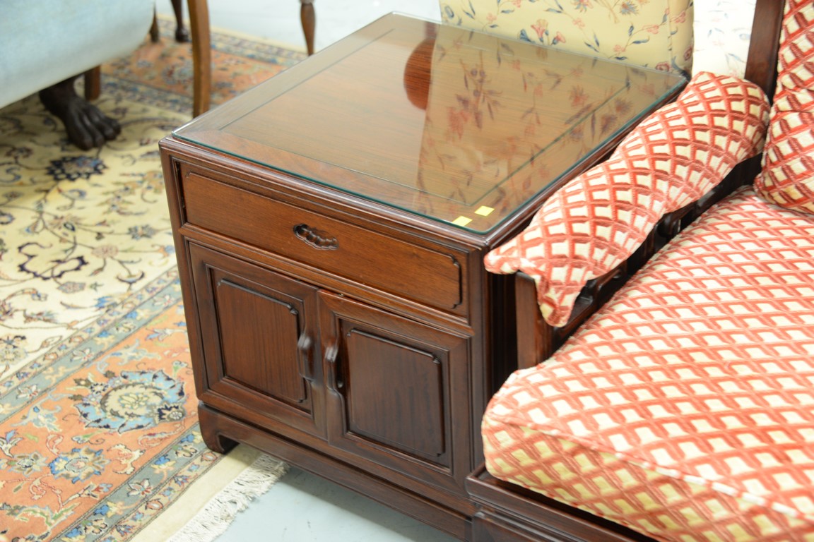 Three Chinese tables including a coffee table and two side tables with drawers and doors. coffee table: ht. 16 in. top: 27 1/2 x 15, side tables: ht. 22 in. top: 22 x 22