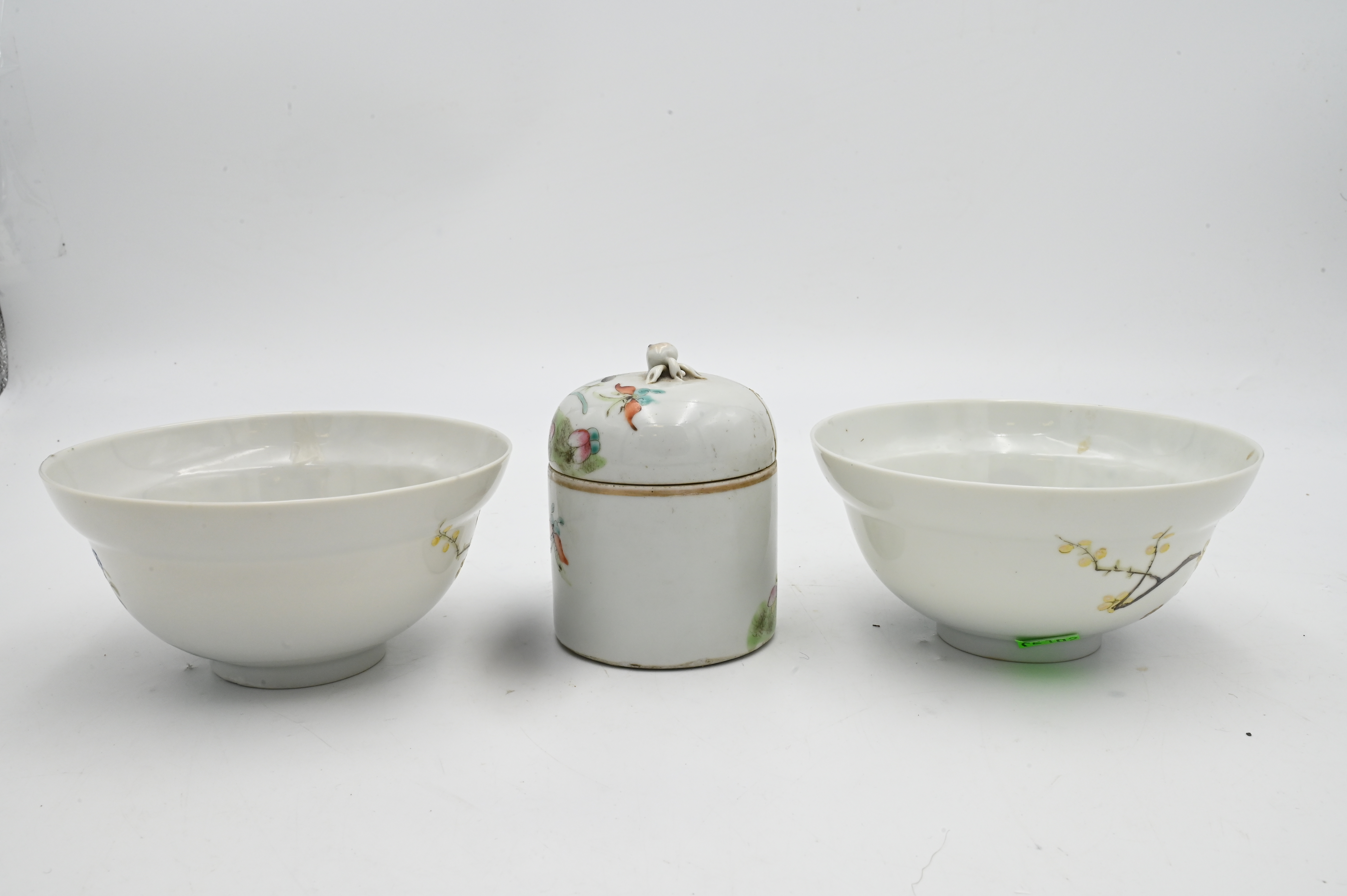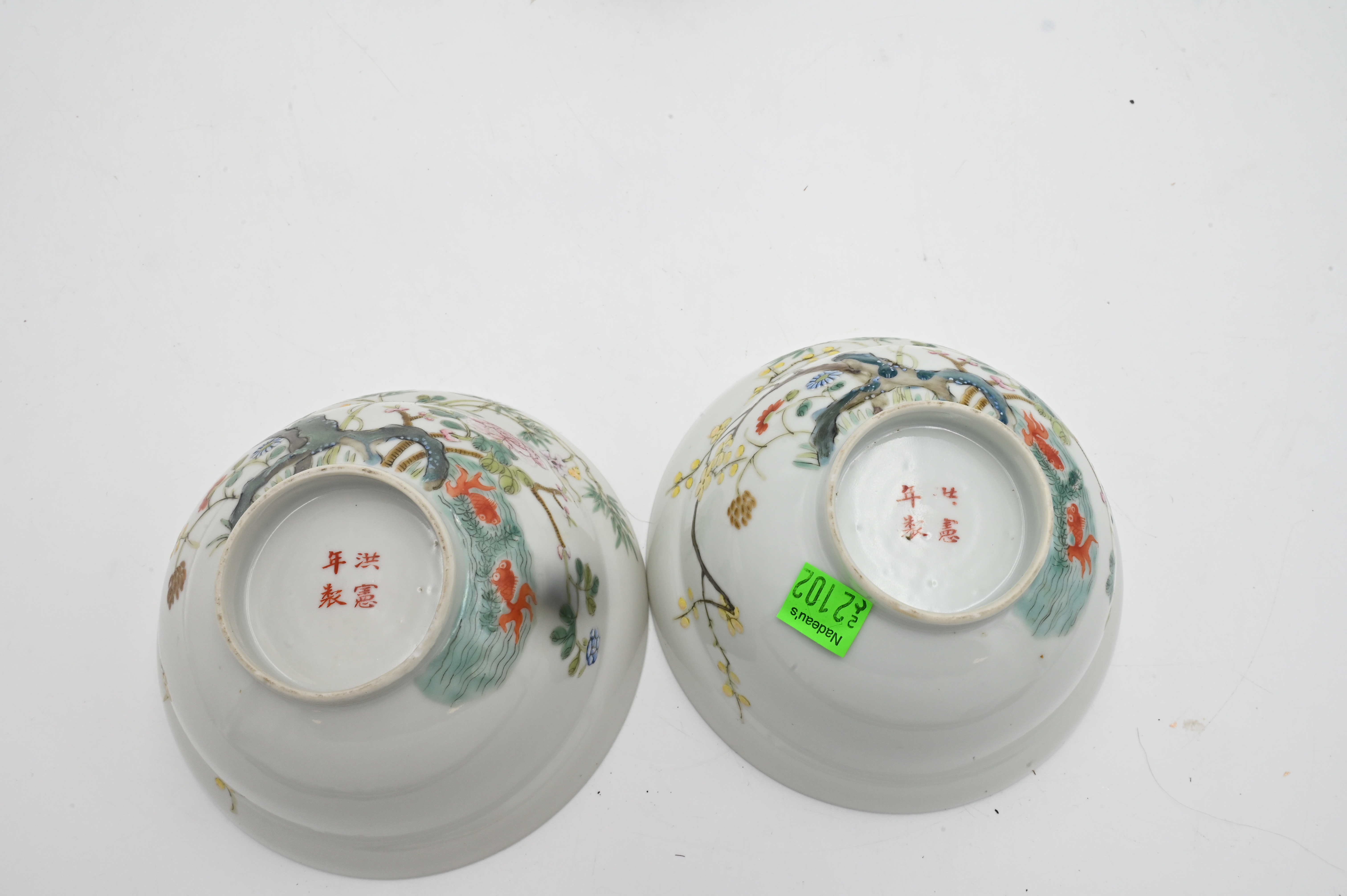 two bowls with enameled & painted trees, lotus flowers & koi fish