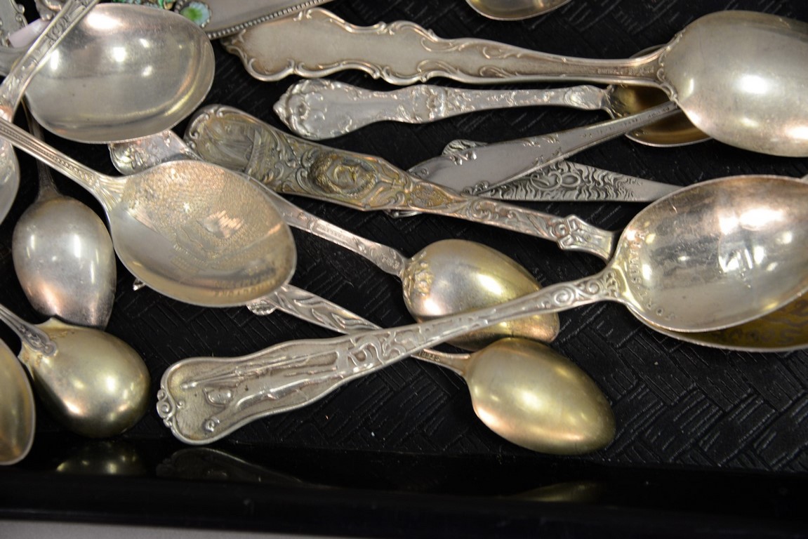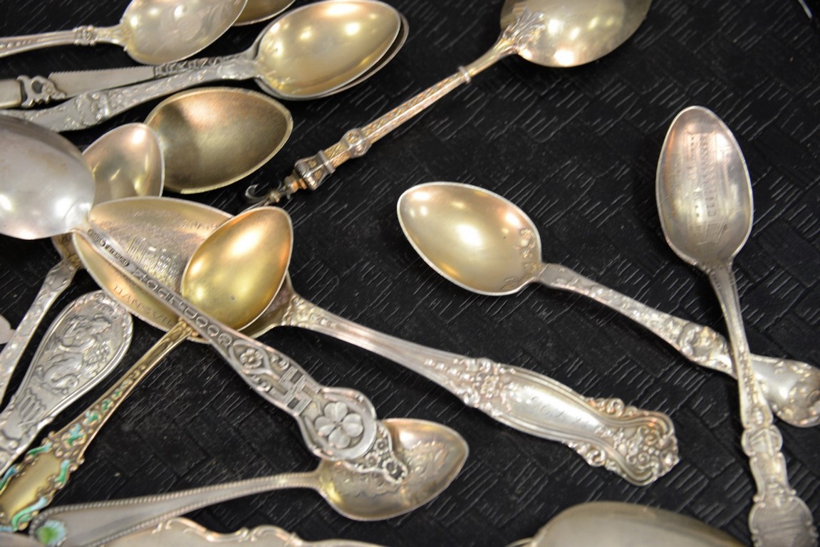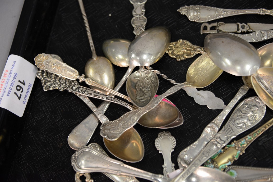 Lot 167: Tray lot of sterling demitasse spoons, State and City spoons, etc. 13.9 t oz.