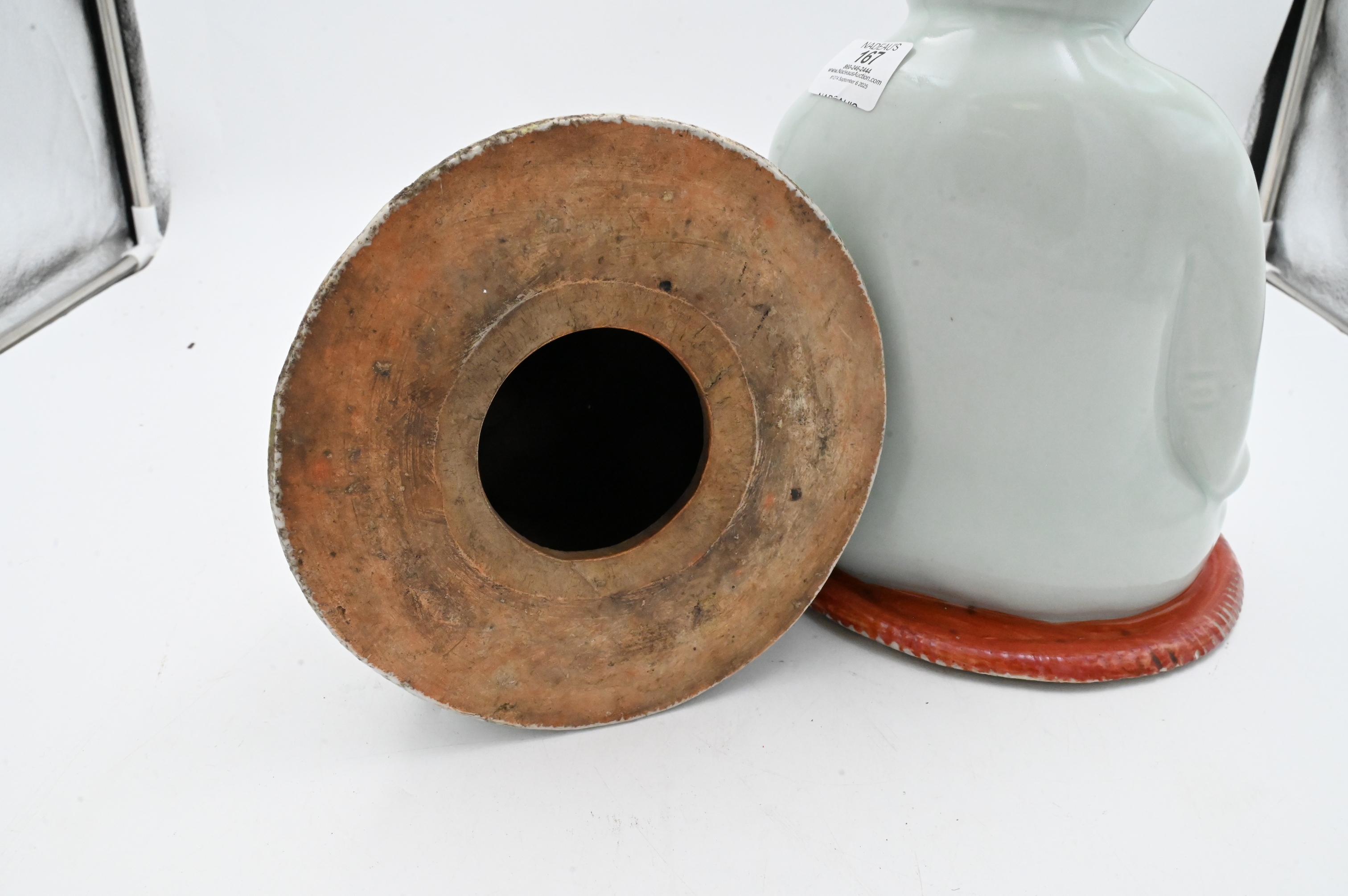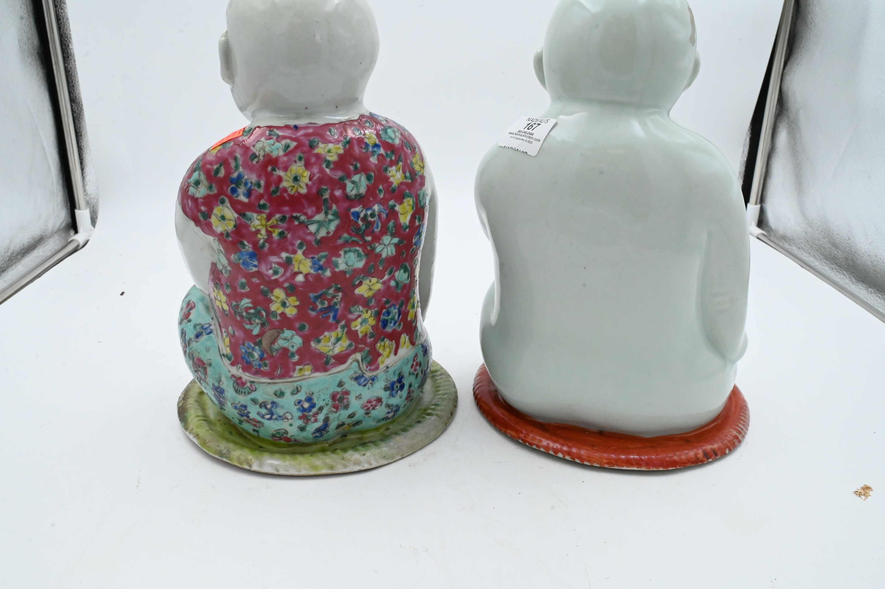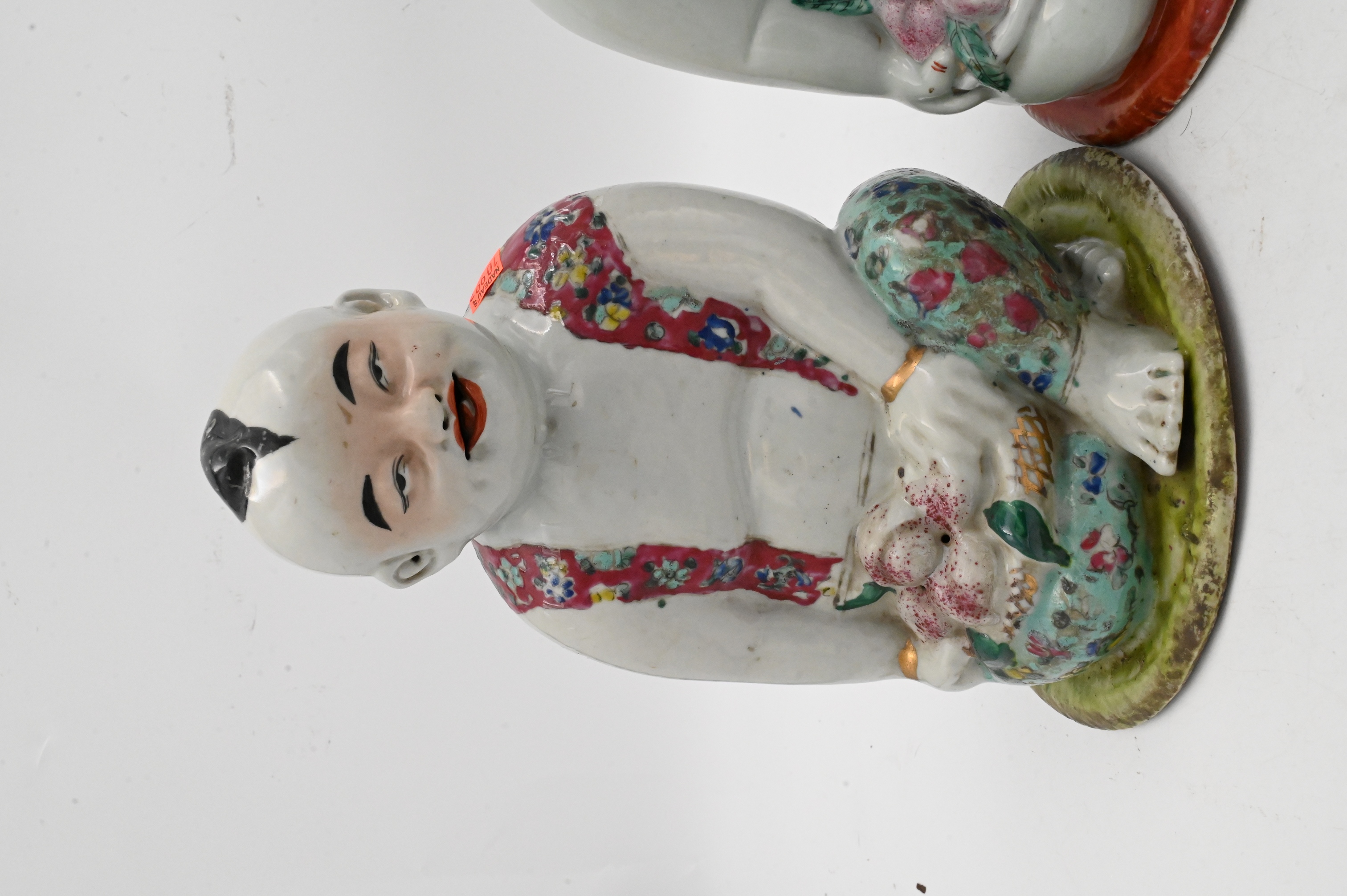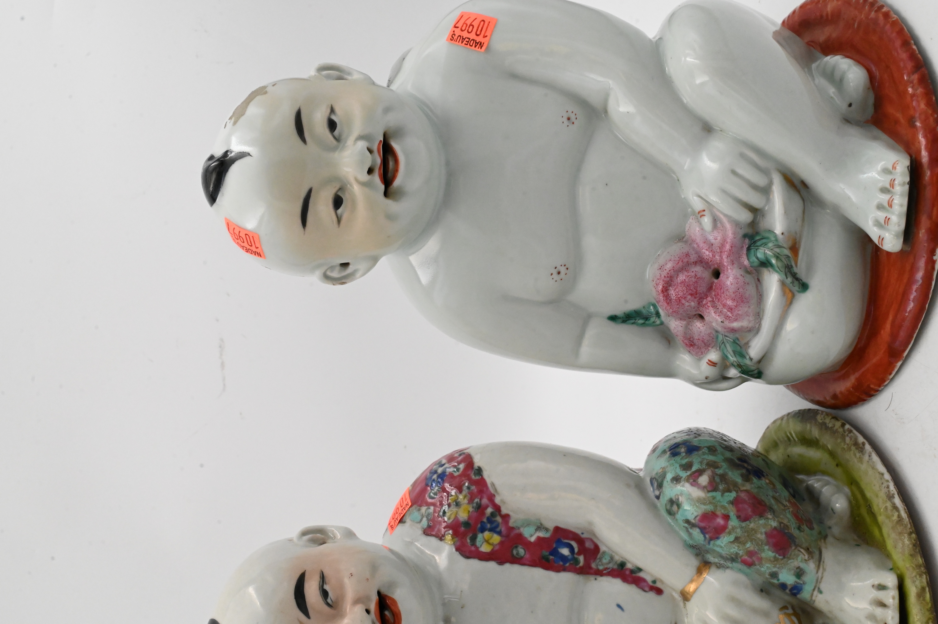 both seated holding a bowl of peaches, one boy in painted enamel vest and pants