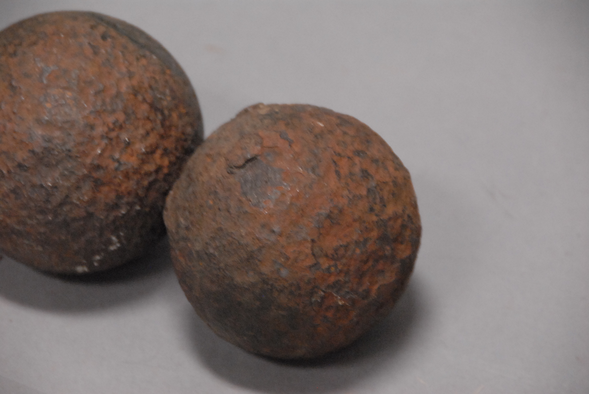 Two large cast iron cannonballs, dia. 3 1/2 to 4.
