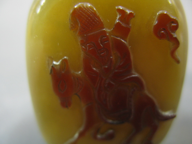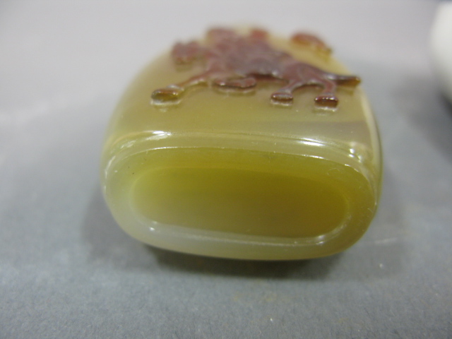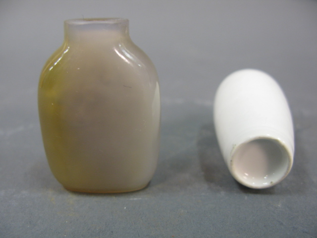 Two snuff bottles one carved agate and one white Oriental porcelain.
